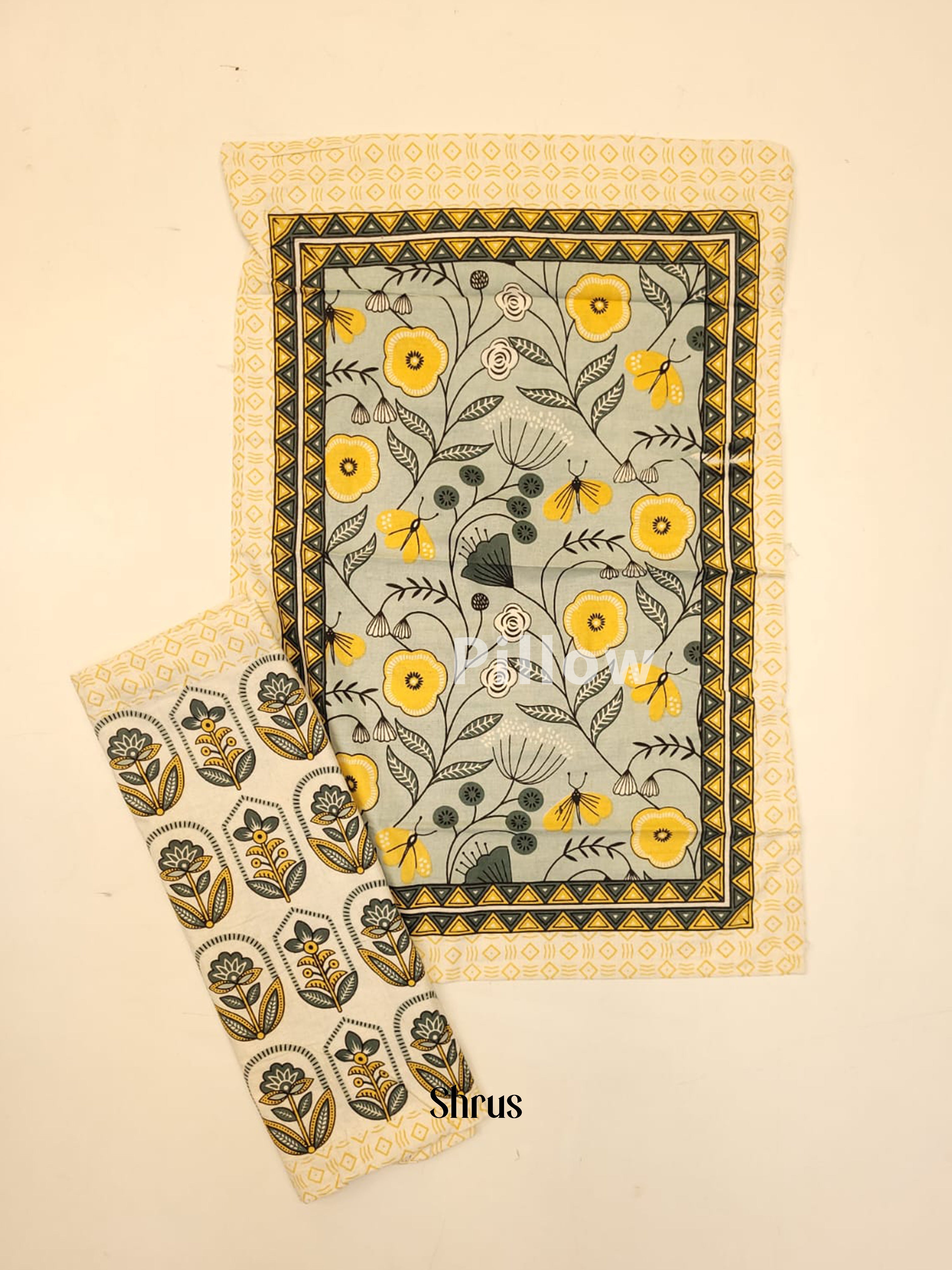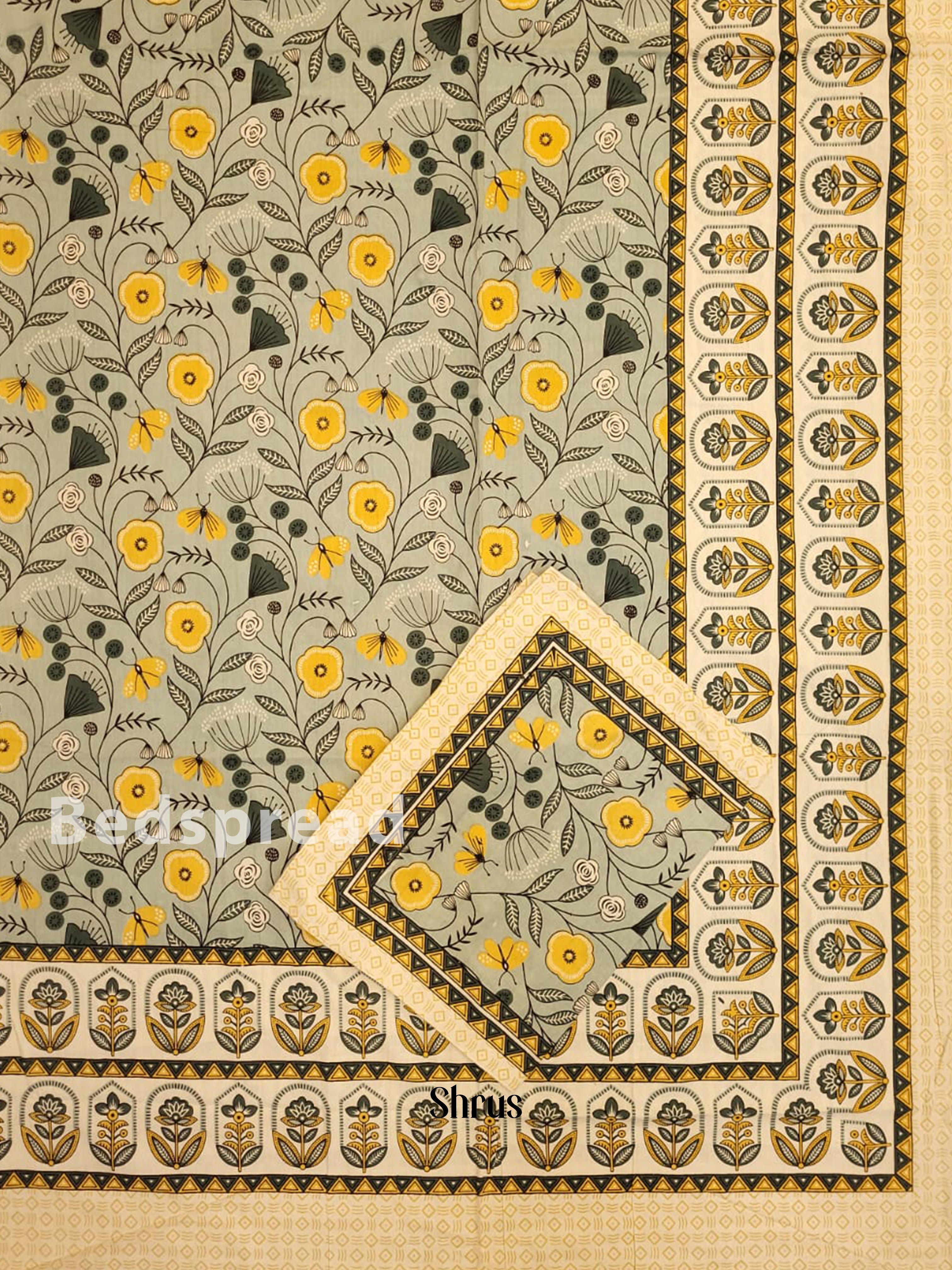 Transform your bedroom into a haven of luxury and sophistication with our Jaipuri Printed Bedspread in Grey & yellow. This set includes a bedspread and two pillow covers, all made from premium cotton material. Featuring exquisite floral patterns and lively shades, it offers both stunning design and unparalleled comfort, providing the ideal environment for a restful sleep.