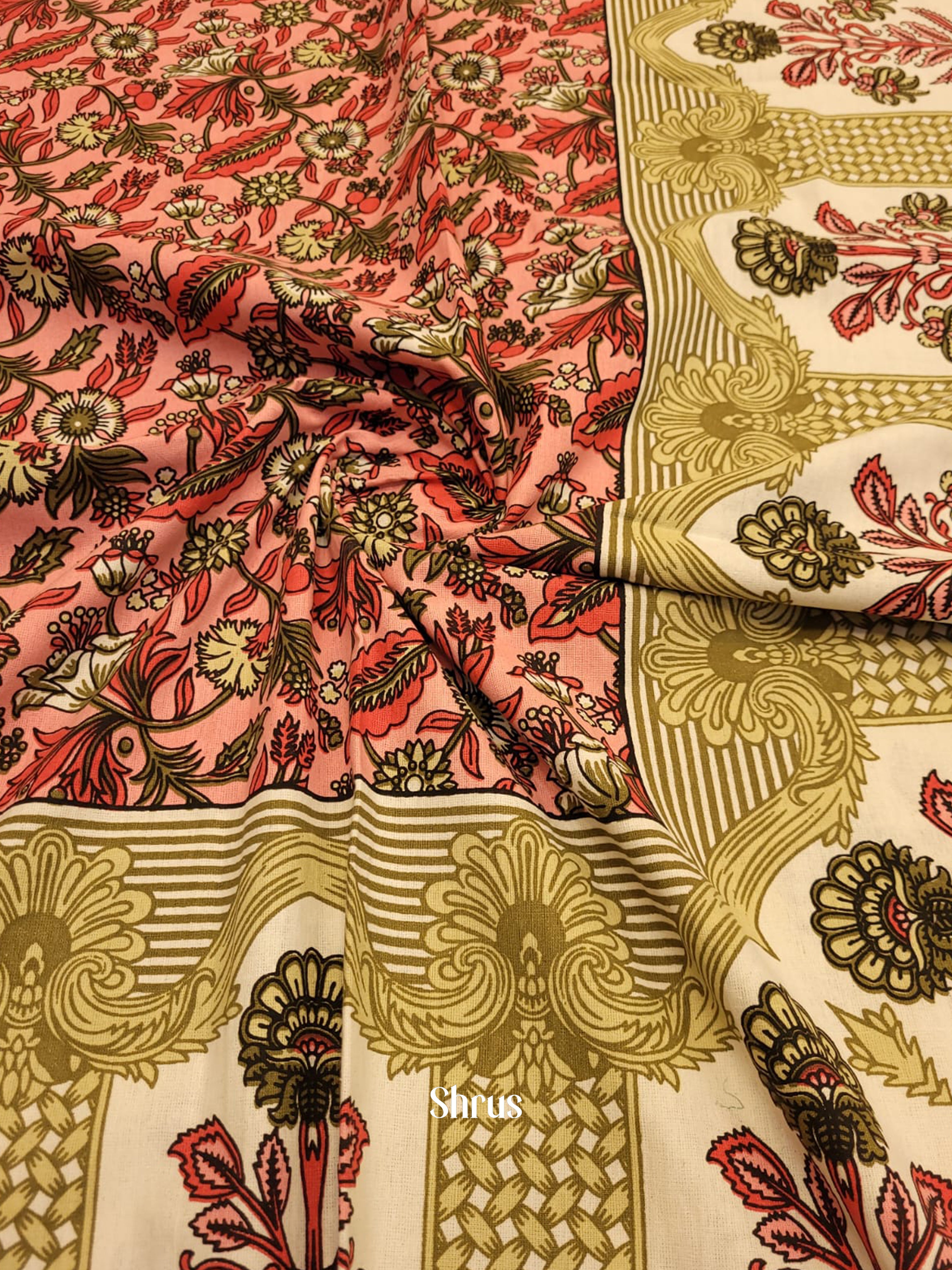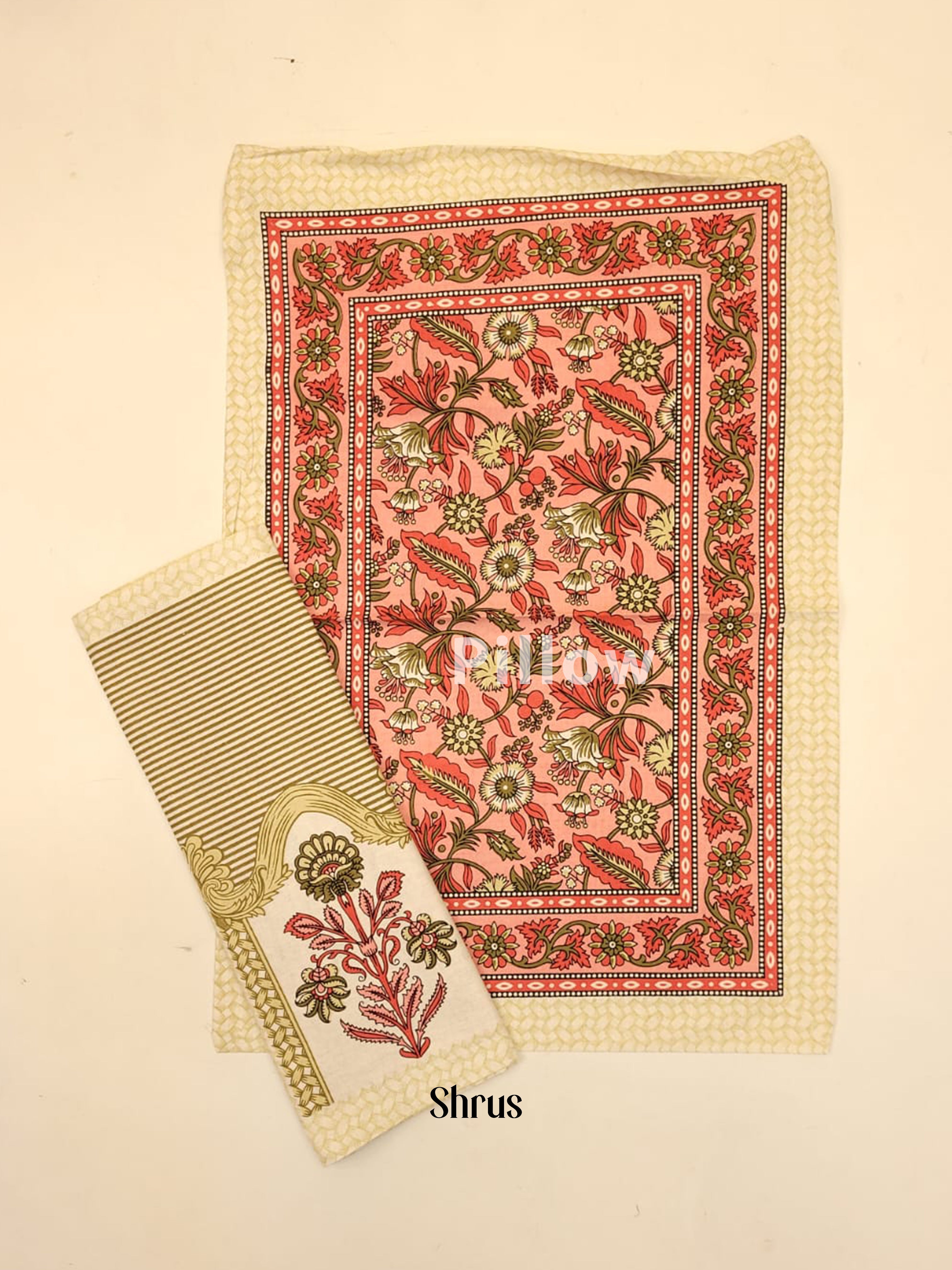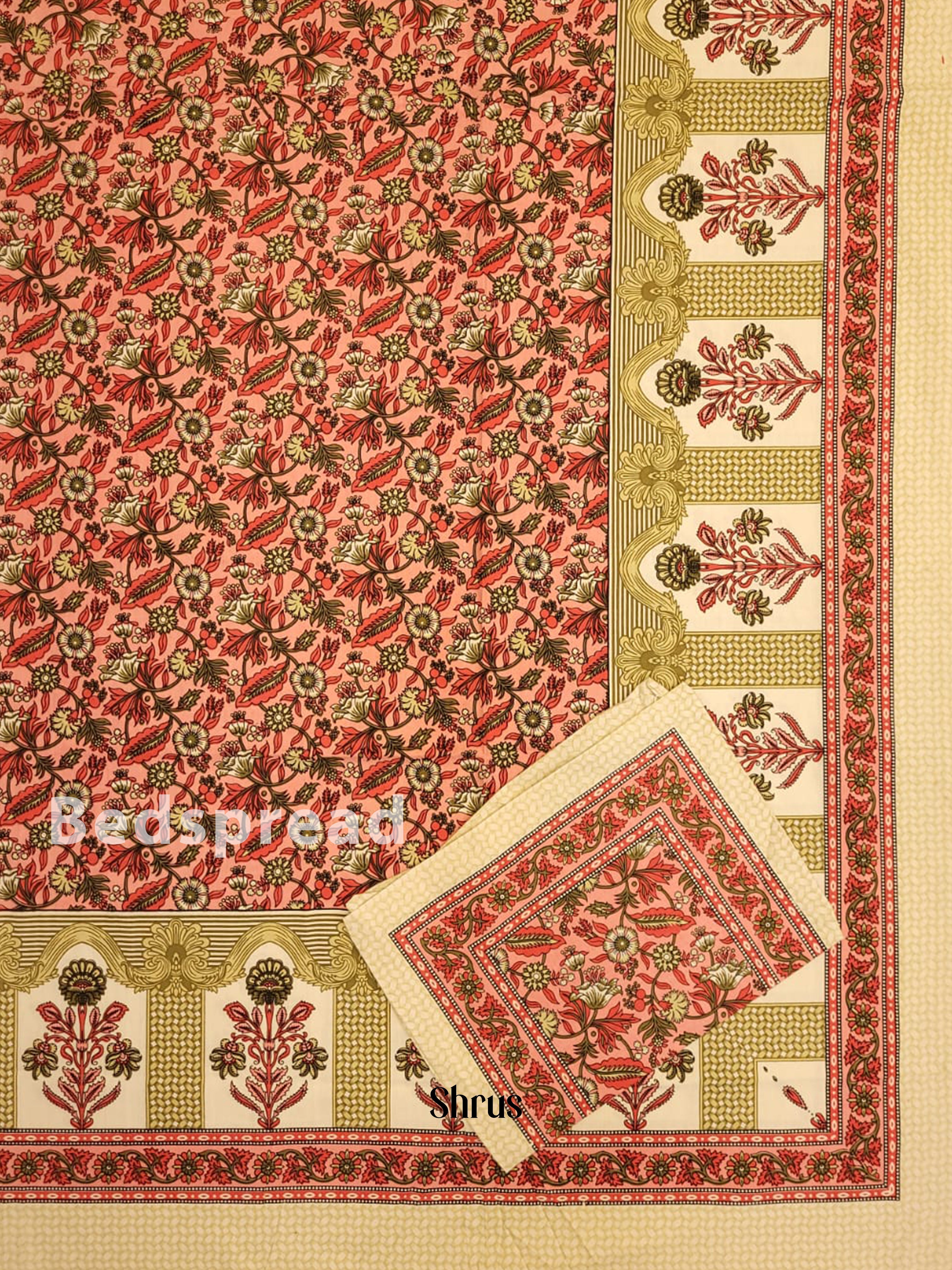 Transform your bedroom into a haven of luxury and sophistication with our Jaipuri Printed Bedspread in Green & Peachish Pink. This set includes a bedspread and two pillow covers, all made from premium cotton material. Featuring exquisite floral patterns and lively shades, it offers both stunning design and unparalleled comfort, providing the ideal environment for a restful sleep.