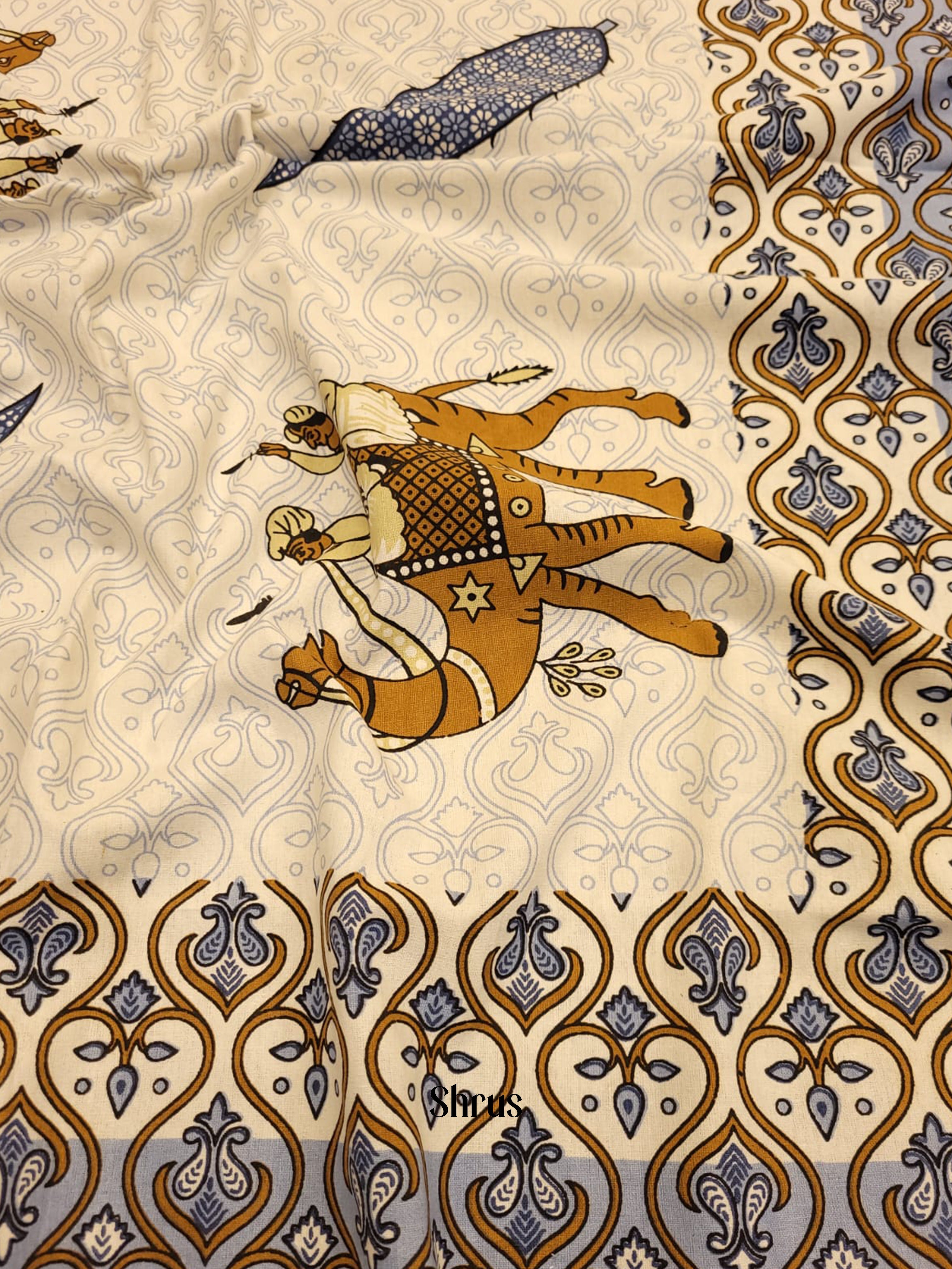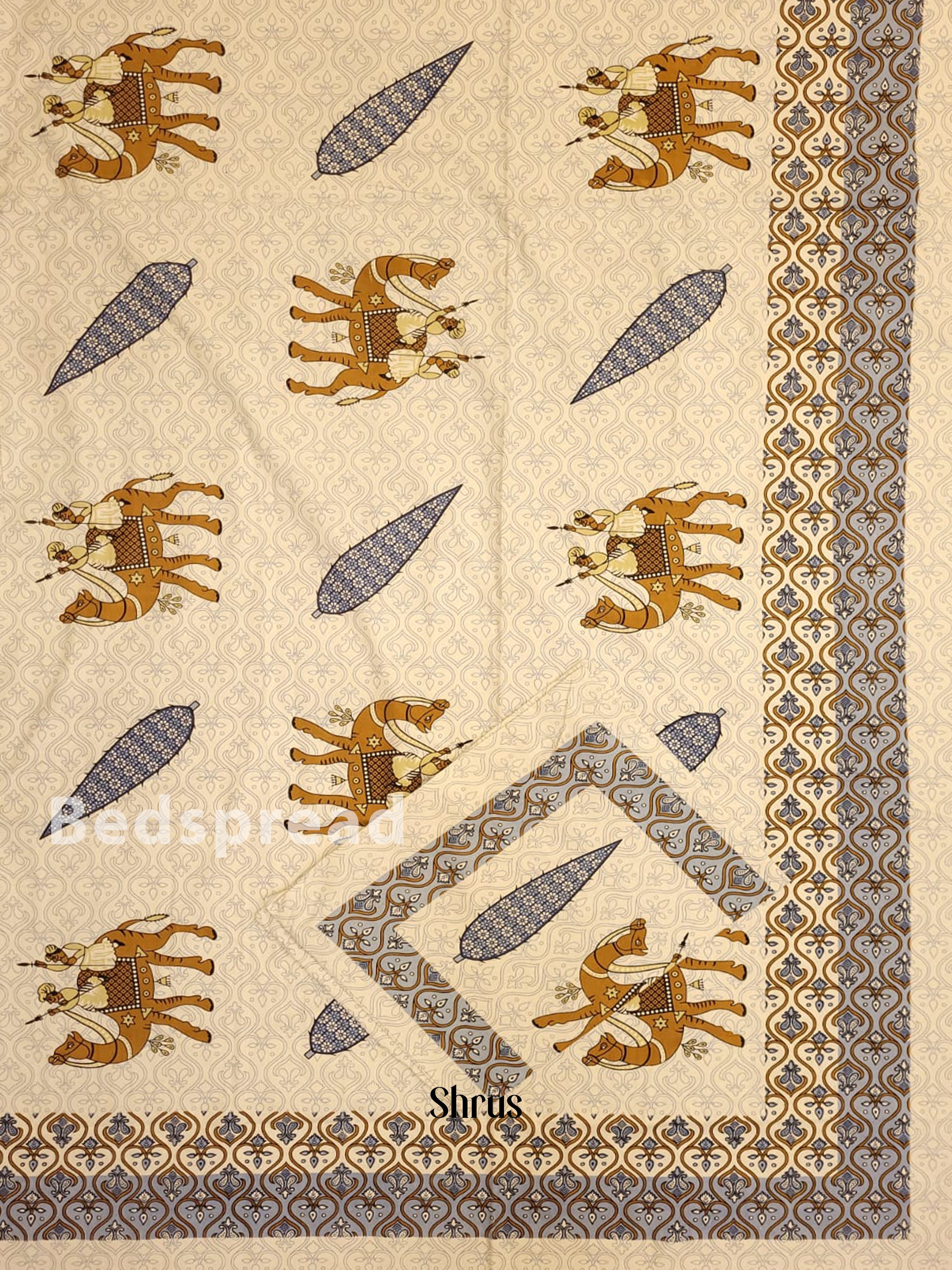 Transform your bedroom into a haven of luxury and sophistication with our Jaipuri Printed Bedspread in Cream & Blue. This set includes a bedspread and two pillow covers, all made from premium cotton material. Featuring exquisite Camel print and lively shades, it offers both stunning design and unparalleled comfort, providing the ideal environment for a restful sleep.