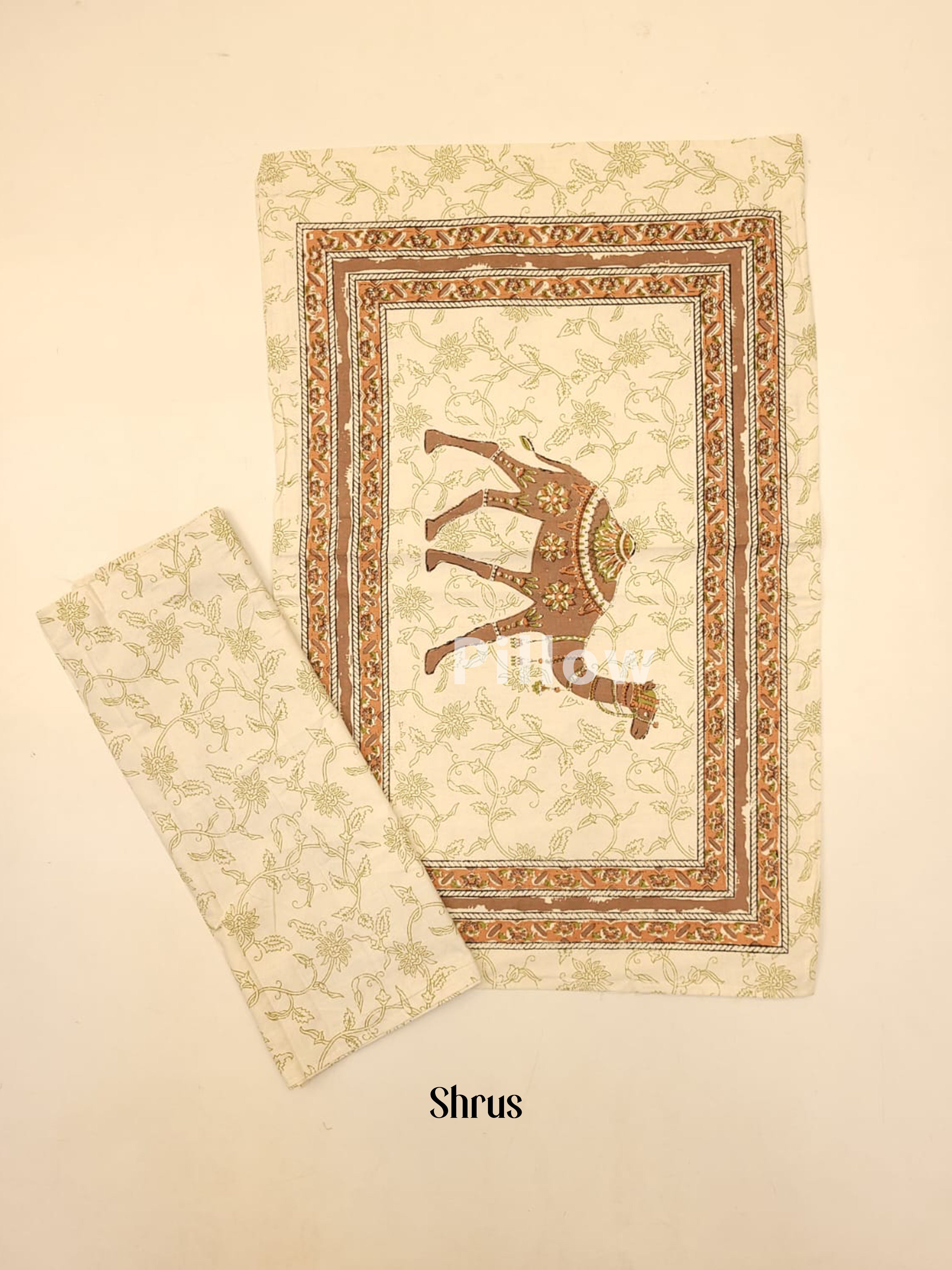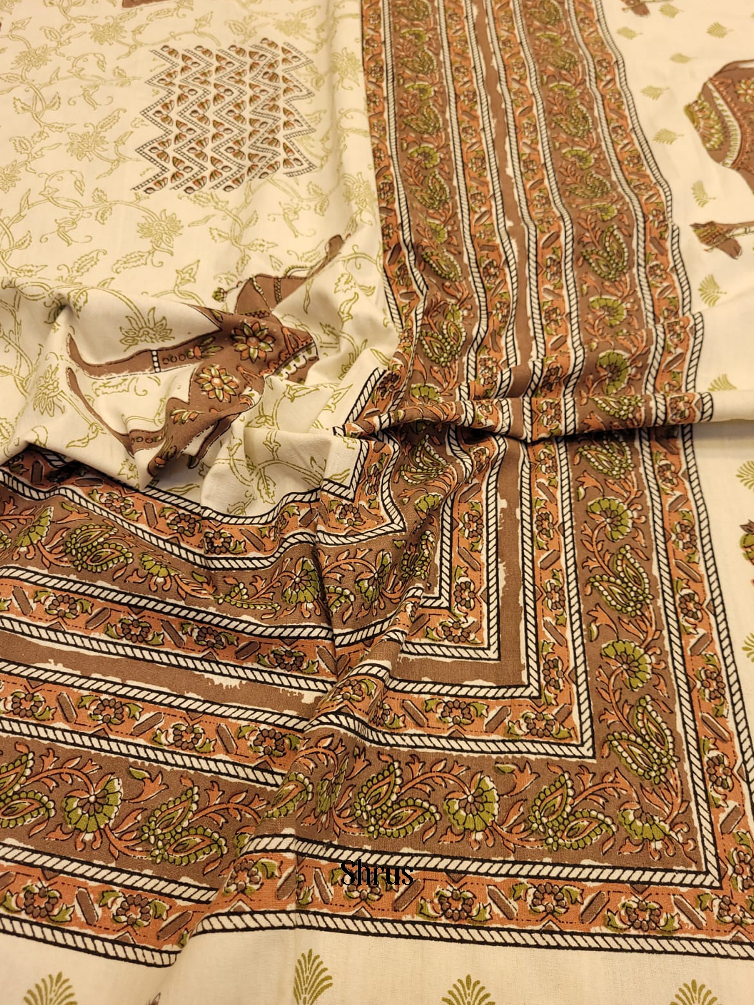 Transform your bedroom into a haven of luxury and sophistication with our Jaipuri Printed Bedspread in Cream & Brown. This set includes a bedspread and two pillow covers, all made from premium cotton material. Featuring exquisite Camel patterns and lively shades, it offers both stunning design and unparalleled comfort, providing the ideal environment for a restful sleep.