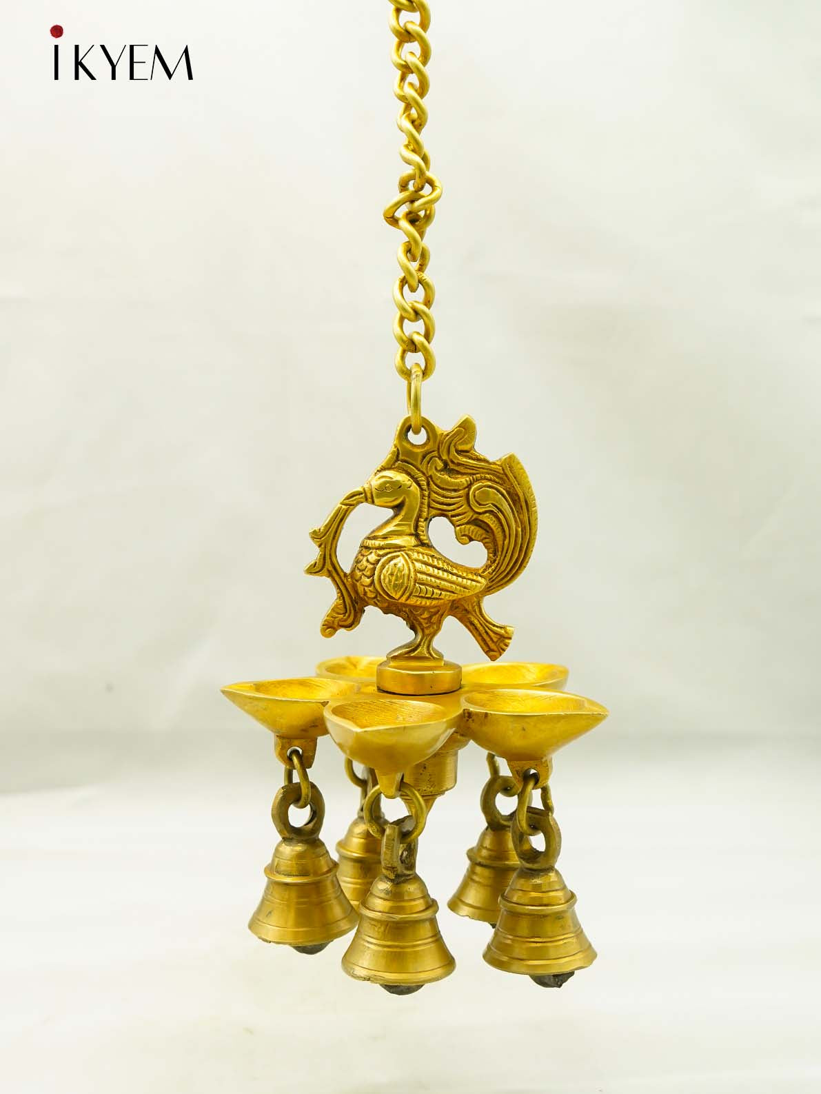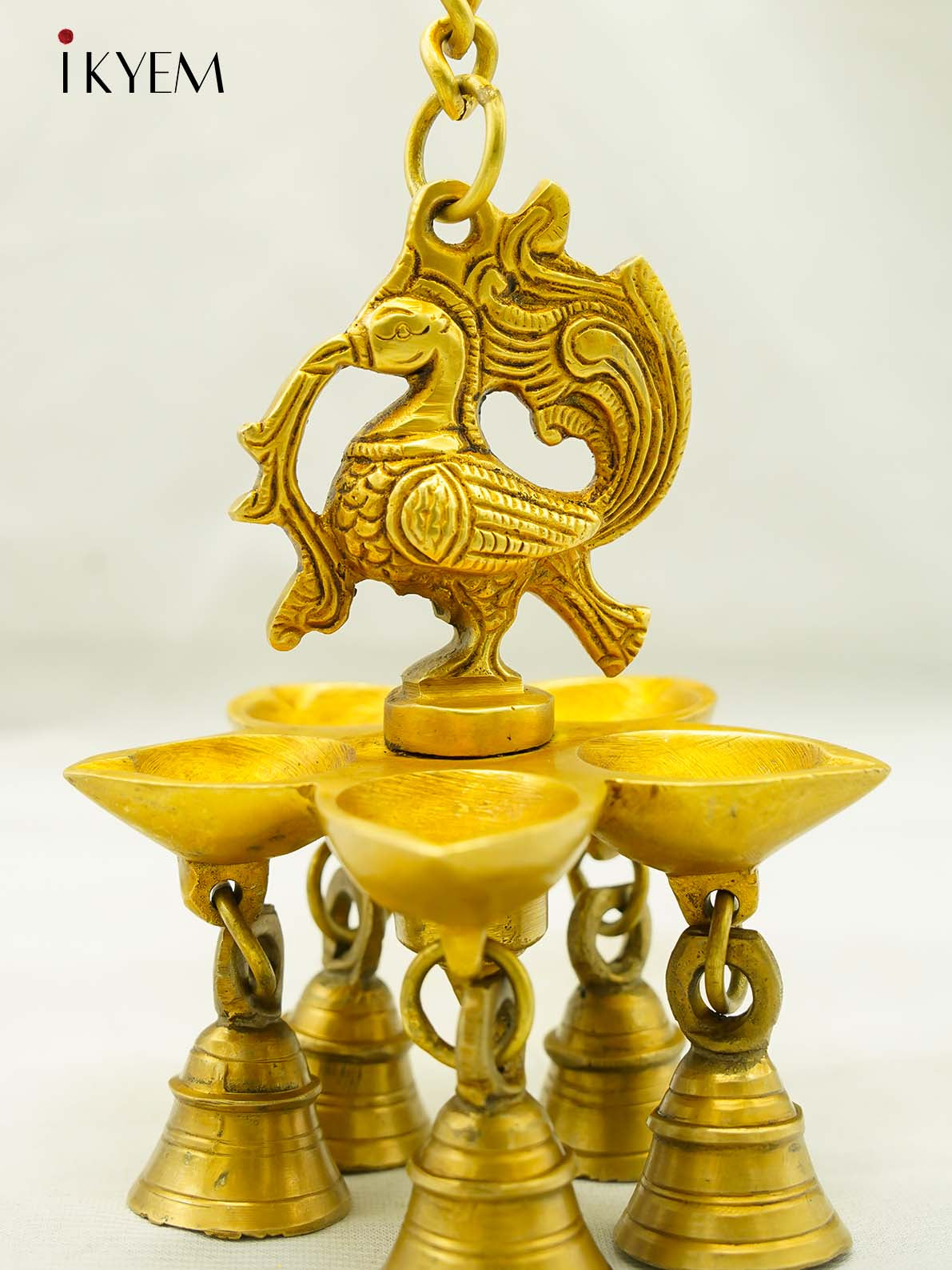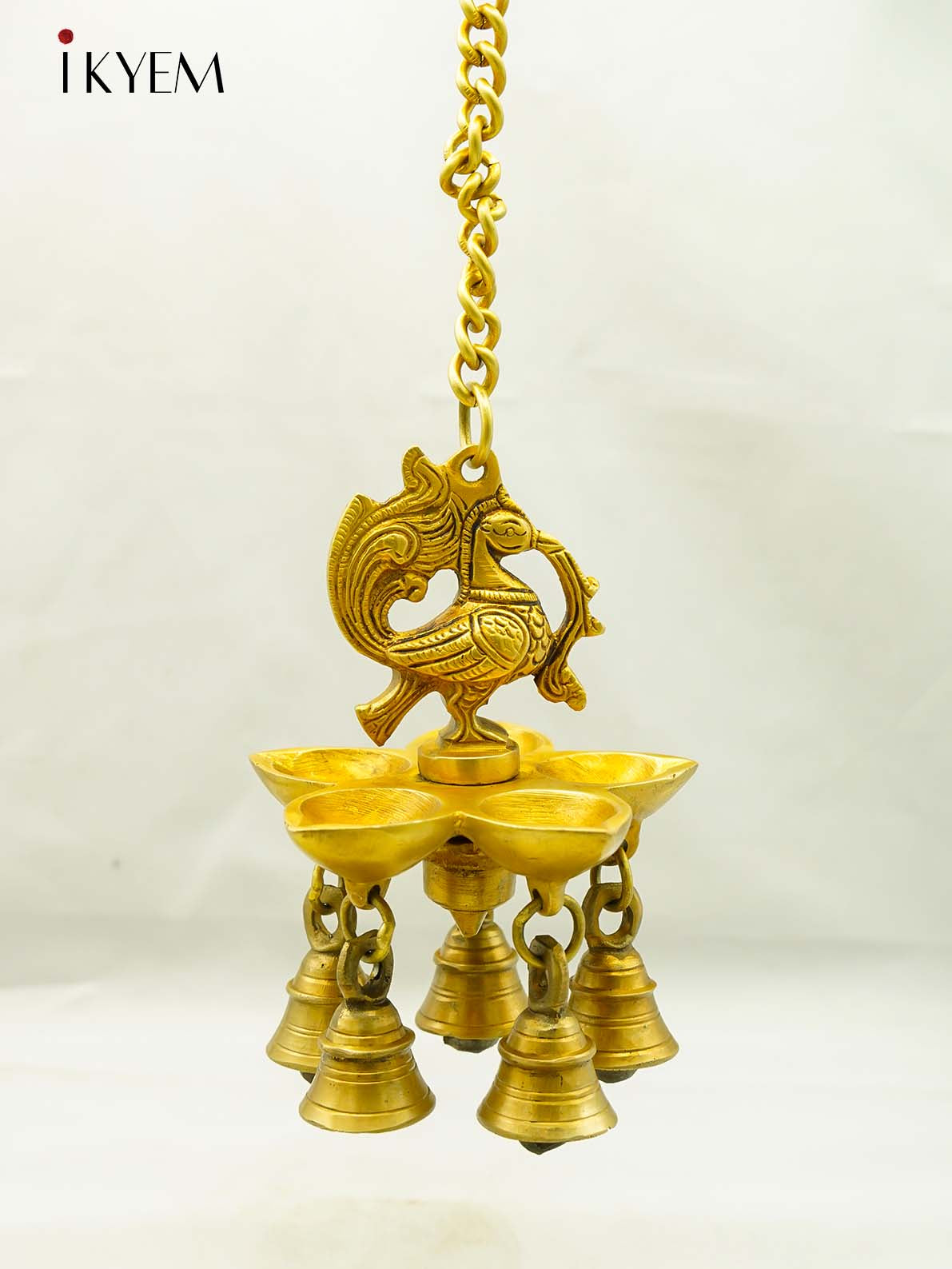 Illuminate your space with our exquisite Brass Peacock Hanging Vilakku with bells. Handcrafted with intricate details, this lamp showcases a stunning peacock design, symbolizing grace and beauty. Perfect for adding a touch of elegance and traditional charm to any decor