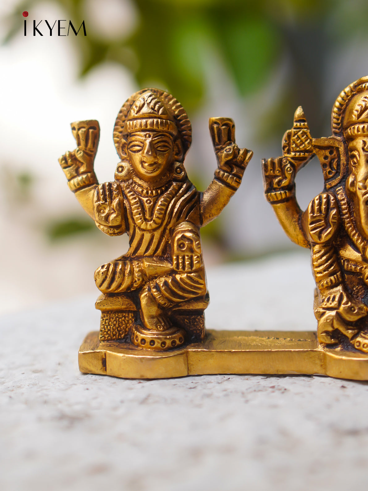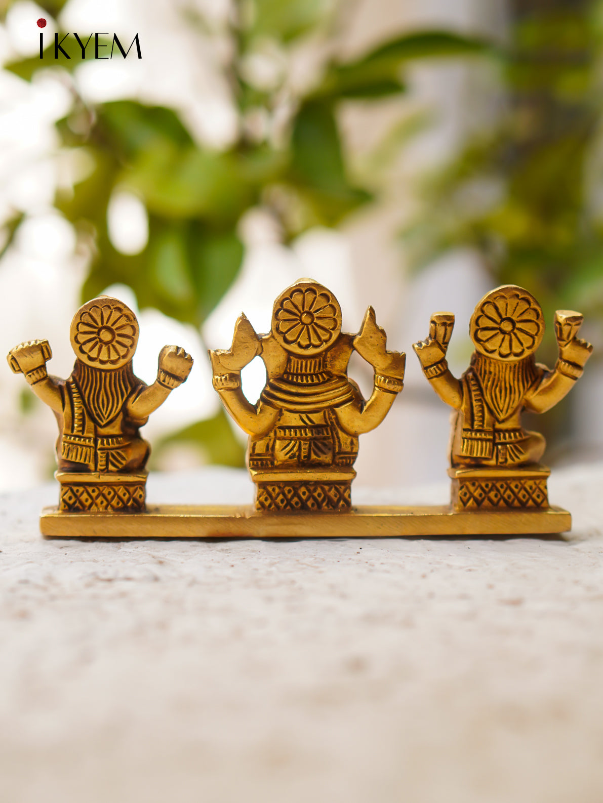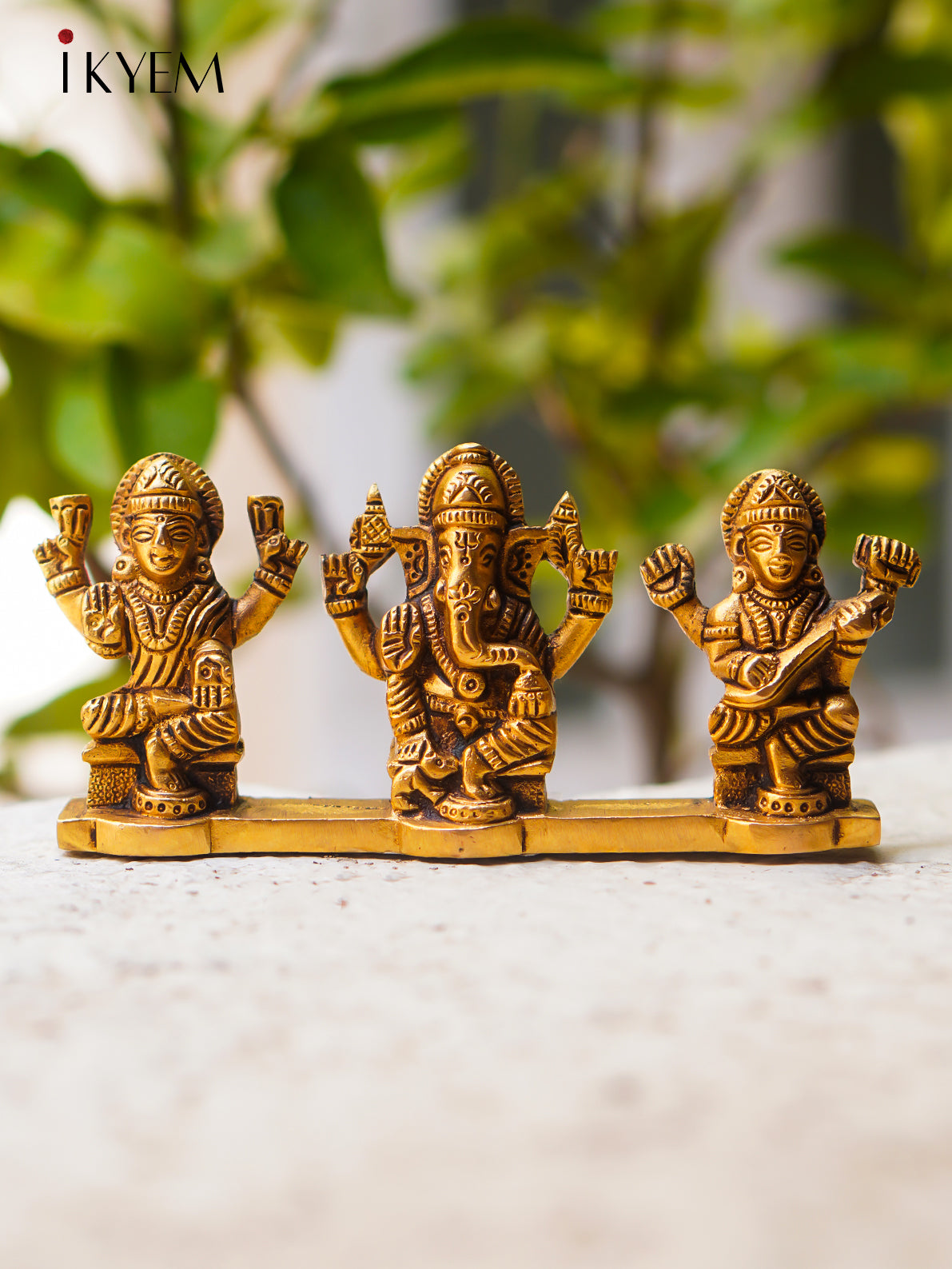 A beautiful brass idol featuring Ganesha, Lakshmi, and Saraswati, embodying wisdom, prosperity, and knowledge in Hindu mythology. Handcrafted with intricate detailing, perfect for home altars or as a spiritual gift. Symbolizes auspicious beginnings, wealth, and artistic expression in one divine ensemble.