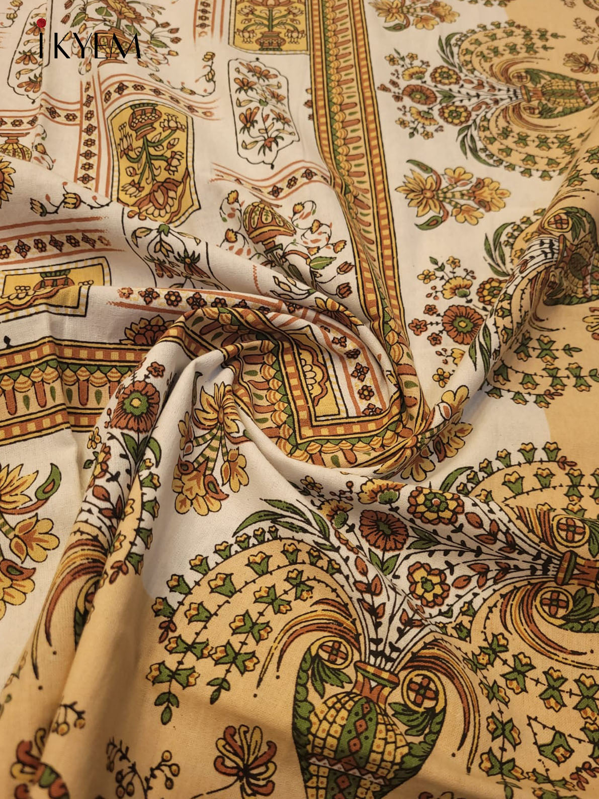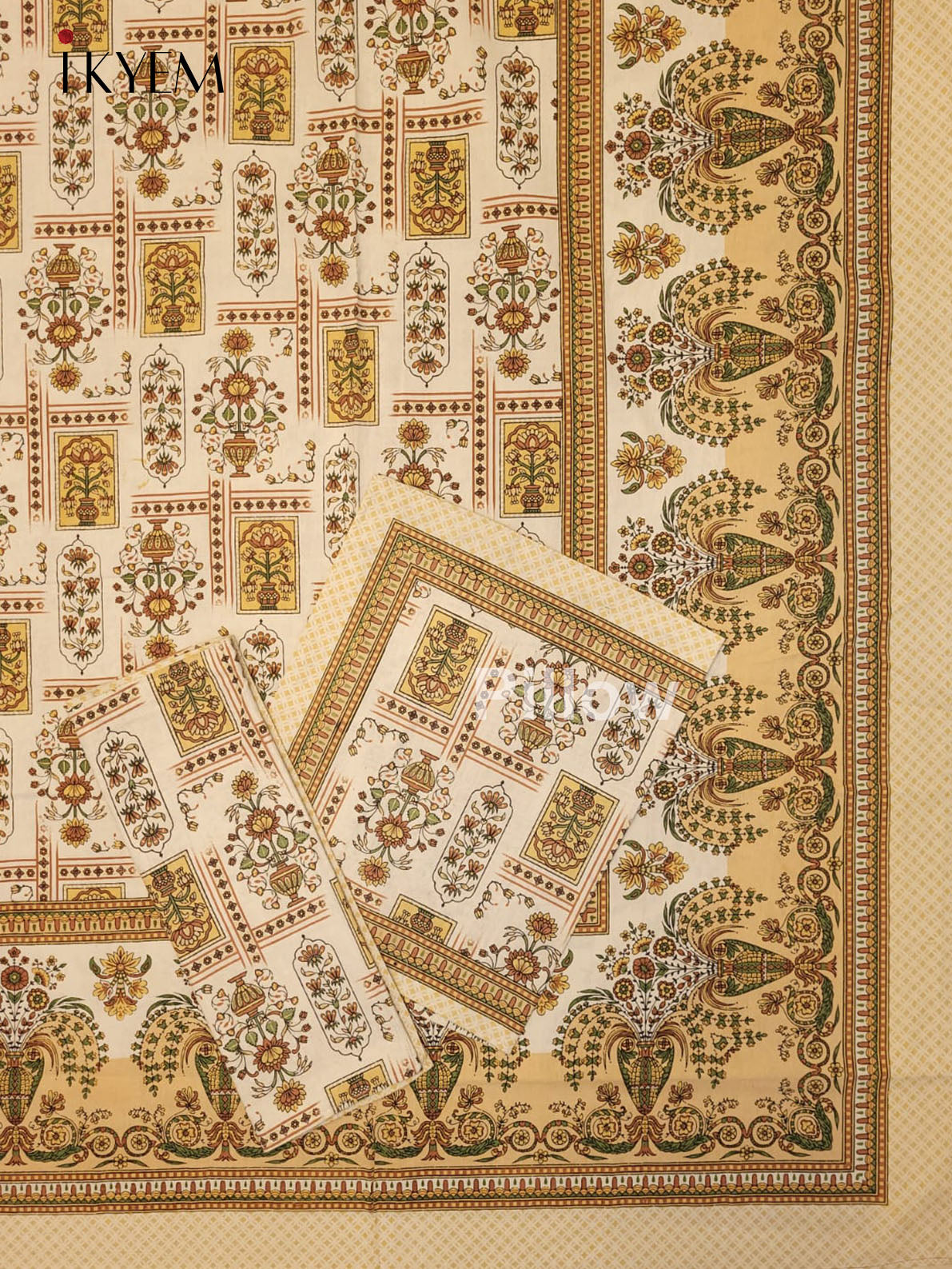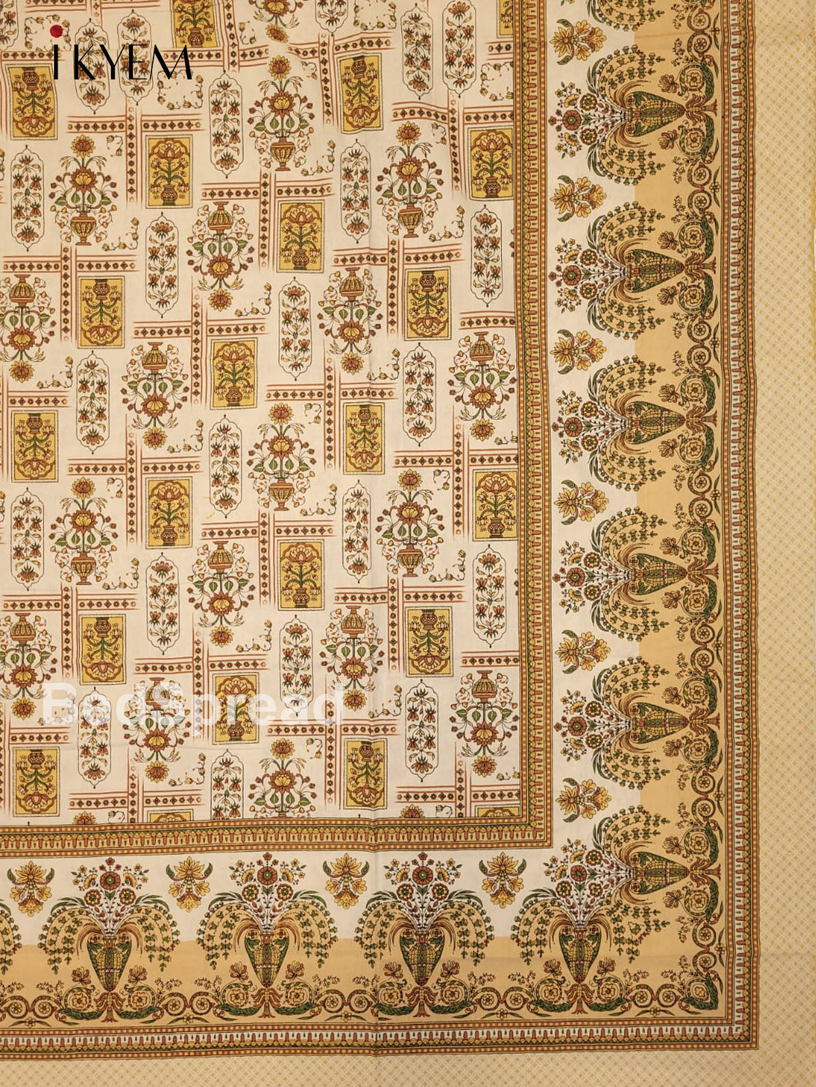 Experience the pinnacle of comfort and elegance with our Cream & Beige Jaipuri Printed Bedspread, complete with two matching pillow covers. Adorned with stunning floral designs and vibrant hues, this bedspread is crafted from high-quality cotton for the ultimate combination of style and coziness