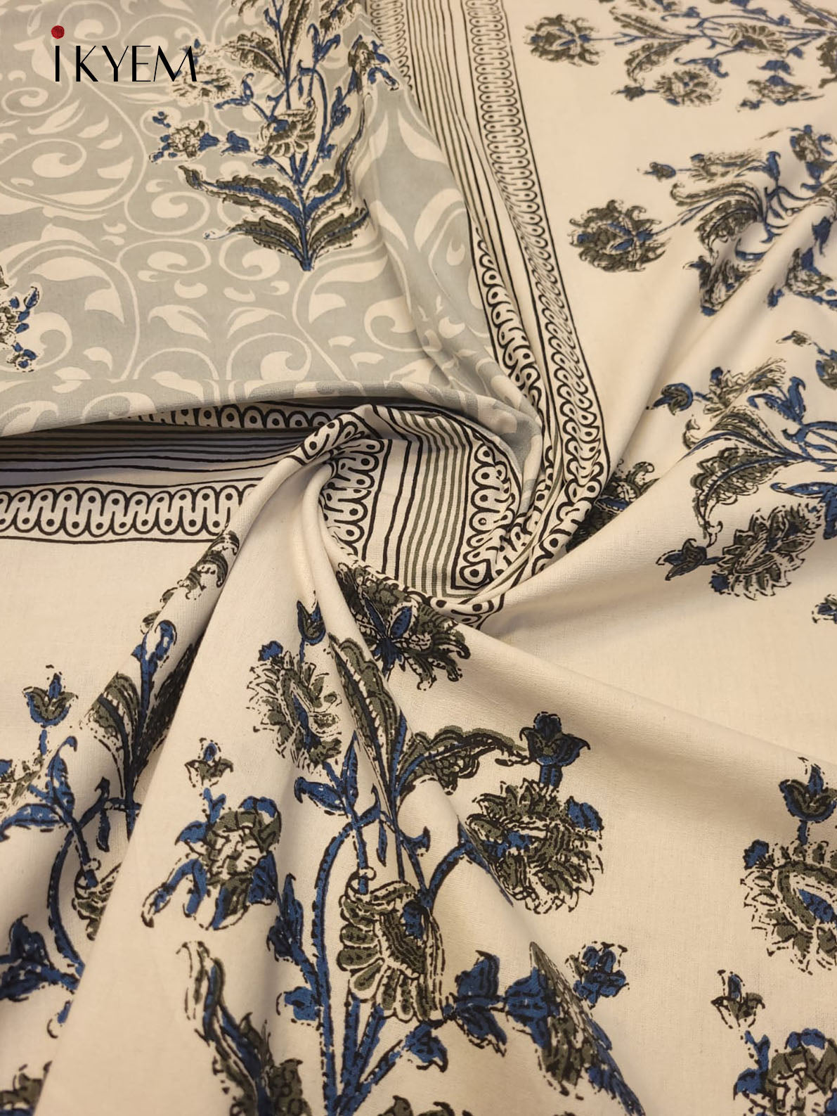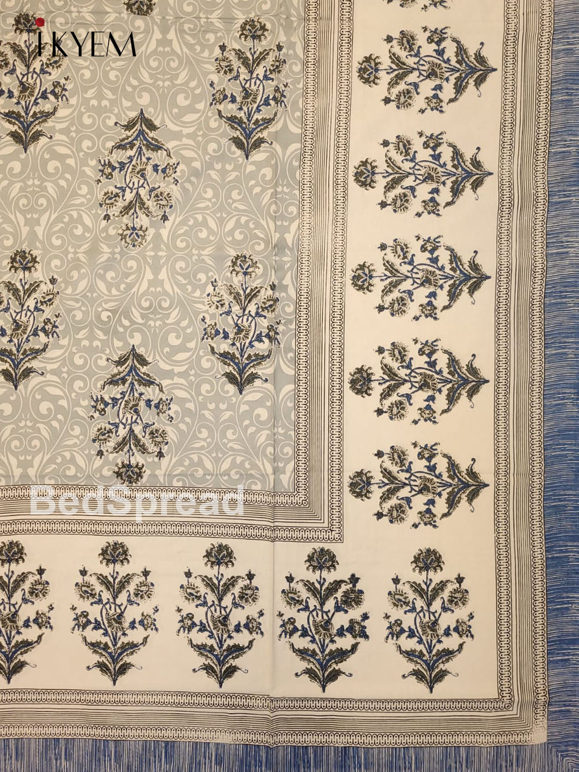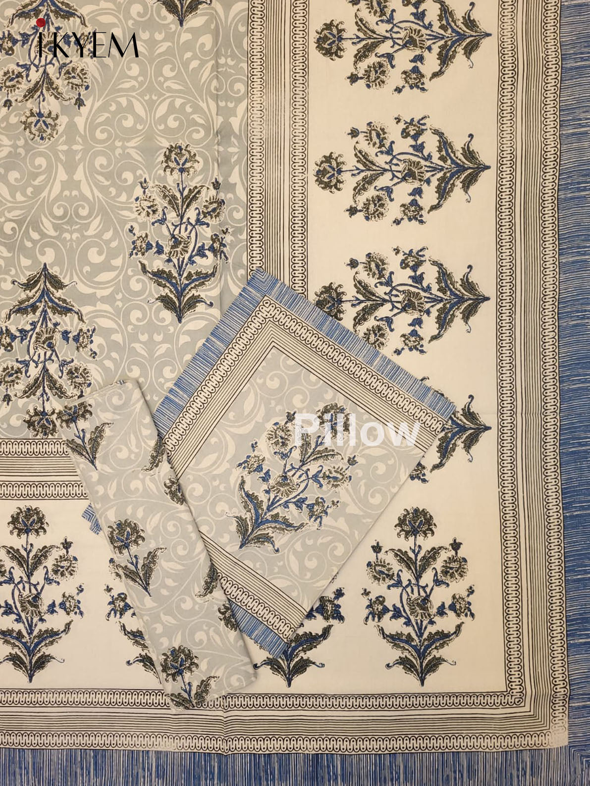 Experience the pinnacle of comfort and elegance with our  Cream & Grey Jaipuri Printed Bedspread, complete with two matching pillow covers. Adorned with stunning floral designs and vibrant hues, this bedspread is crafted from high-quality cotton for the ultimate combination of style and coziness