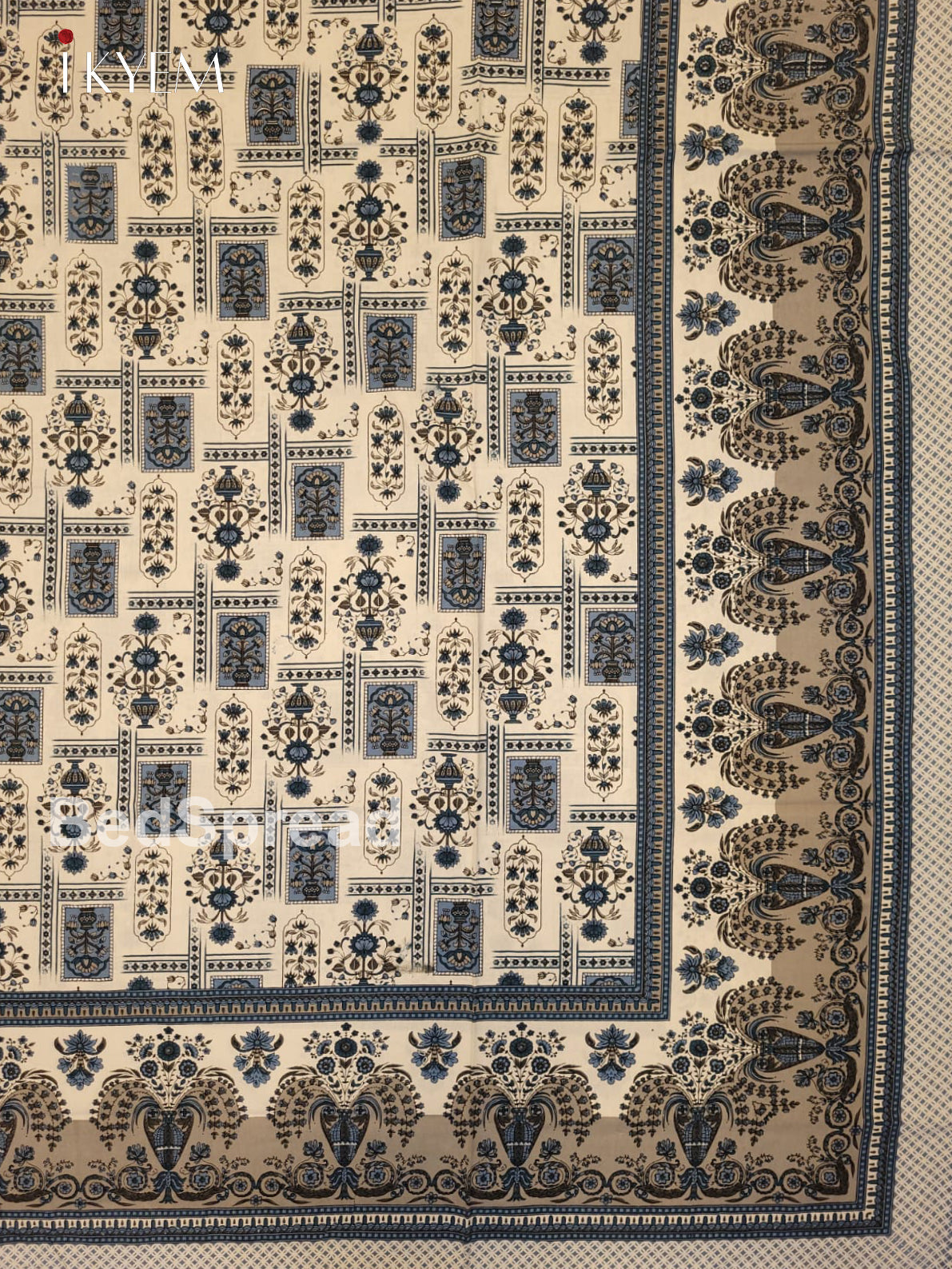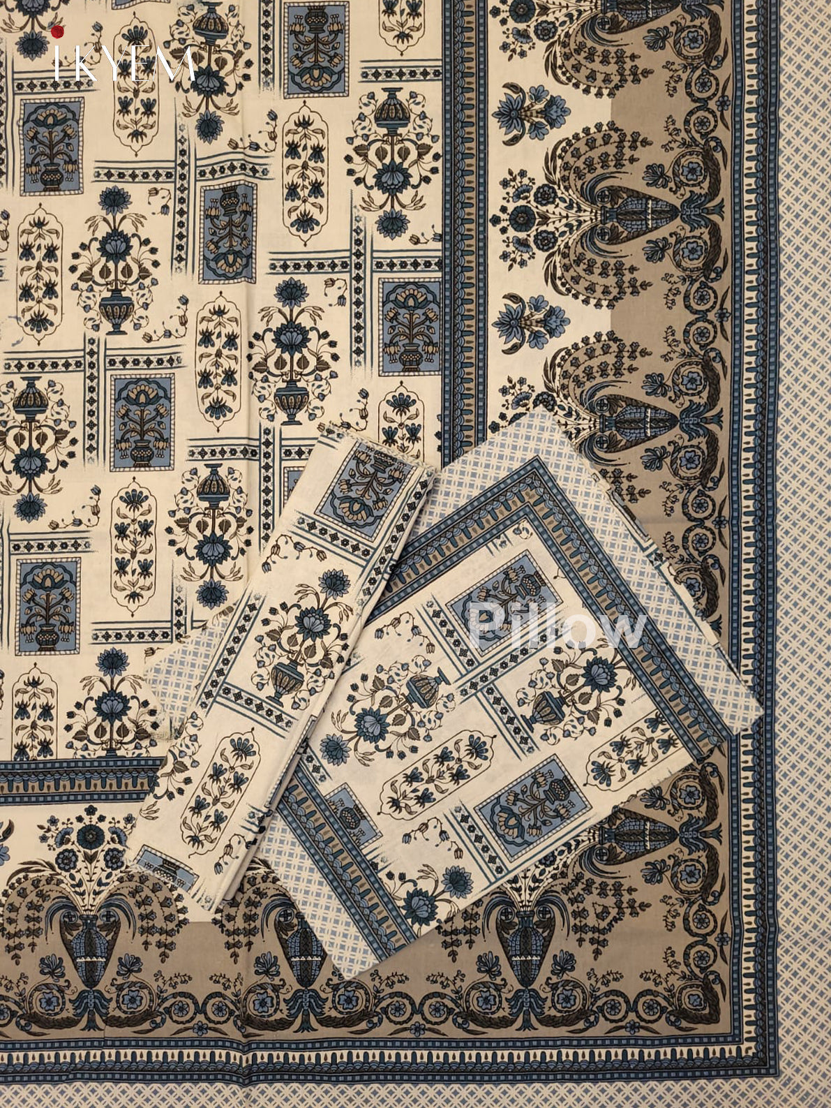 Experience the pinnacle of comfort and elegance with our Cream & Blue Jaipuri Printed Bedspread, complete with two matching pillow covers. Adorned with stunning floral designs and vibrant hues, this bedspread is crafted from high-quality cotton for the ultimate combination of style and coziness