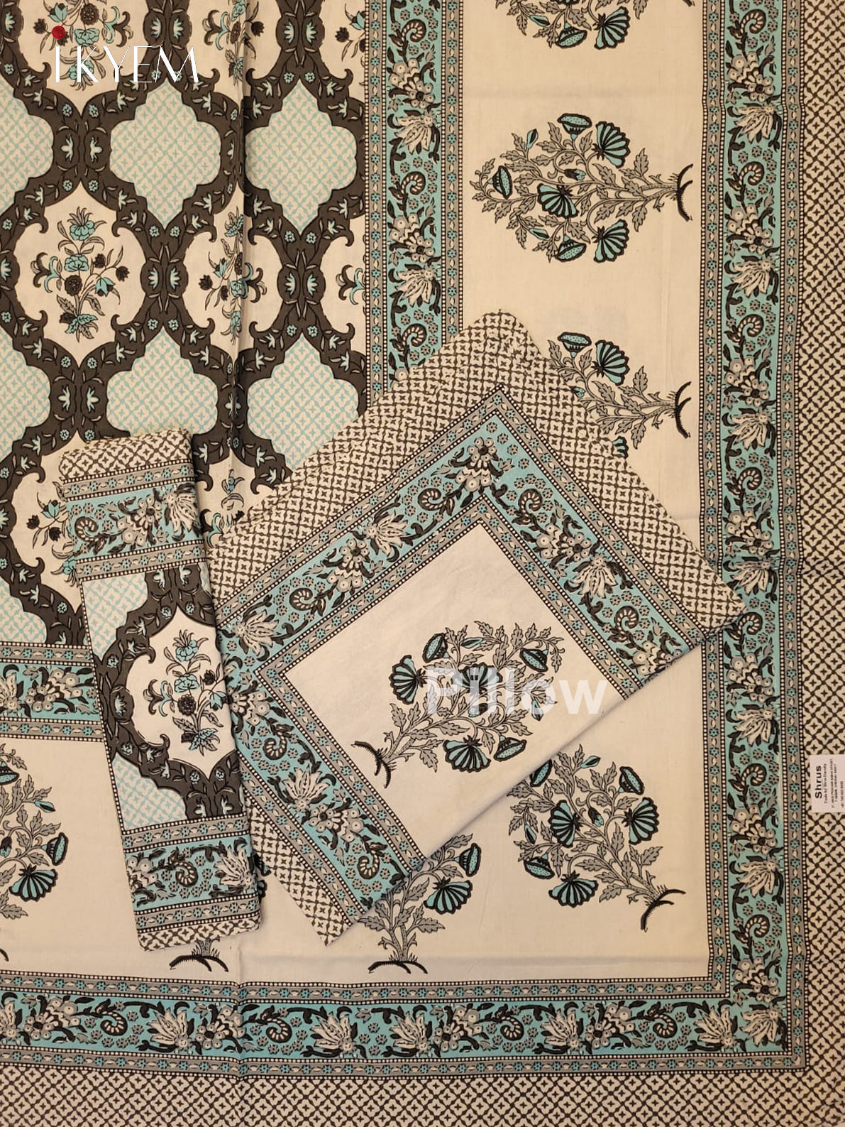 Experience the pinnacle of comfort and elegance with our Cream & Blue Jaipuri Printed Bedspread, complete with two matching pillow covers. Adorned with stunning floral designs and vibrant hues, this bedspread is crafted from high-quality cotton for the ultimate combination of style and coziness
