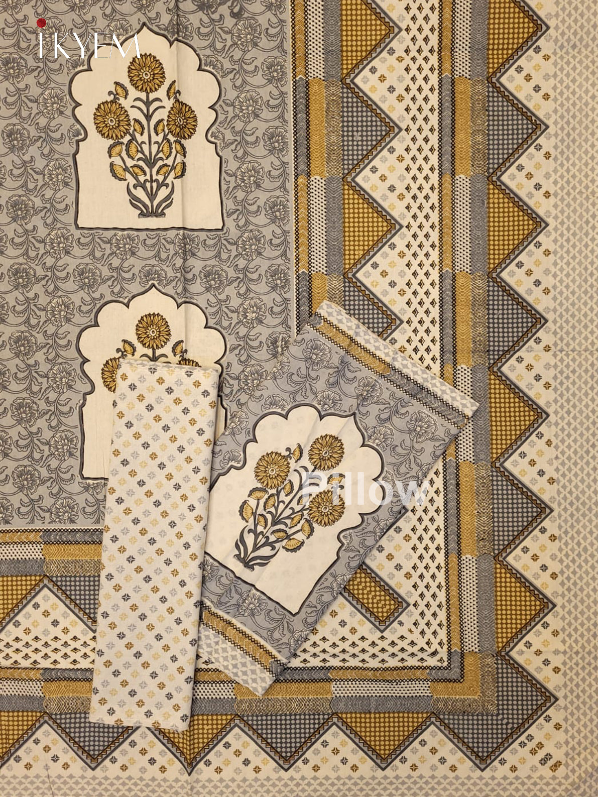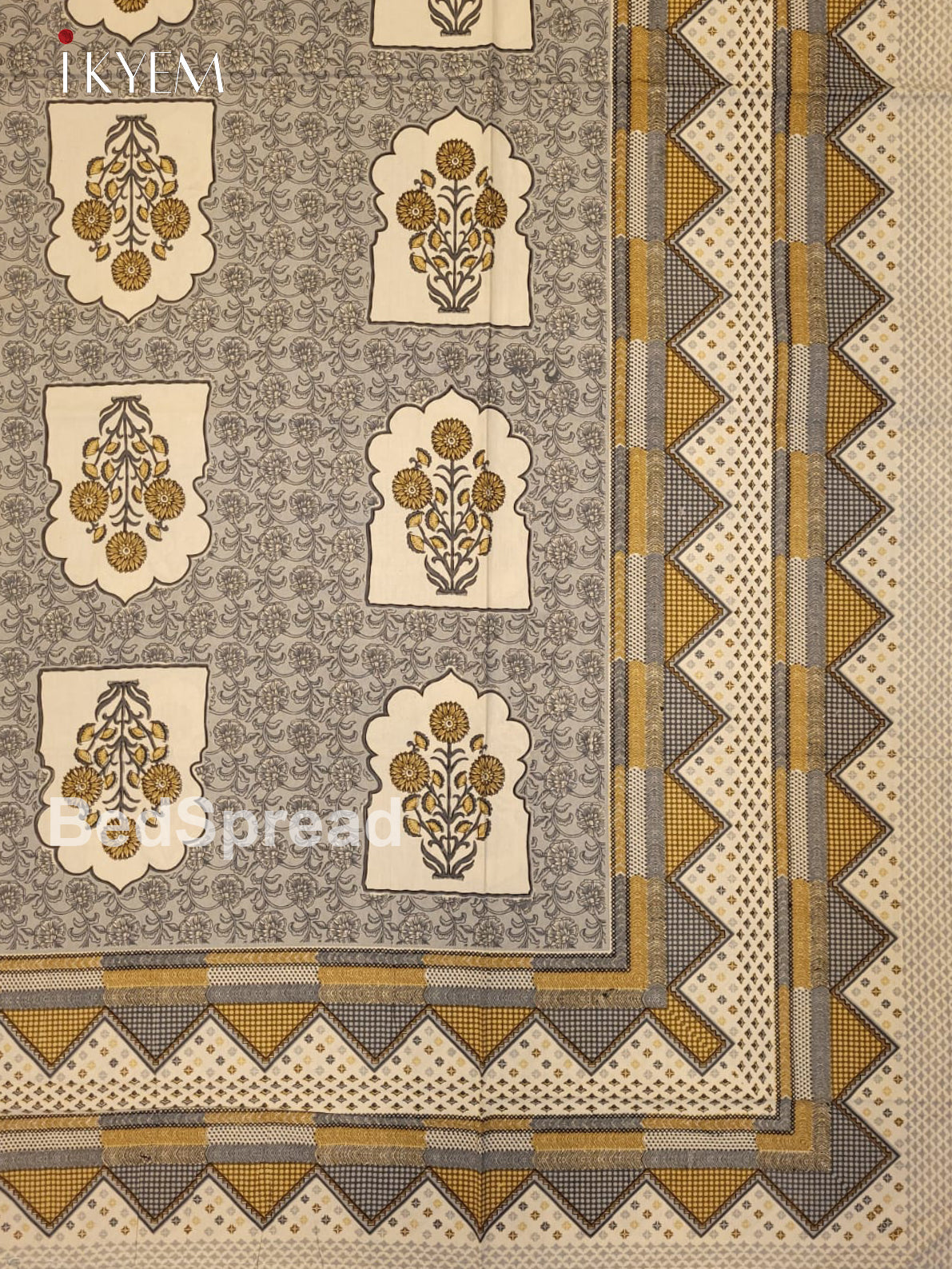 Experience the pinnacle of comfort and elegance with our Cream & Grey Jaipuri Printed Bedspread, complete with two matching pillow covers. Adorned with stunning floral designs and vibrant hues, this bedspread is crafted from high-quality cotton for the ultimate combination of style and coziness