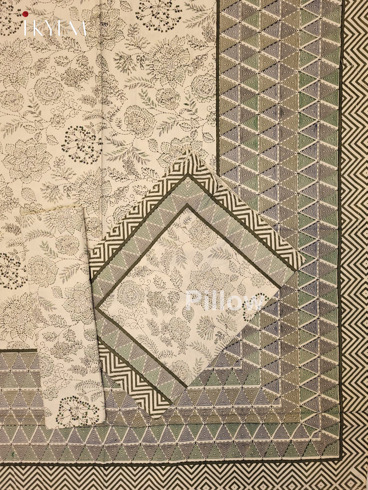 Experience the pinnacle of comfort and elegance with our  Cream & Green Jaipuri Printed Bedspread, complete with two matching pillow covers. Adorned with stunning floral designs and vibrant hues, this bedspread is crafted from high-quality cotton for the ultimate combination of style and coziness