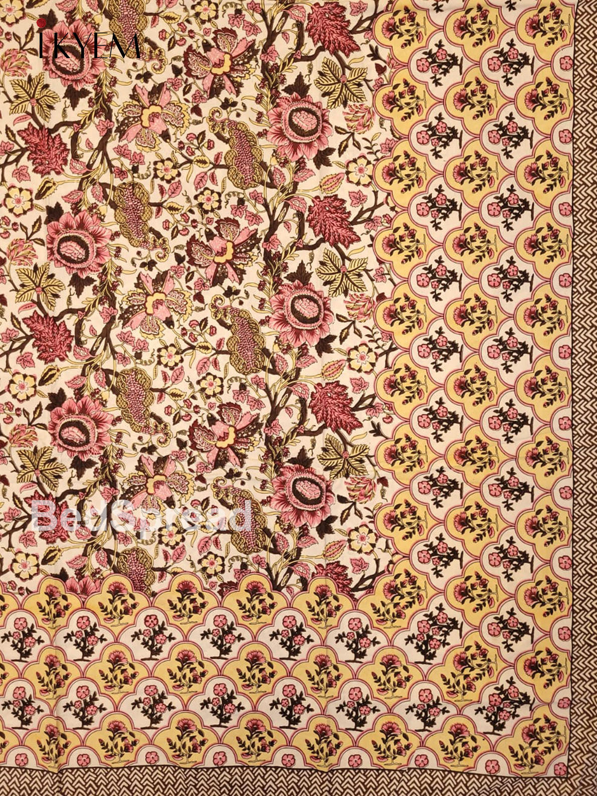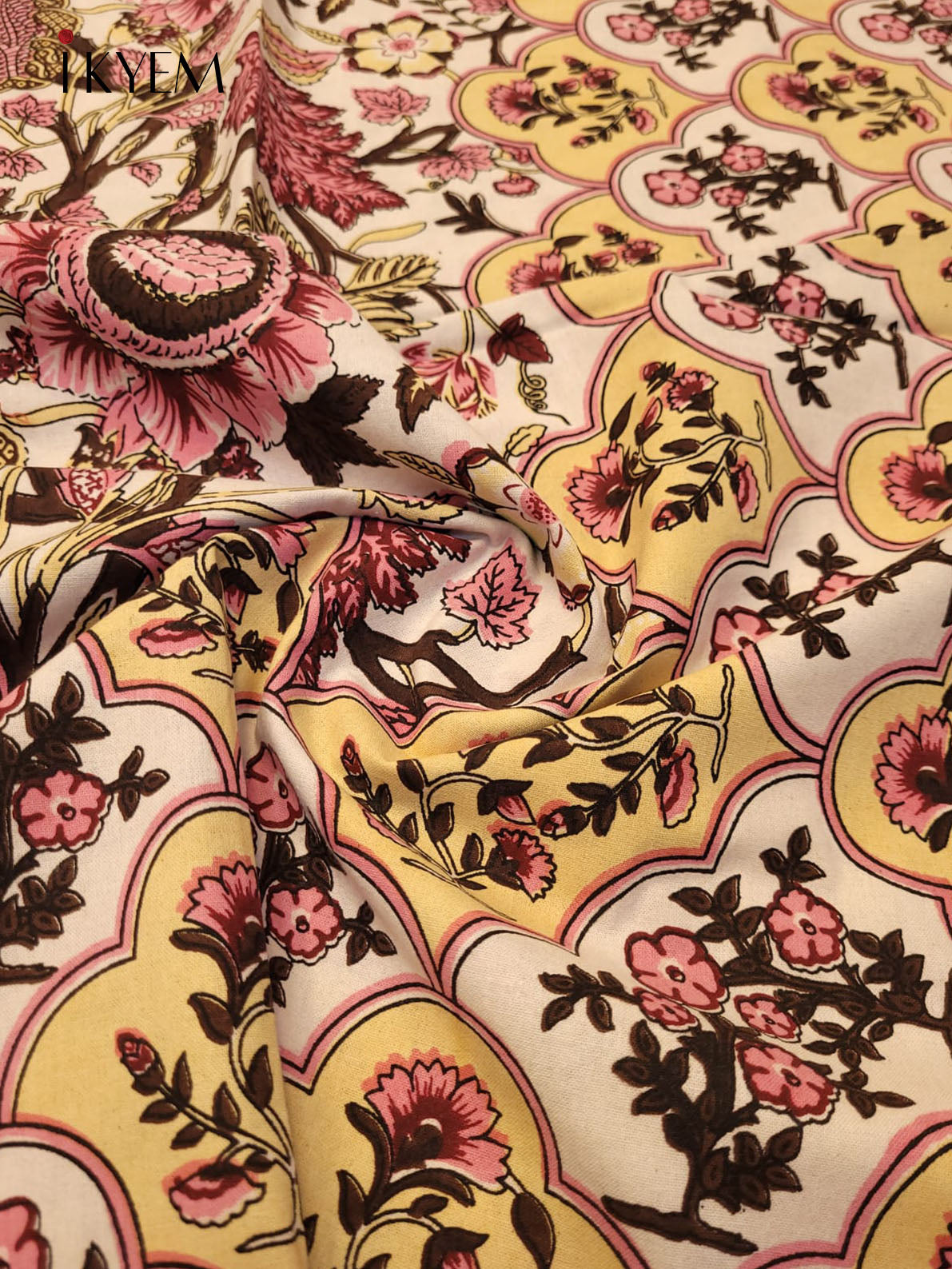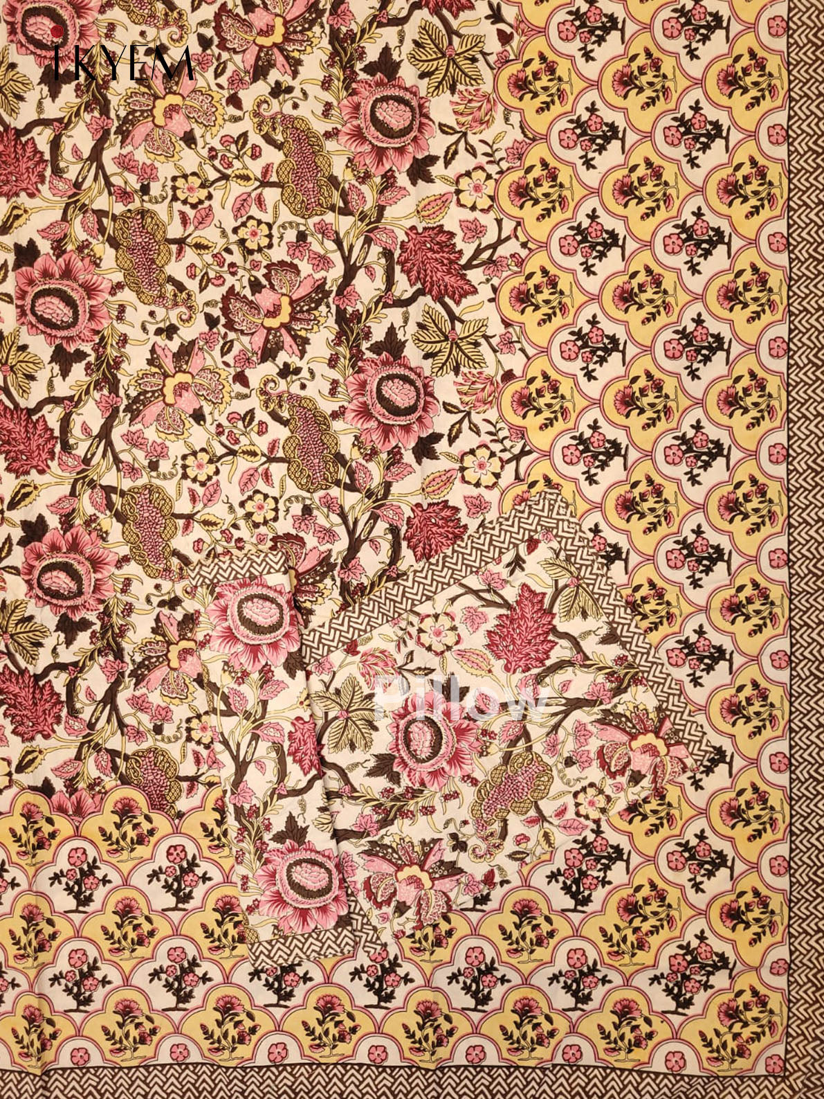 Experience the pinnacle of comfort and elegance with our Cream & Pink Jaipuri Printed Bedspread, complete with two matching pillow covers. Adorned with stunning floral designs and vibrant hues, this bedspread is crafted from high-quality cotton for the ultimate combination of style and coziness