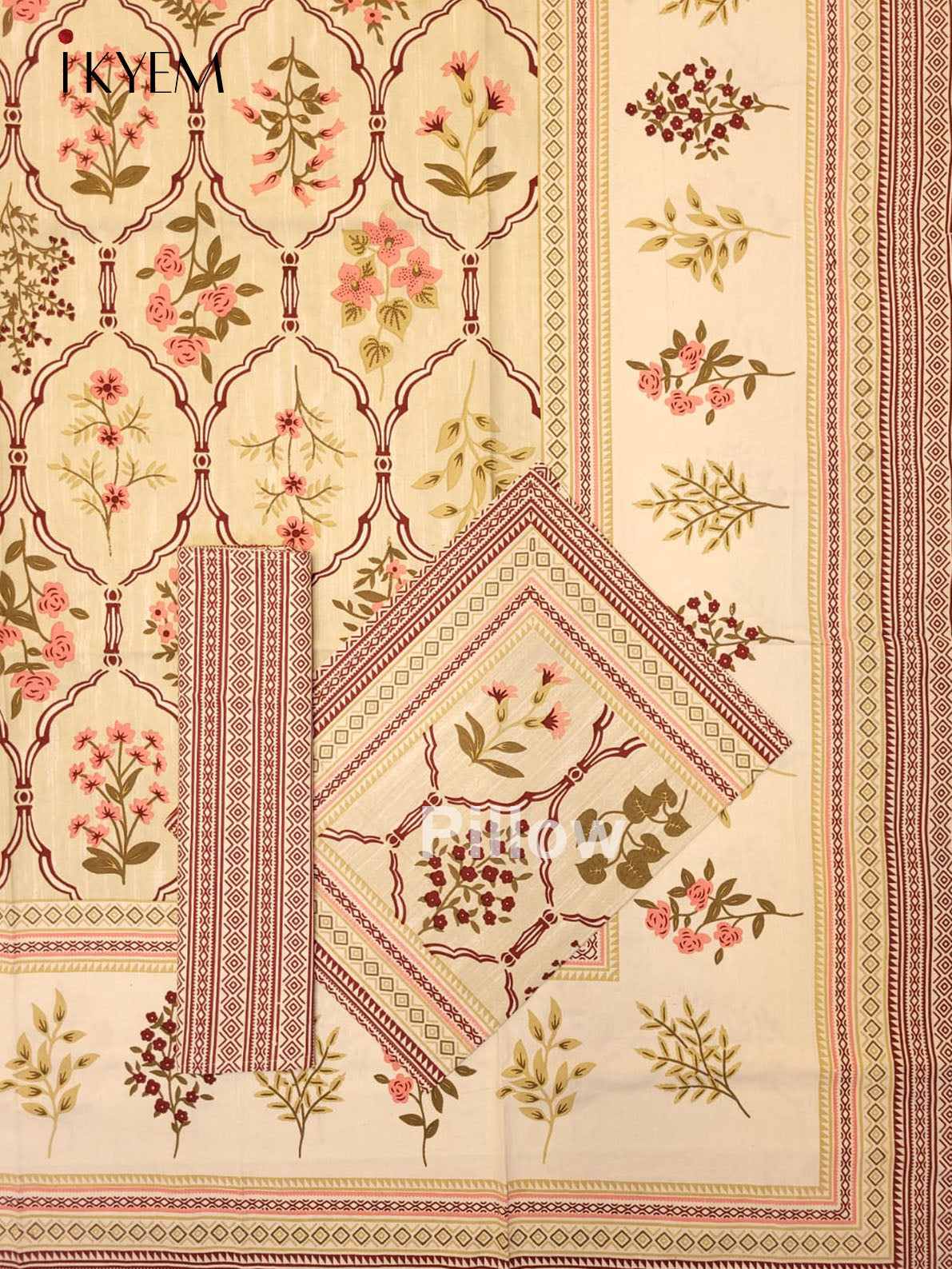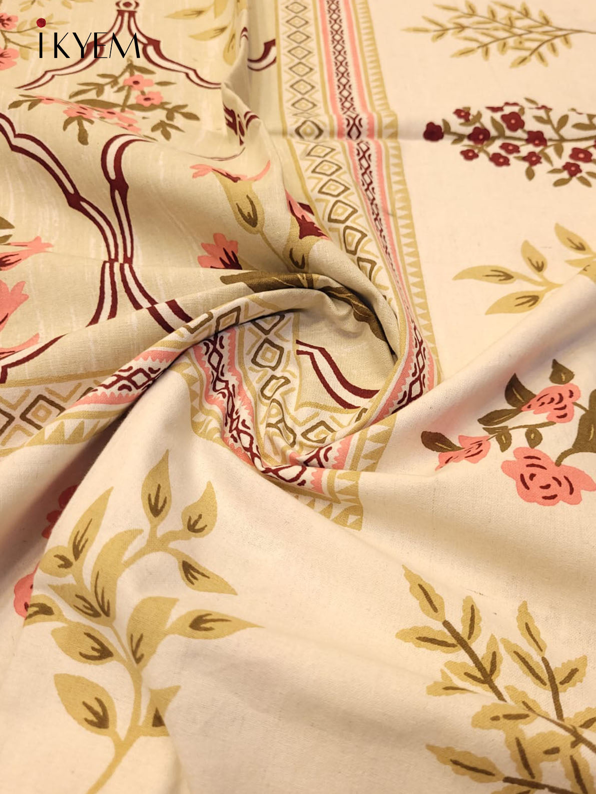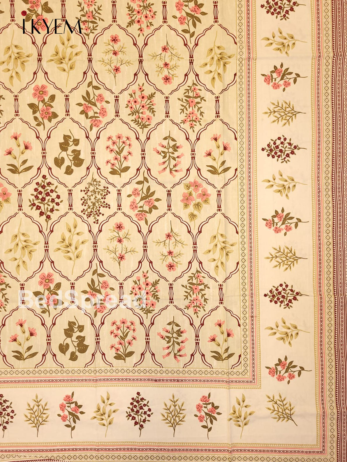 Experience the pinnacle of comfort and elegance with our   Cream & Green Jaipuri Printed Bedspread, complete with two matching pillow covers. Adorned with stunning floral designs and vibrant hues, this bedspread is crafted from high-quality cotton for the ultimate combination of style and coziness