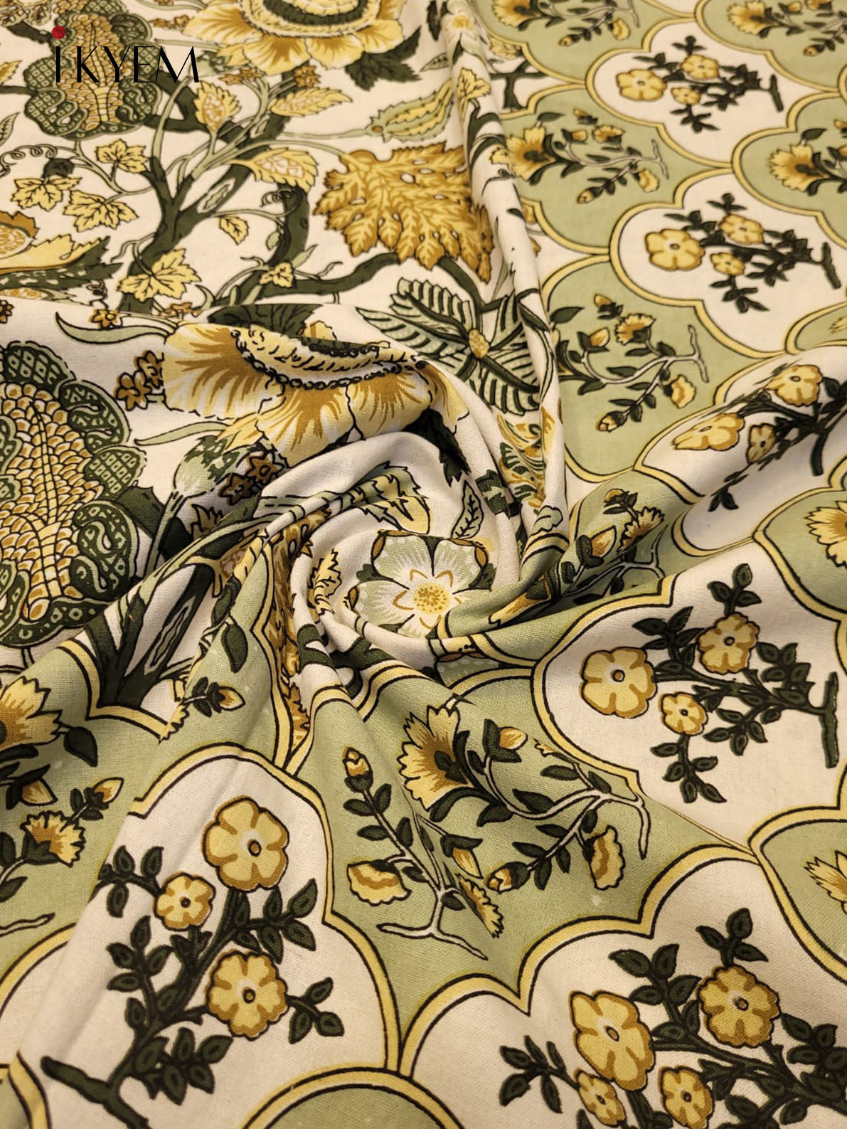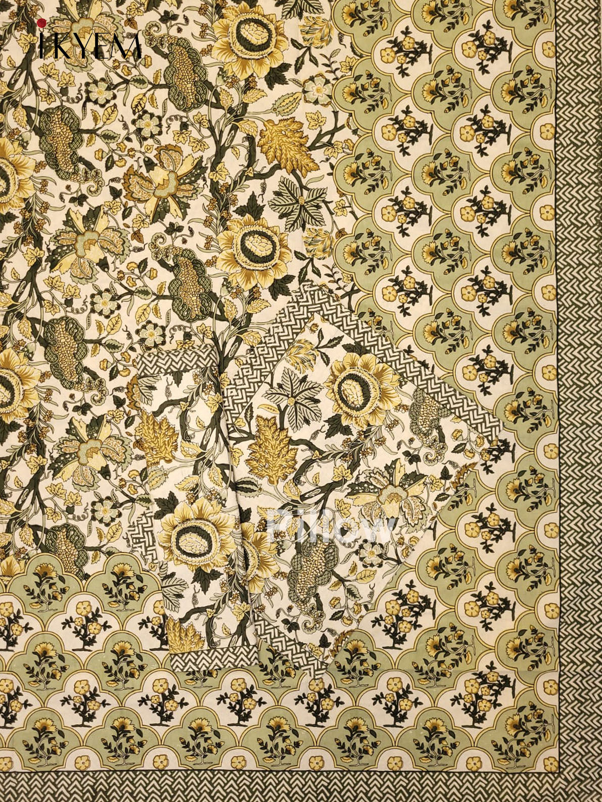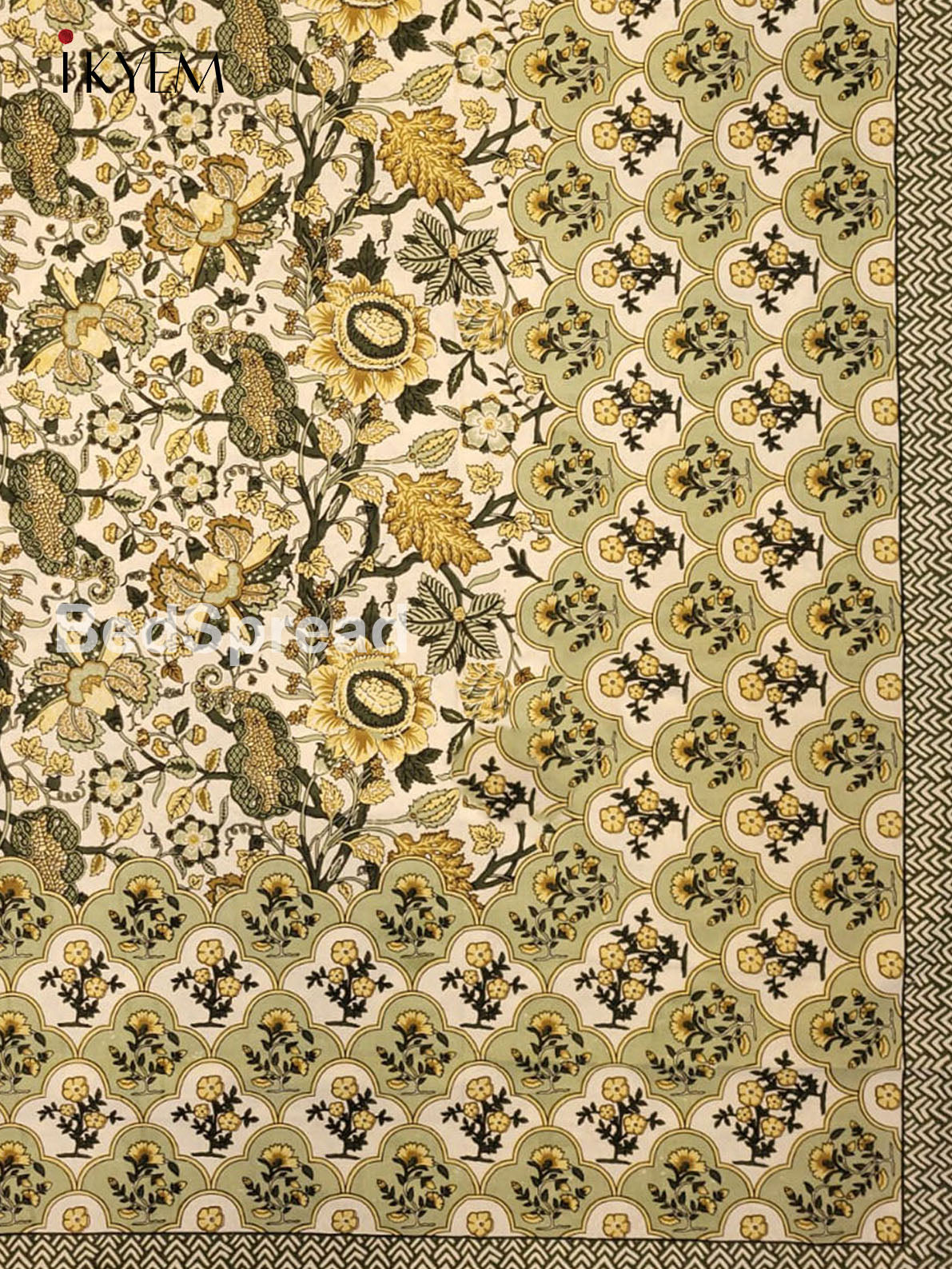 Experience the pinnacle of comfort and elegance with our  Cream & Green Jaipuri Printed Bedspread, complete with two matching pillow covers. Adorned with stunning floral designs and vibrant hues, this bedspread is crafted from high-quality cotton for the ultimate combination of style and coziness