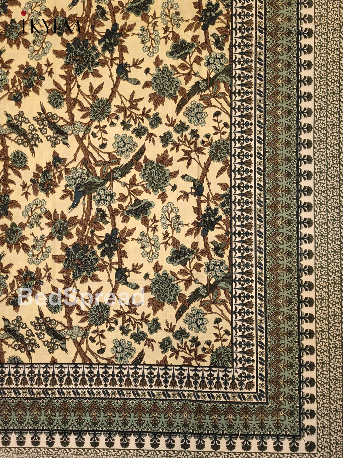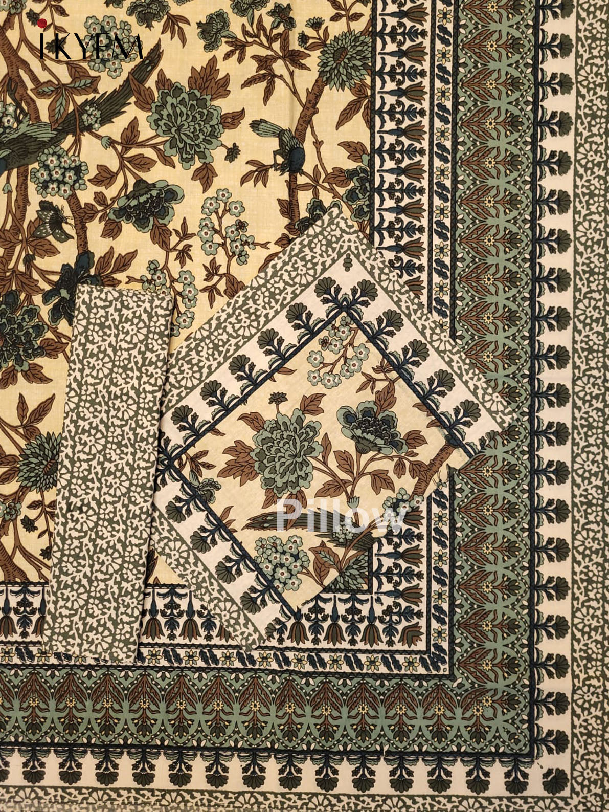 Experience the pinnacle of comfort and elegance with our Cream & Green Jaipuri Printed Bedspread, complete with two matching pillow covers. Adorned with stunning floral designs and vibrant hues, this bedspread is crafted from high-quality cotton for the ultimate combination of style and coziness