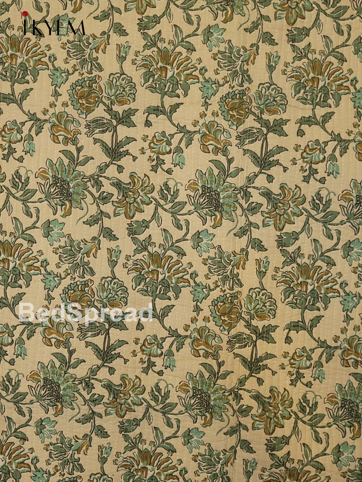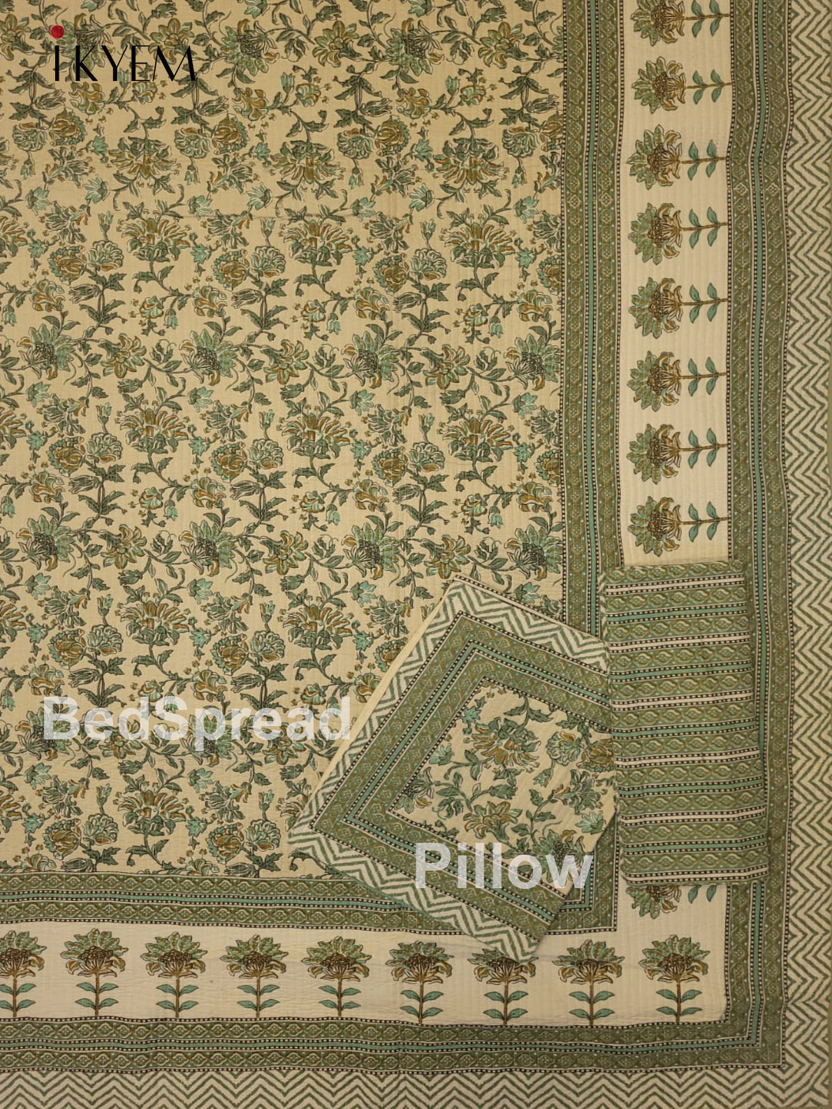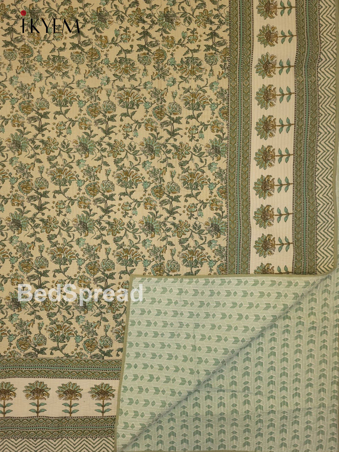 Pretty Elachi Green Printed Bedspread, complete with two matching pillow covers. Adorned with stunning floral designs and vibrant hues, this bedspread is crafted from high-quality cotton for the ultimate combination of style and coziness