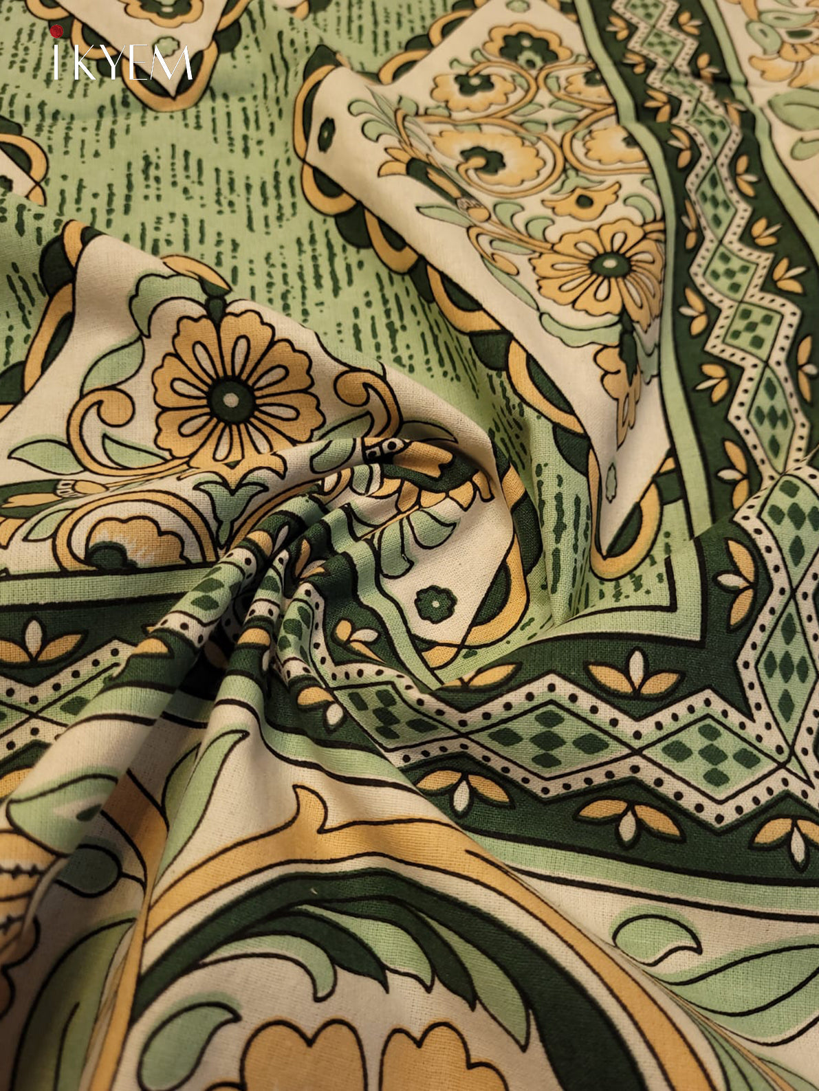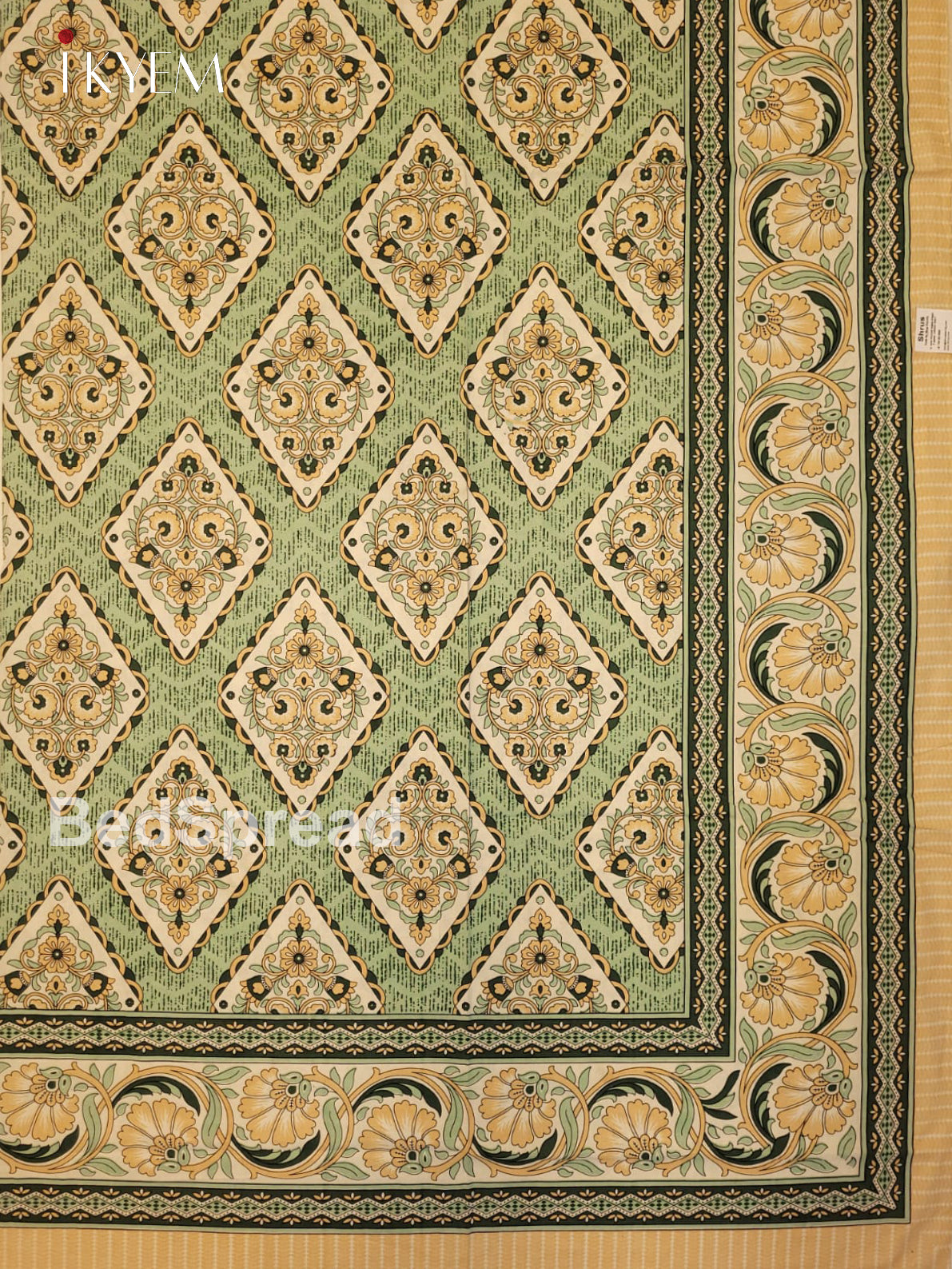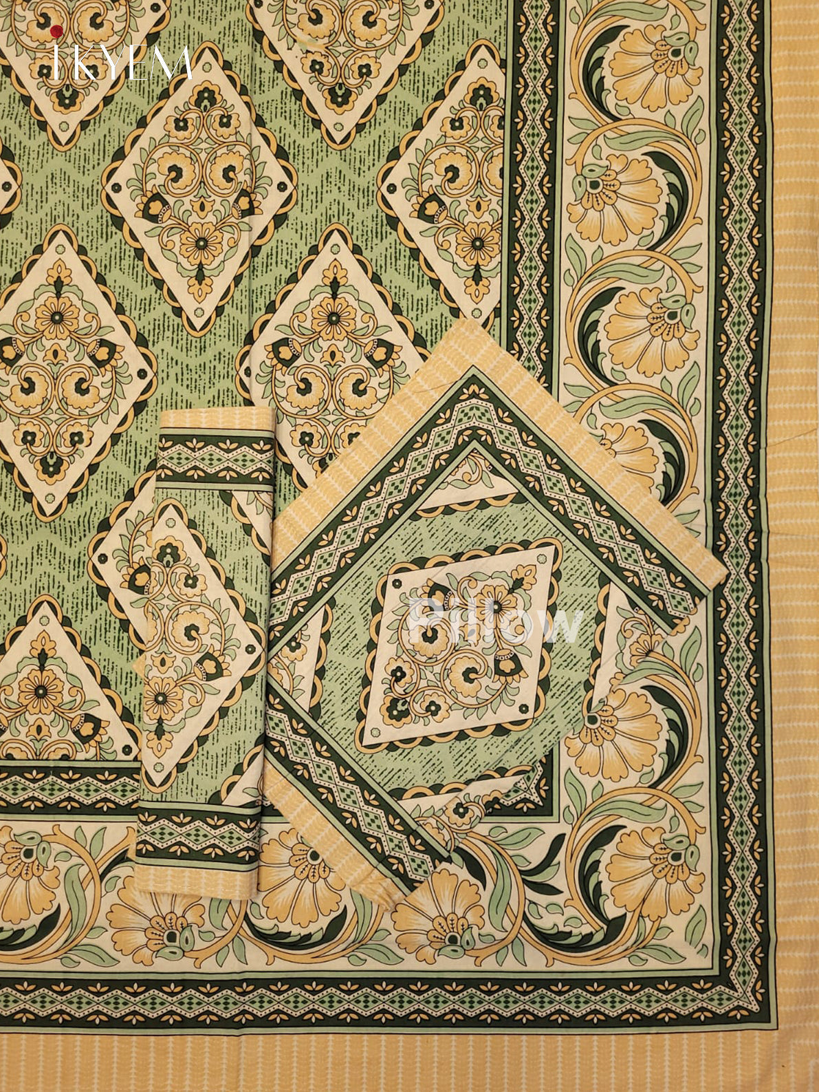 Experience the pinnacle of comfort and elegance with our Green & Peach Jaipuri Printed Bedspread, complete with two matching pillow covers. Adorned with stunning floral designs and vibrant hues, this bedspread is crafted from high-quality cotton for the ultimate combination of style and coziness