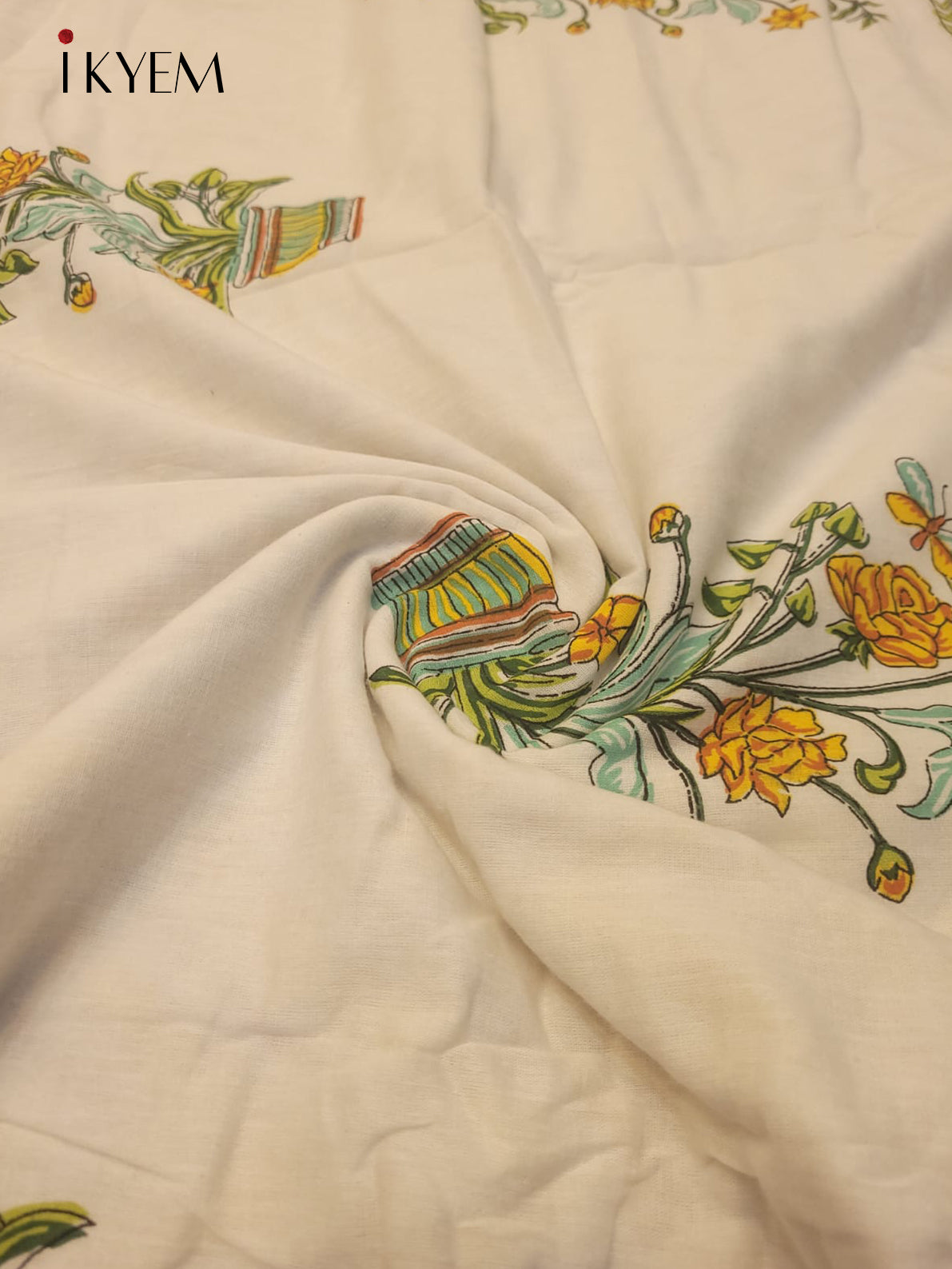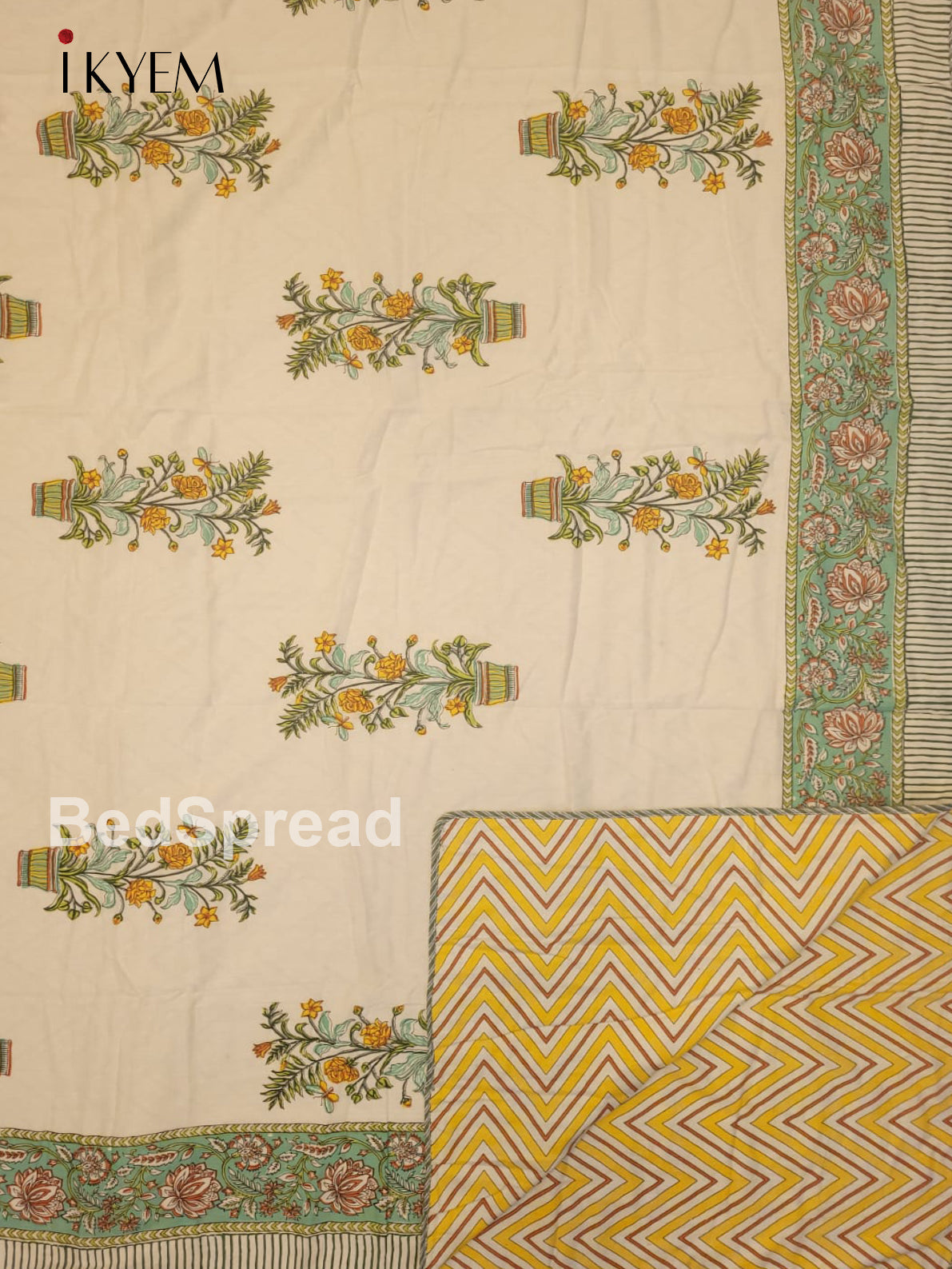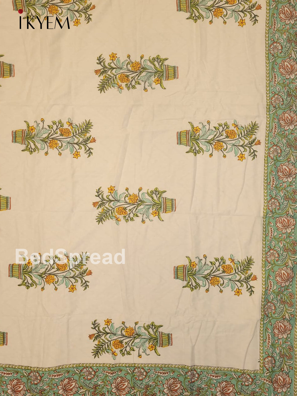 Elegant Cream & Green Printed Bedspread, complete with two matching pillow covers. Adorned with stunning floral designs and vibrant hues, this bedspread is crafted from high-quality cotton for the ultimate combination of style and coziness