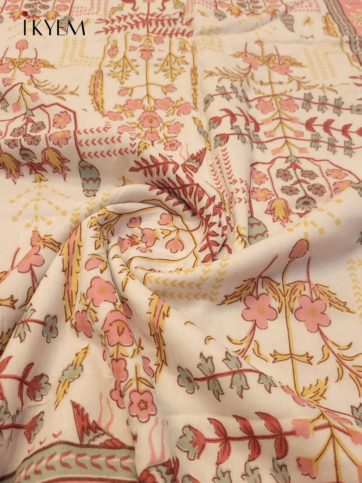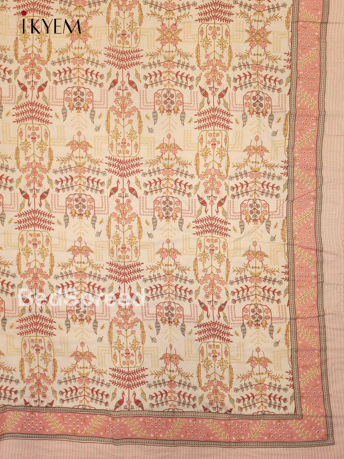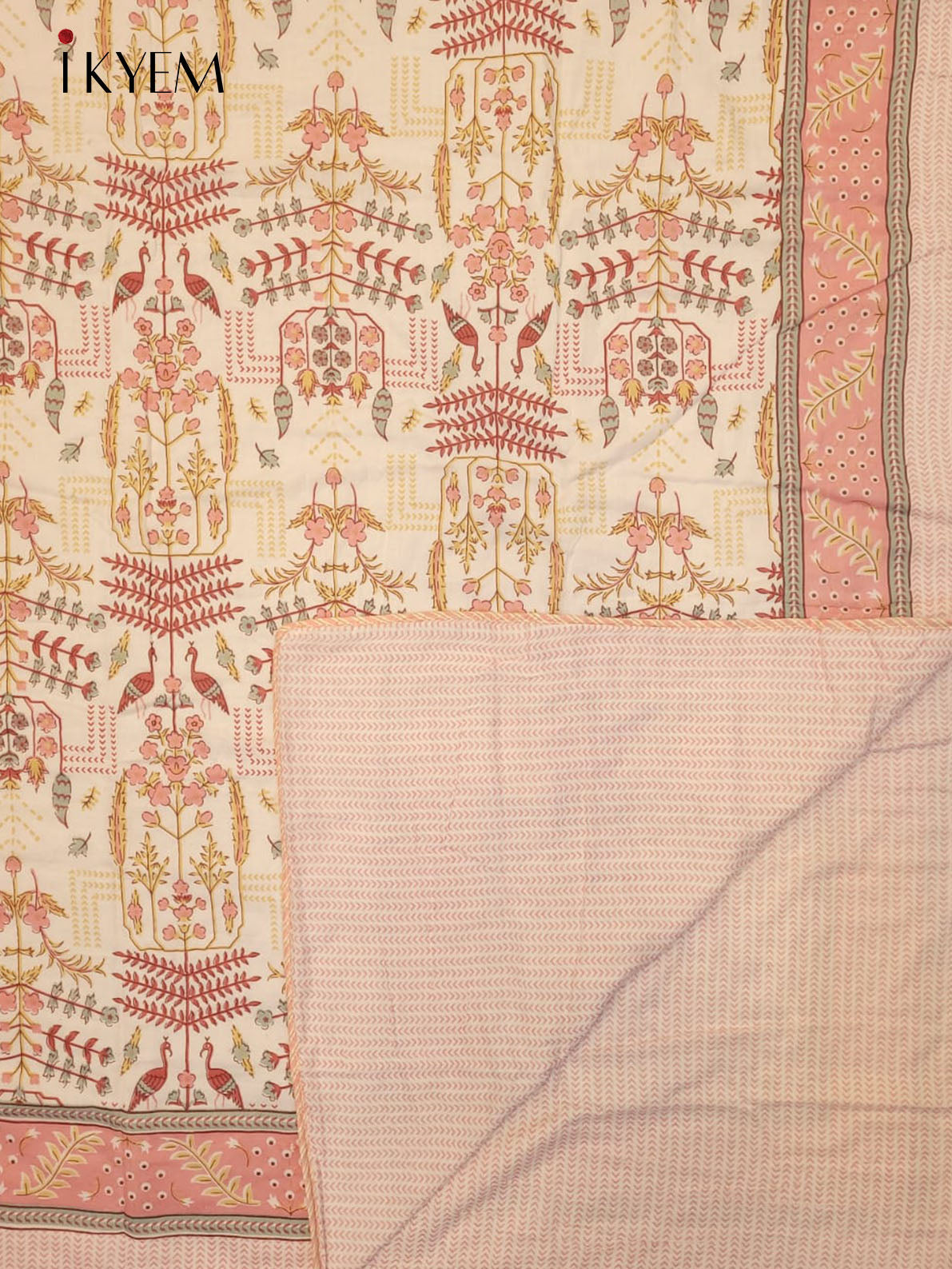 Experience the pinnacle of comfort and elegance with our Cream & Pink Jaipuri Printed Bedspread, complete with two matching pillow covers. Adorned with stunning floral designs and vibrant hues, this bedspread is crafted from high-quality cotton for the ultimate combination of style and coziness