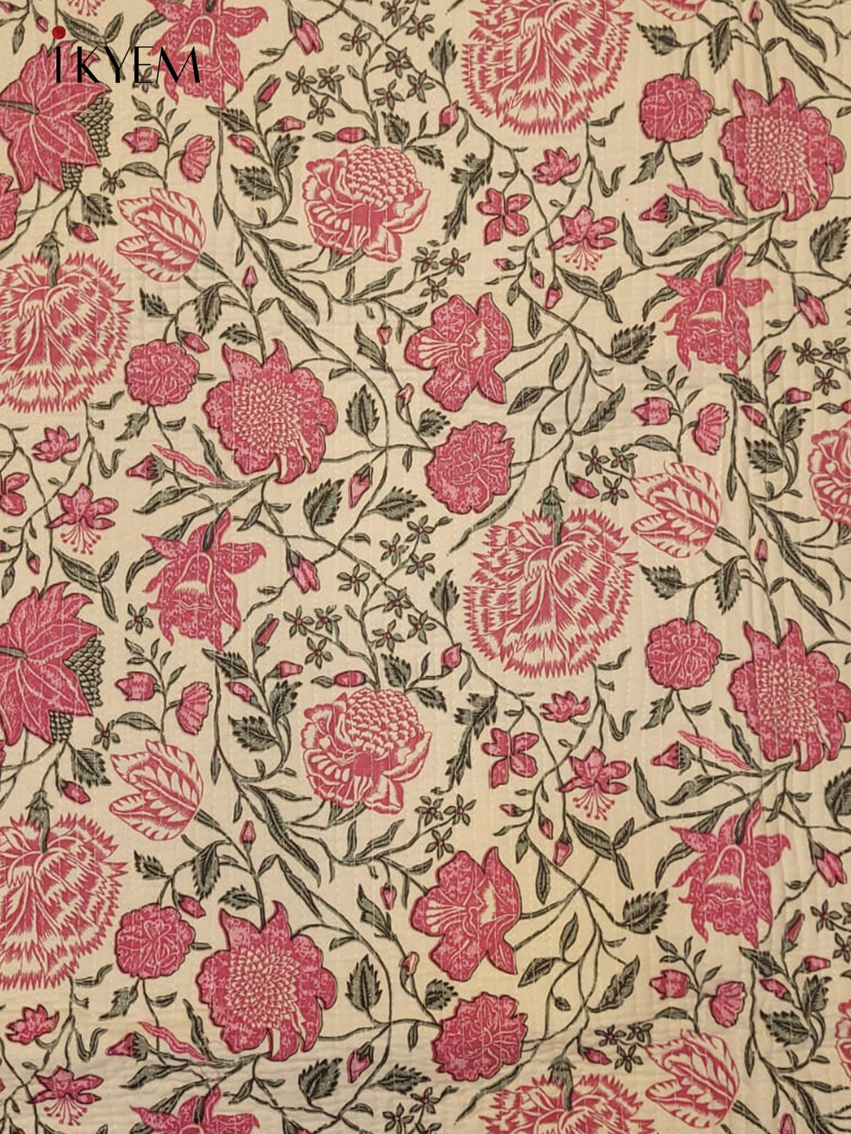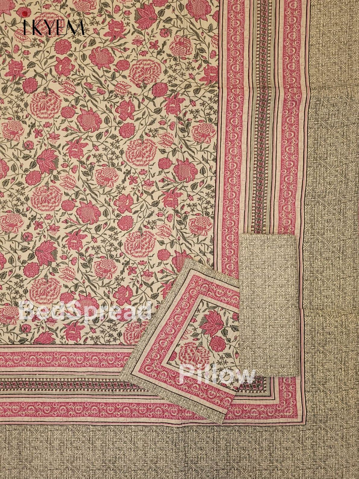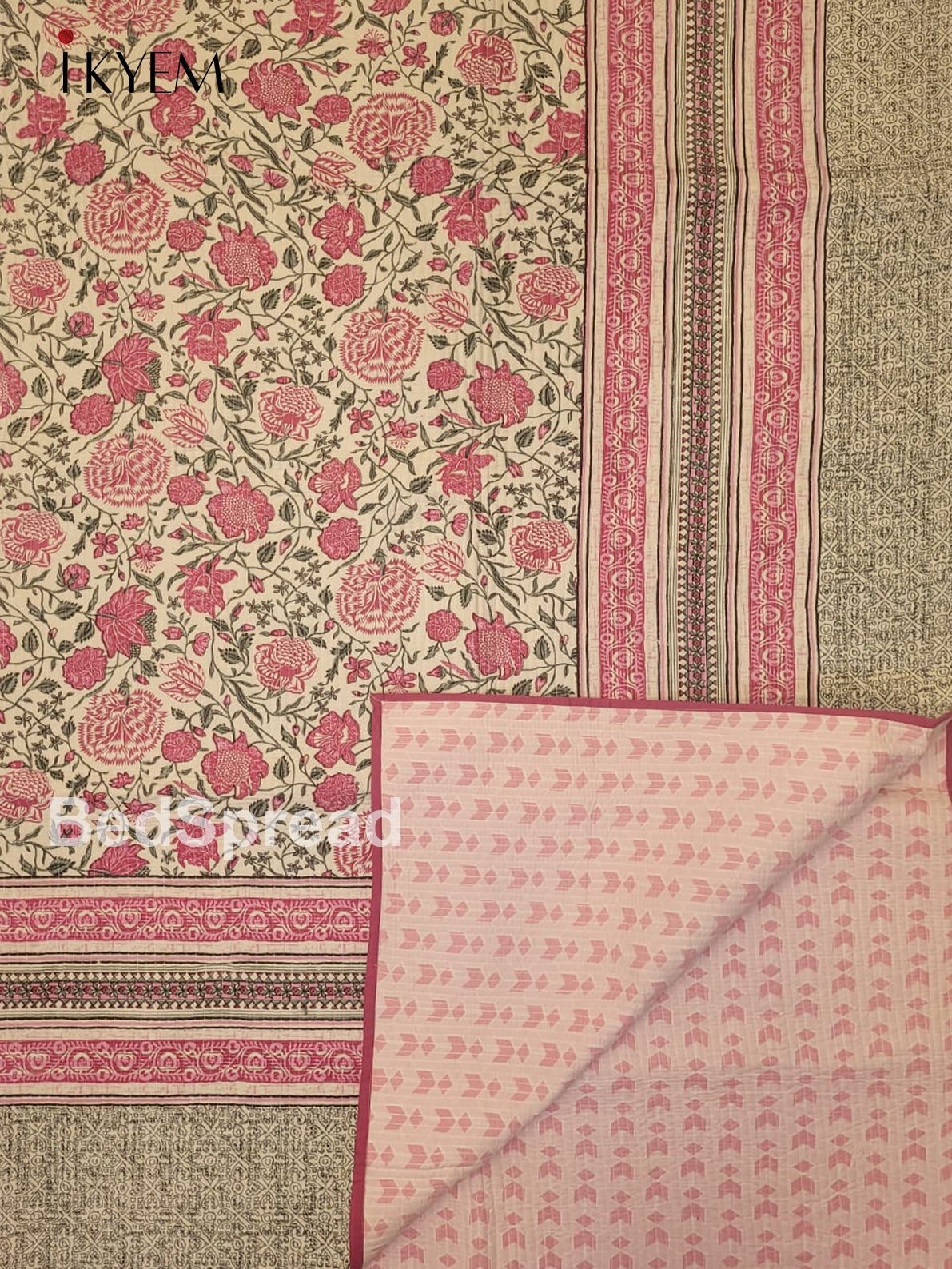 Charming Cream & Pink Printed Bedspread, complete with two matching pillow covers. Adorned with stunning floral designs and vibrant hues, this bedspread is crafted from high-quality cotton for the ultimate combination of style and coziness
