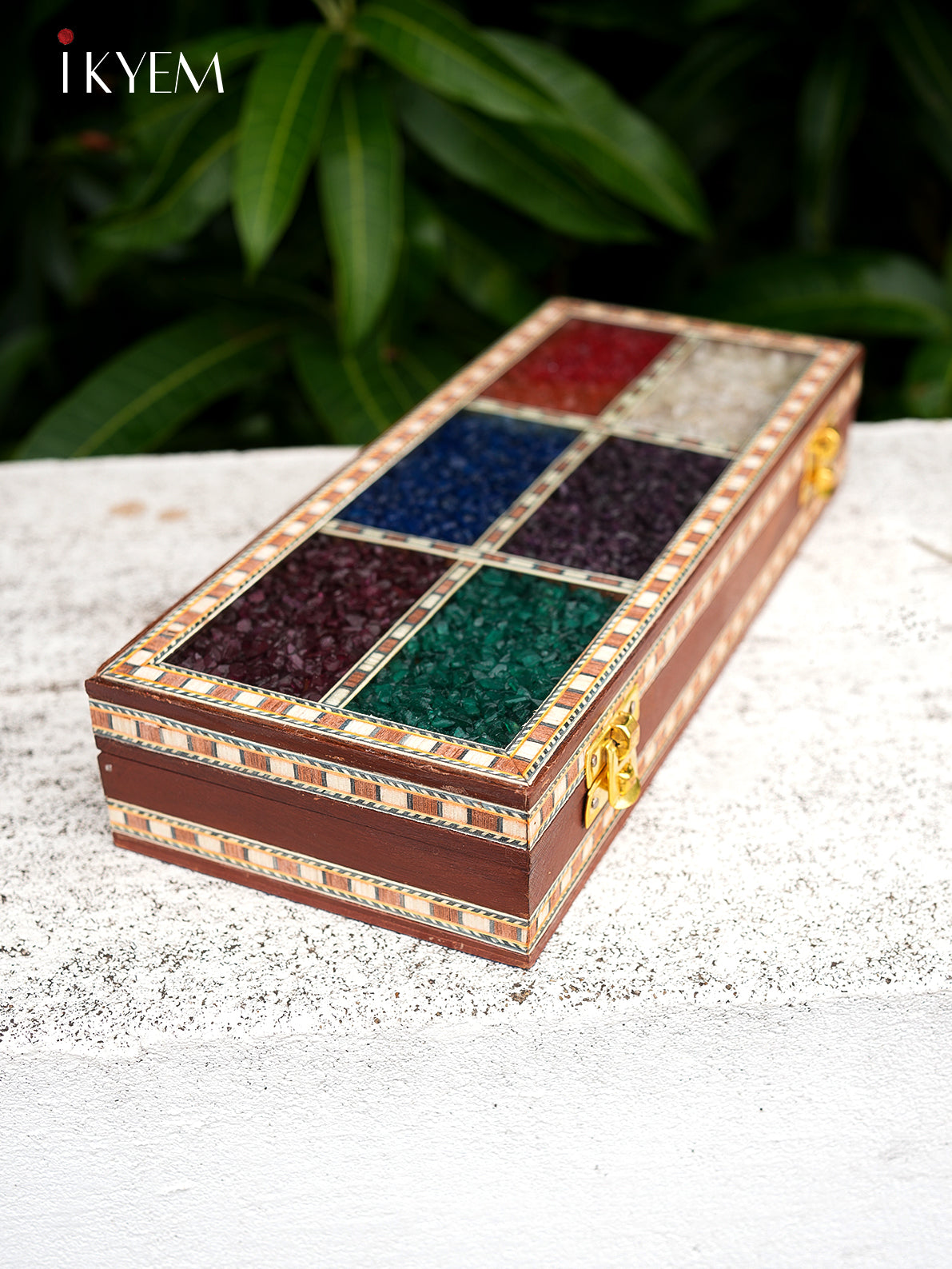 This elegant wooden storage box, crafted from premium oak, features a smooth, polished finish. Inside, a layer of natural pebbles adds a rustic charm and serves as a unique decorative touch. Ideal for organizing small items or enhancing home decor with a touch of nature.