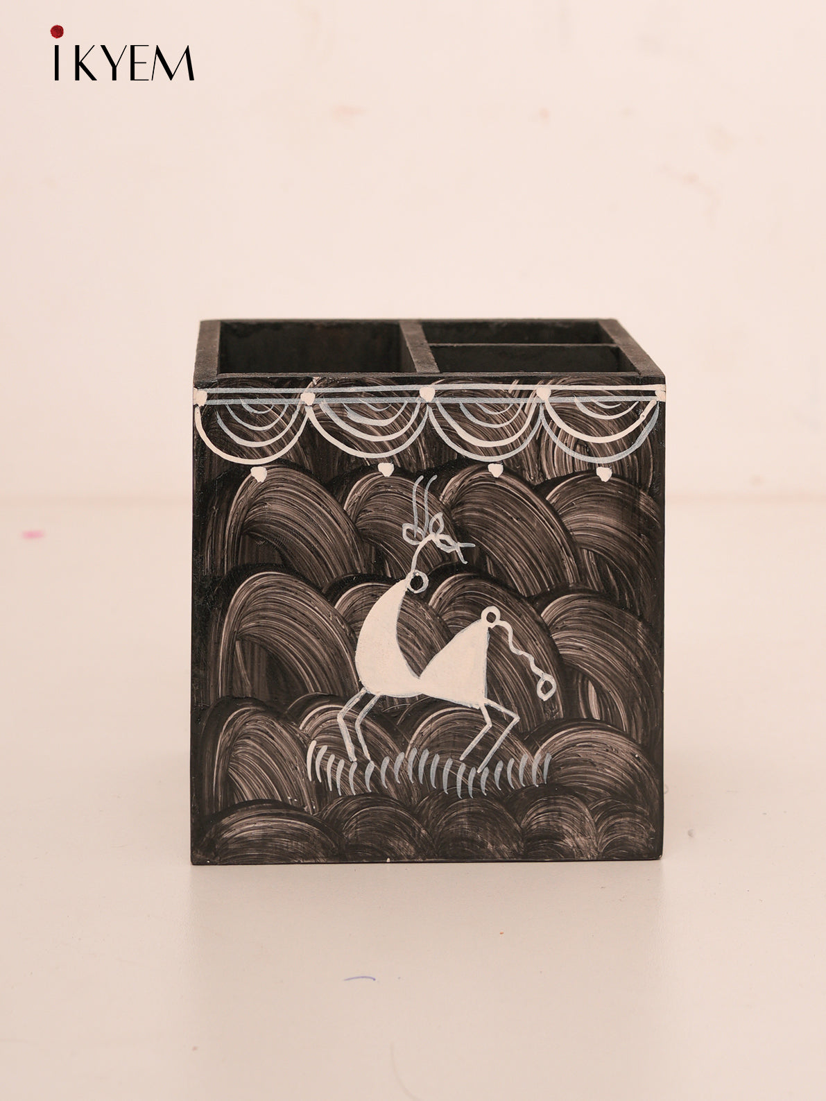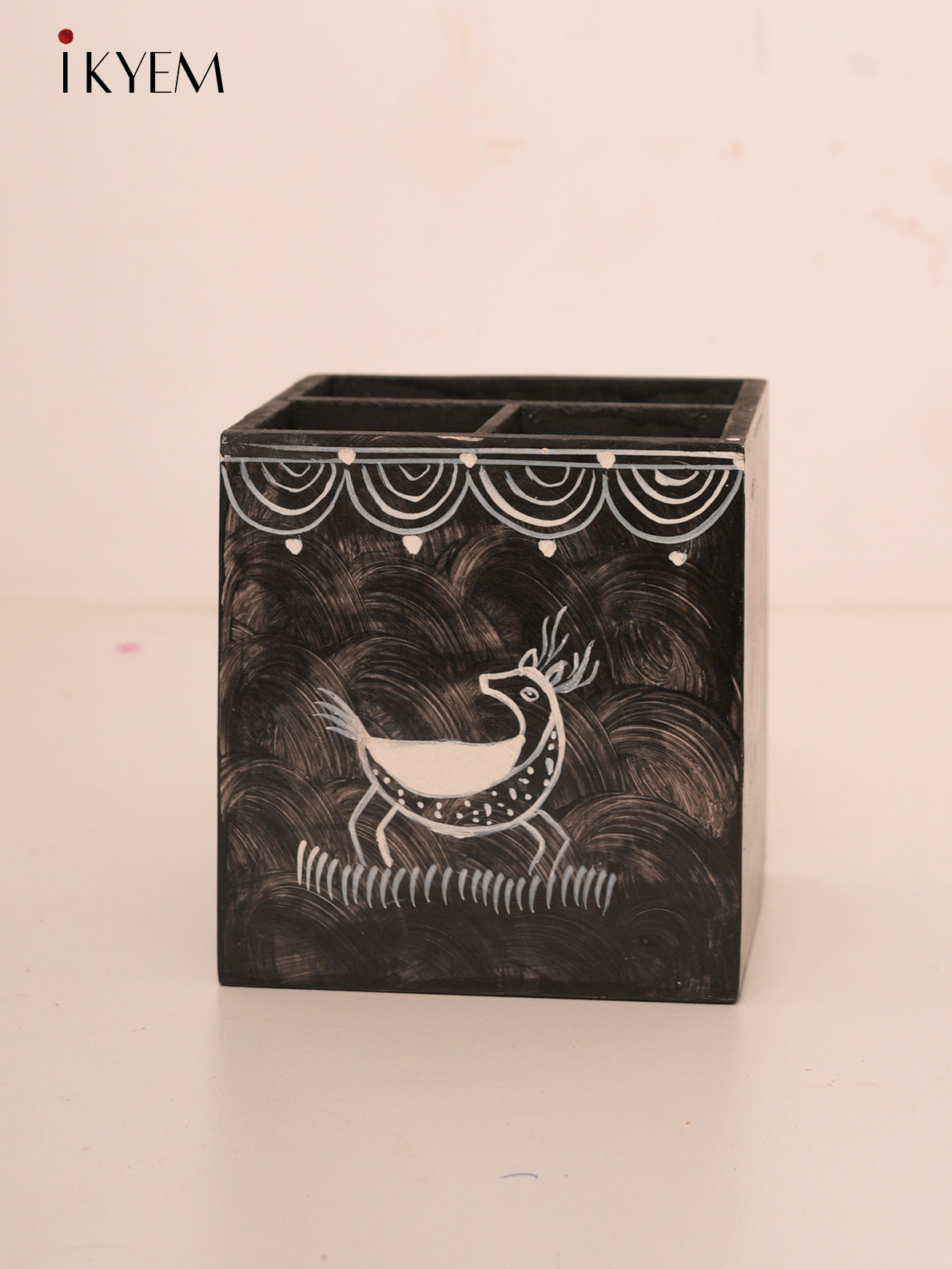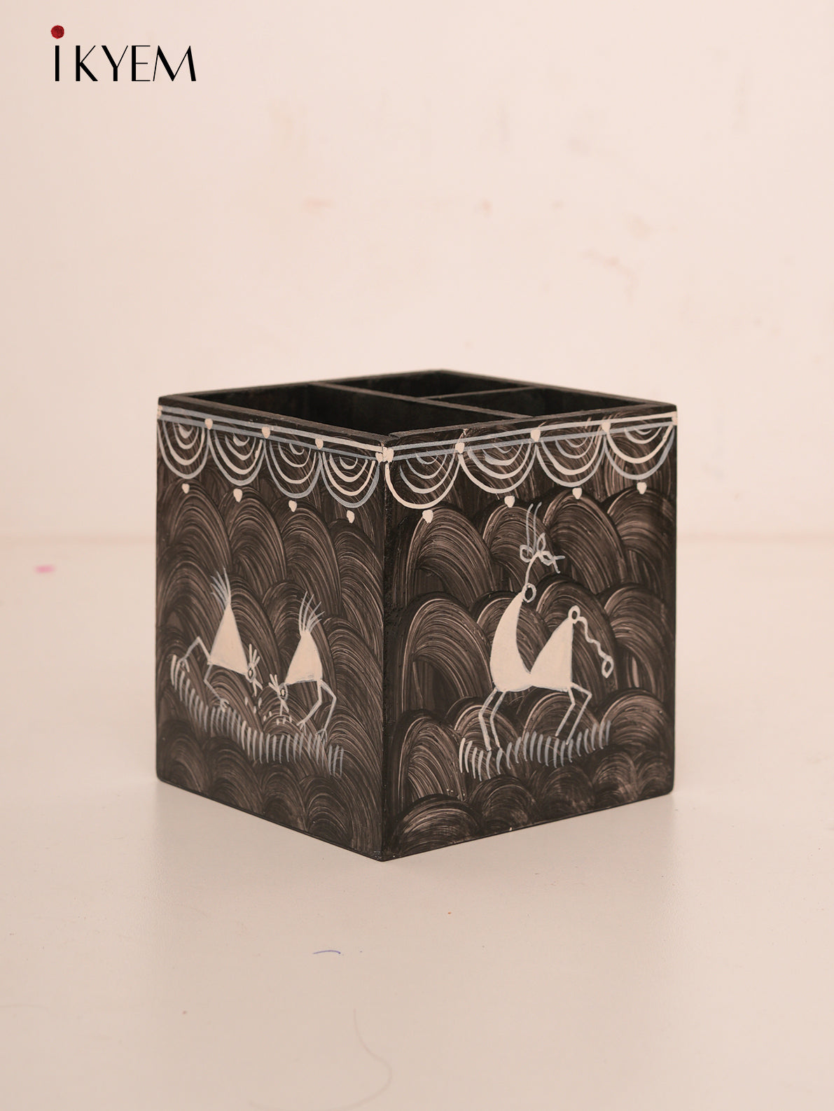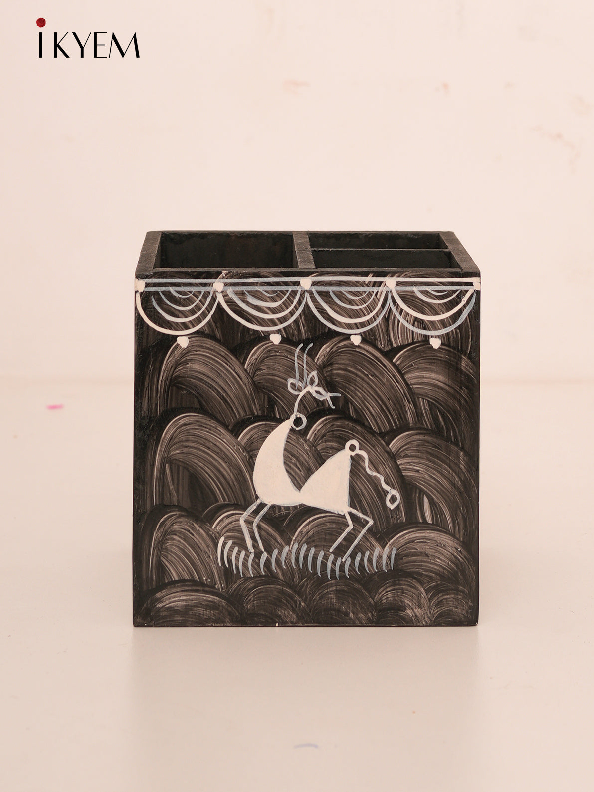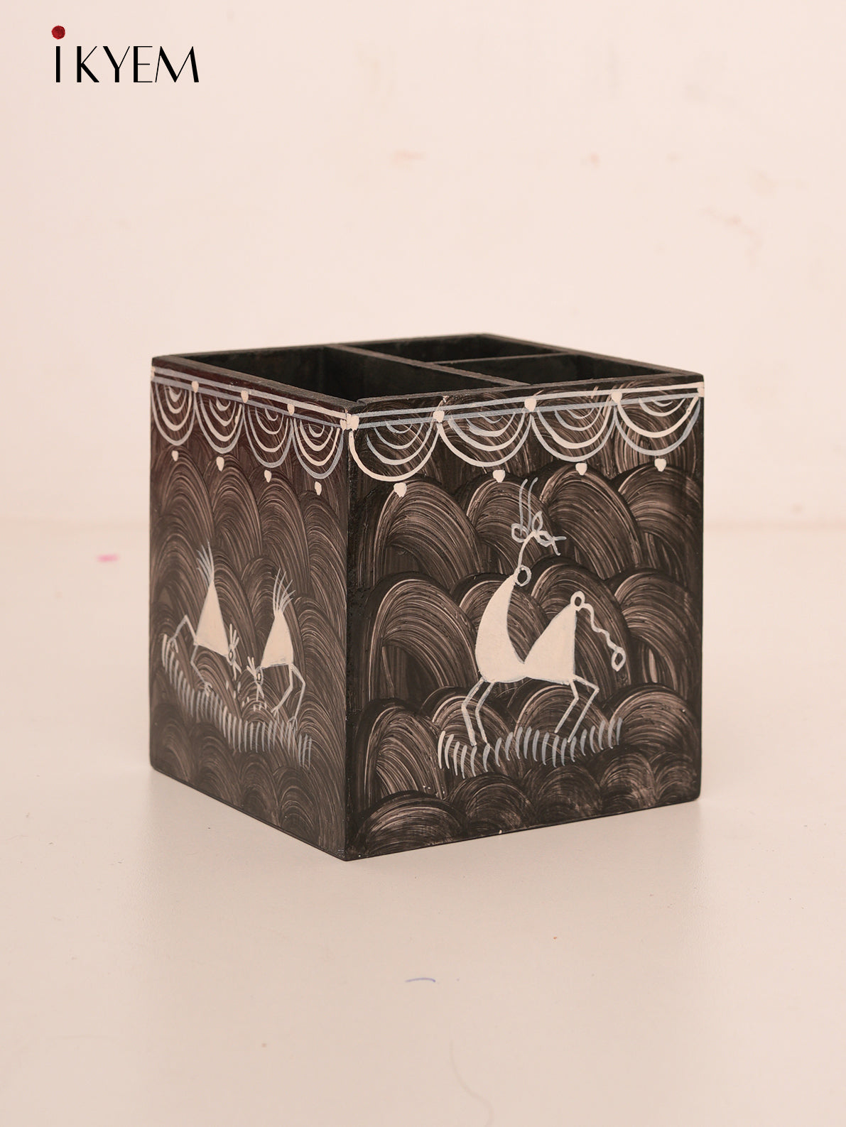 Warli painted wooden pen stand, merging traditional Indian artistry with functional elegance. Handcrafted with intricate Warli motifs, each stand is a unique testament to cultural heritage. Elevate your workspace with this blend of art and utility, perfect for organizing pens with a touch of rustic charm.