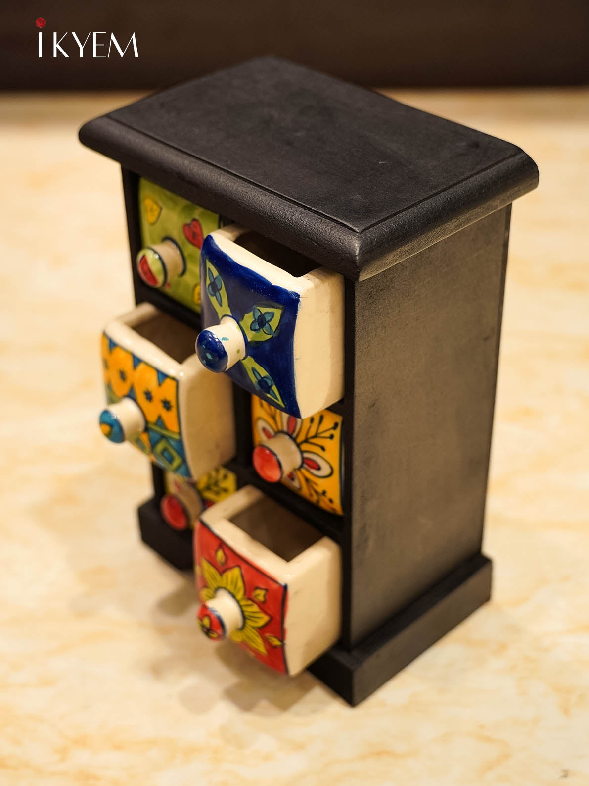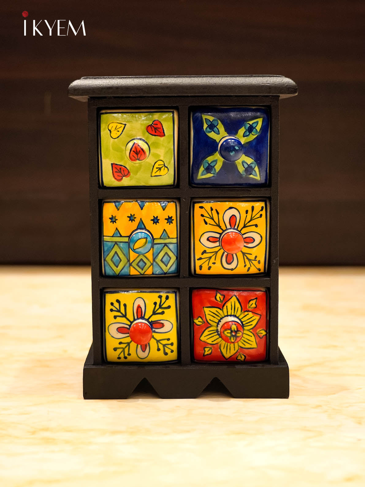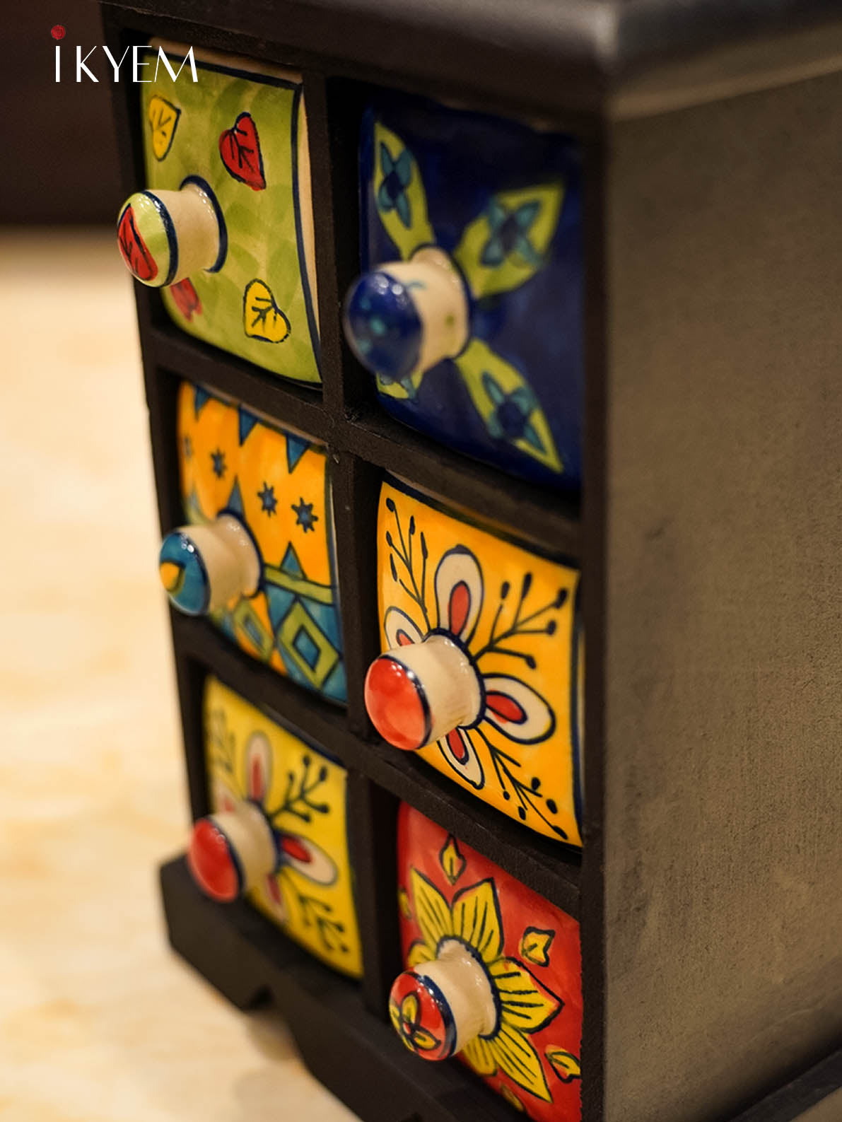 Handpainted wooden storage box with 6 Ceramic Drawers