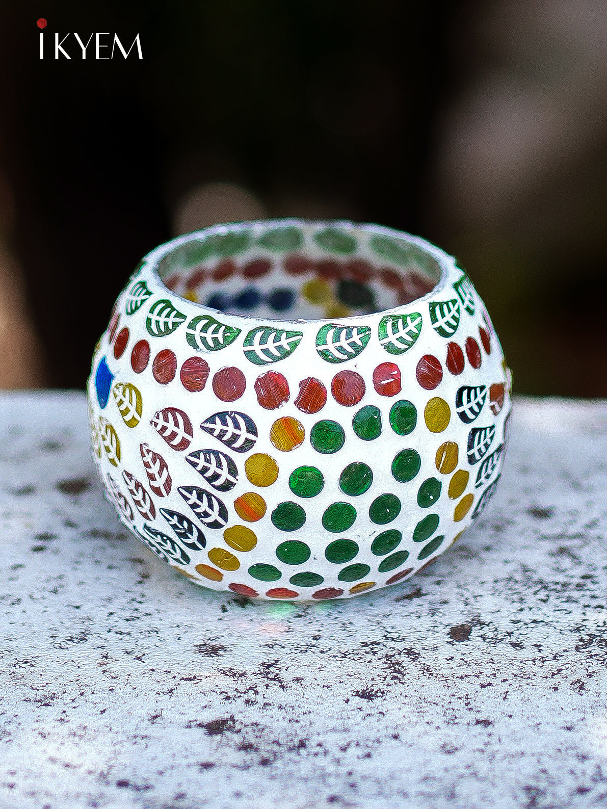 Illuminate your space with the Mosaic Glass Floral Tealight Candle Holder. Featuring a vibrant mosaic design with intricate floral patterns, this holder adds a touch of artistry and warmth to any room. Perfect for creating a cozy ambiance or as a charming decorative piece.