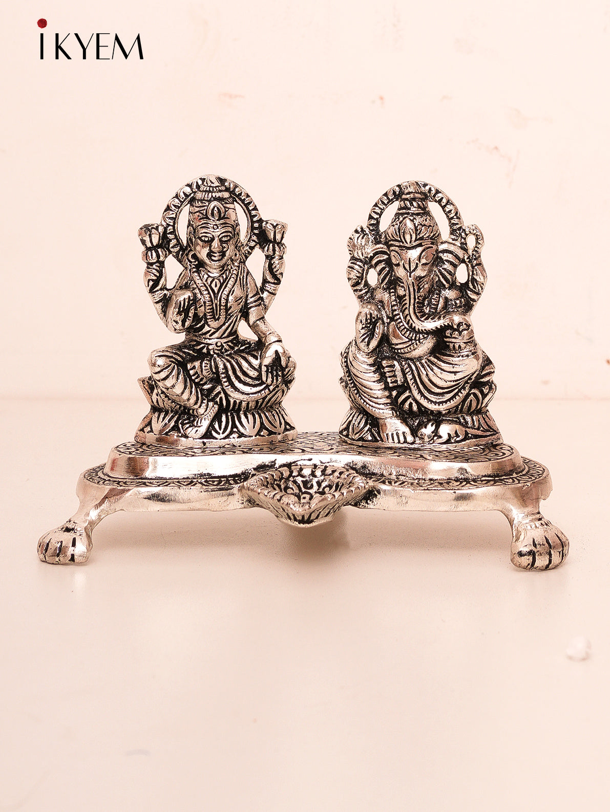 This exquisite Ganesh Lakshmi with Lamp features intricately detailed sculptures of Lord Ganesha and Goddess Lakshmi, symbolizing wisdom and prosperity. The antique finish enhances its elegance, making it a perfect addition to your home décor or altar. The integrated lamp adds a divine glow, ideal for festive and auspicious occasions.