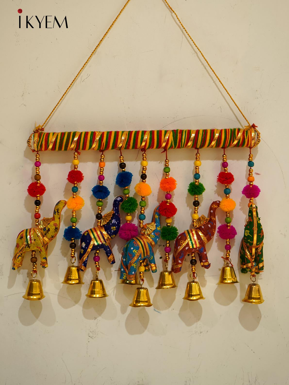 This Handcrafted cloth elephant wall hanging features vibrant fabric and intricate zari lace, adding a touch of traditional charm to any space. Each elephant is adorned with a decorative bell, creating a soothing sound with movement.