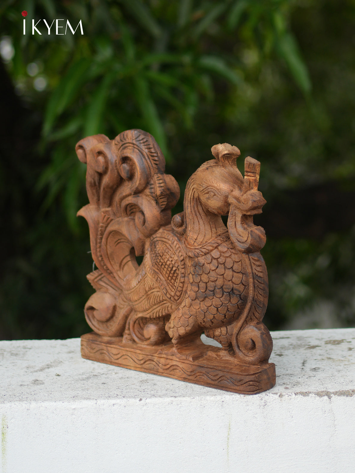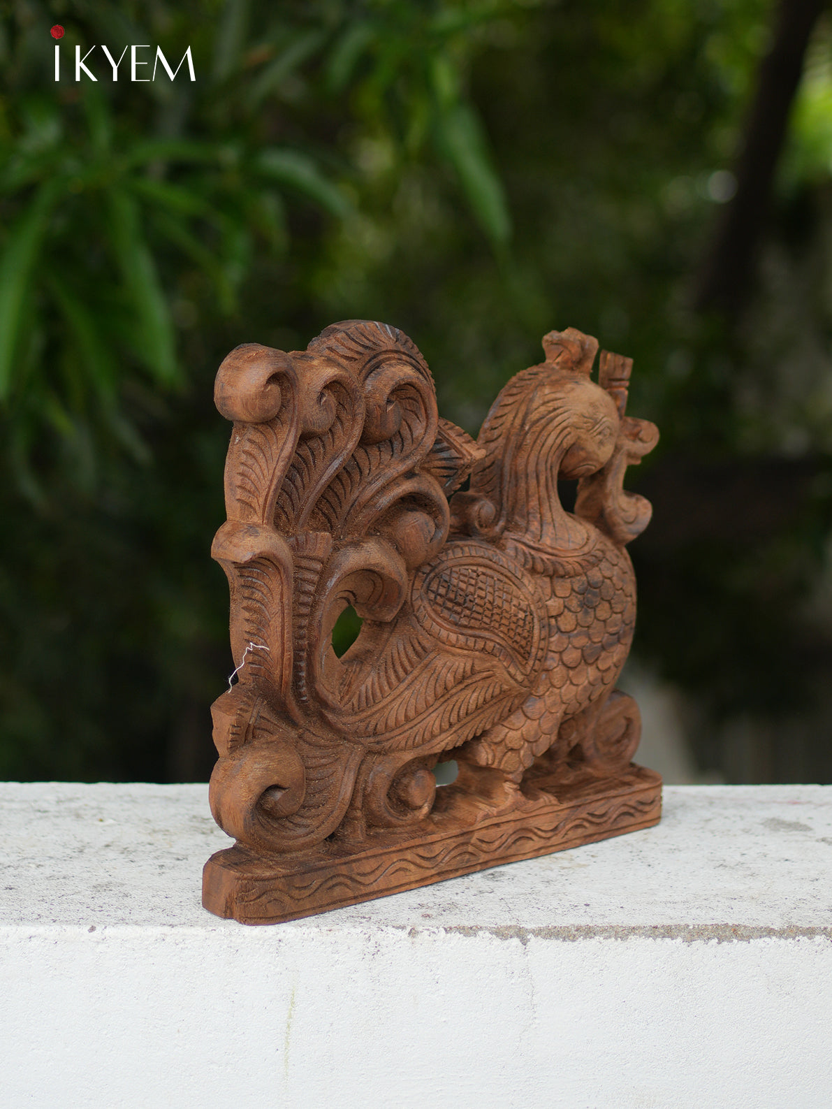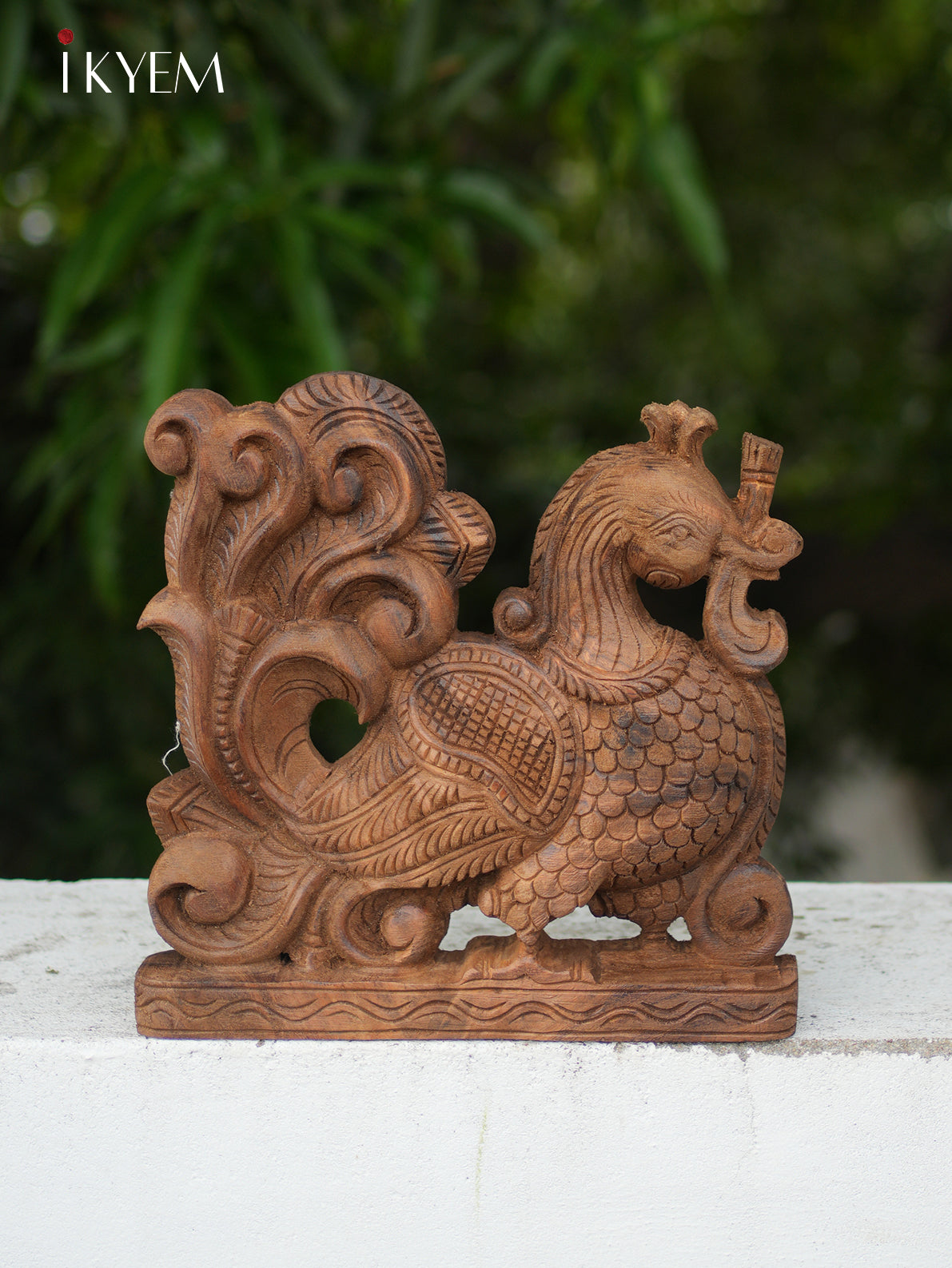 This stunning wooden wall hanging is a true masterpiece of Indian craftsmanship. The piece features a beautifully carved peacock, a symbol of beauty, grace, and good luck. The intricate details, including the peacock's feathers, beak, and eyes, are meticulously carved, showcasing the skill and artistry of the craftsman.