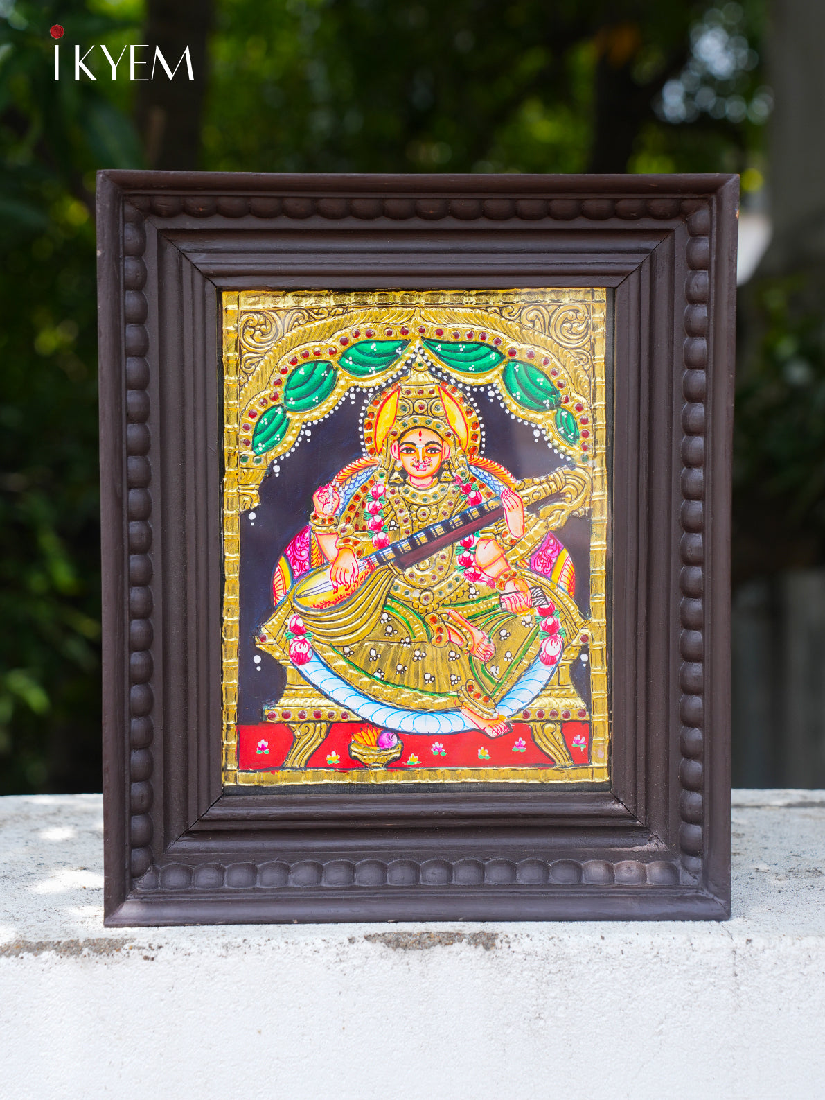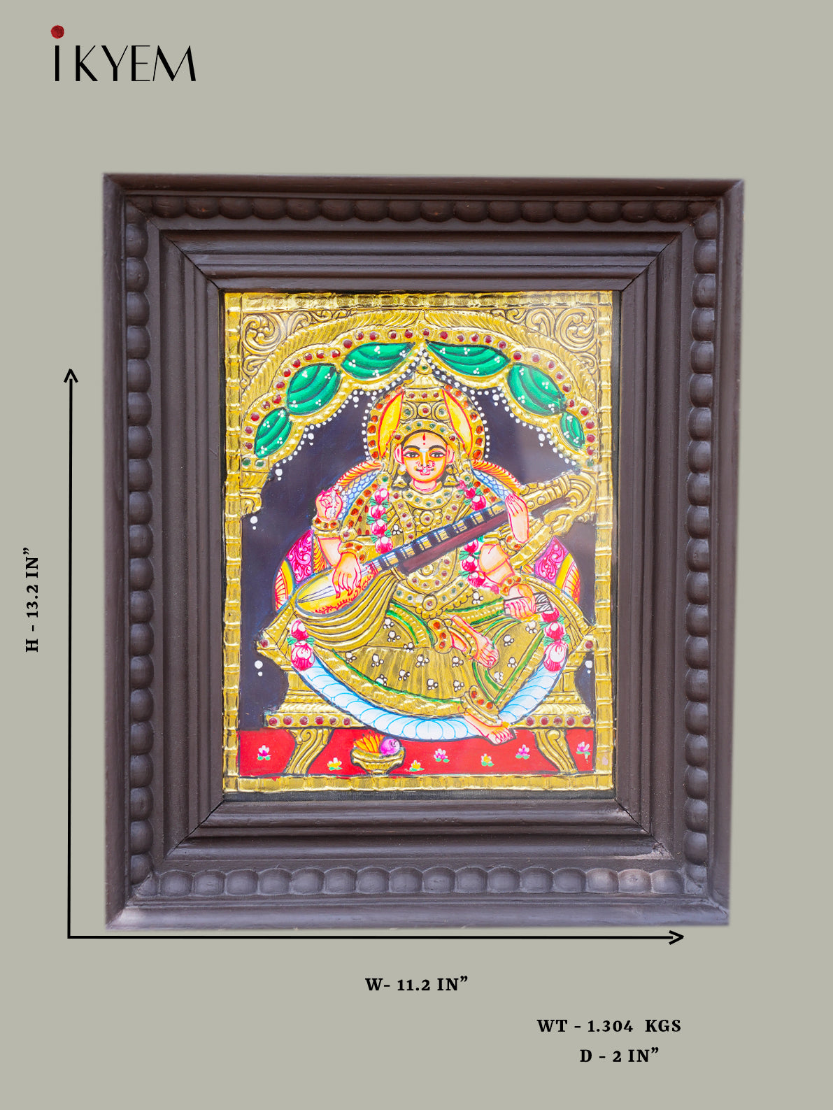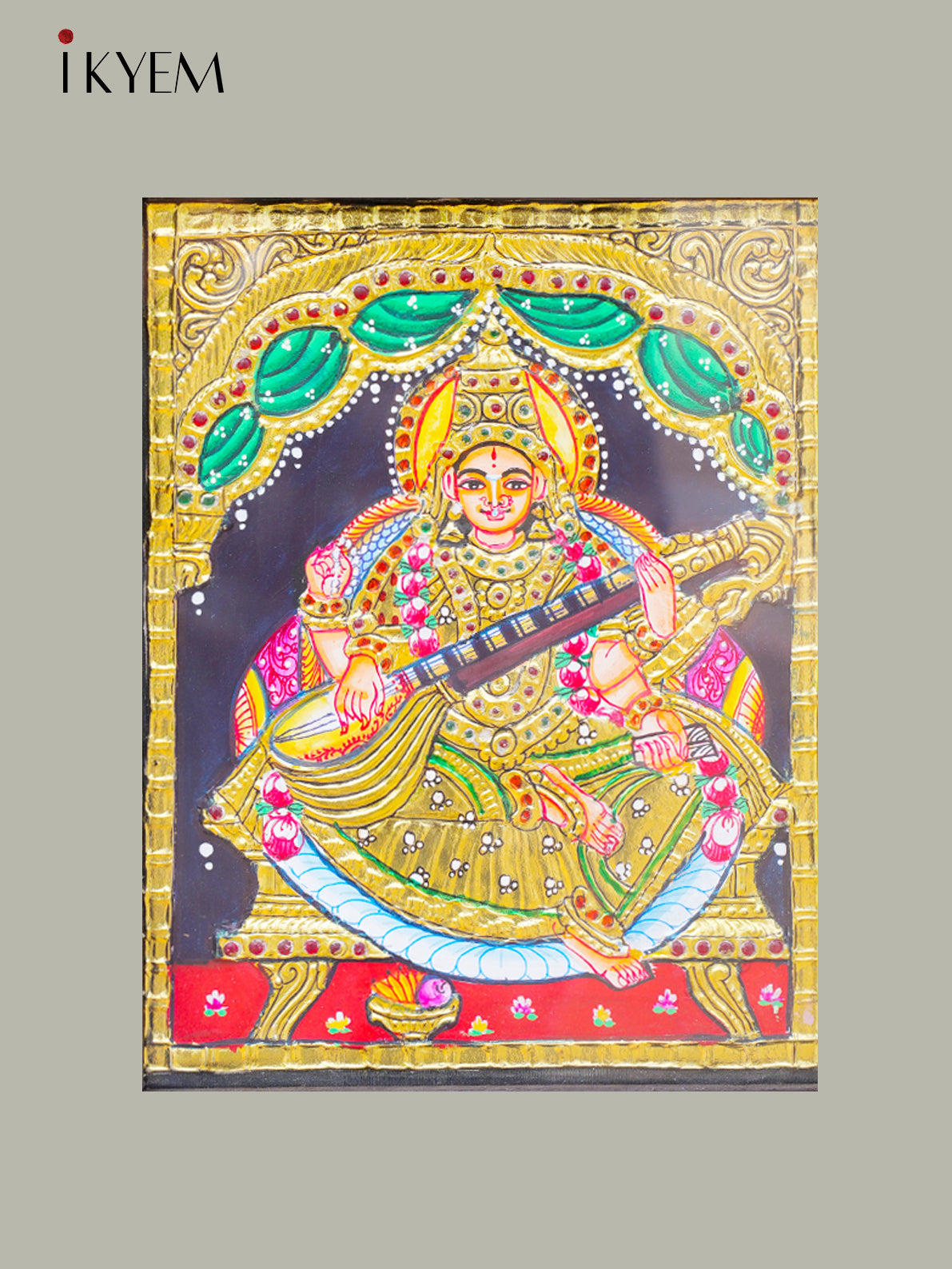 This exquisite Tanjore painting depicts Goddess Saraswati, the embodiment of knowledge, music, and arts, beautifully adorned in intricate golden embellishments. The vibrant colors and meticulous detailing capture her serene grace and divine aura, making it a perfect centerpiece for any spiritual or artistic space. Handcrafted by skilled artisans, this painting is a timeless representation of cultural heritage and devotion.