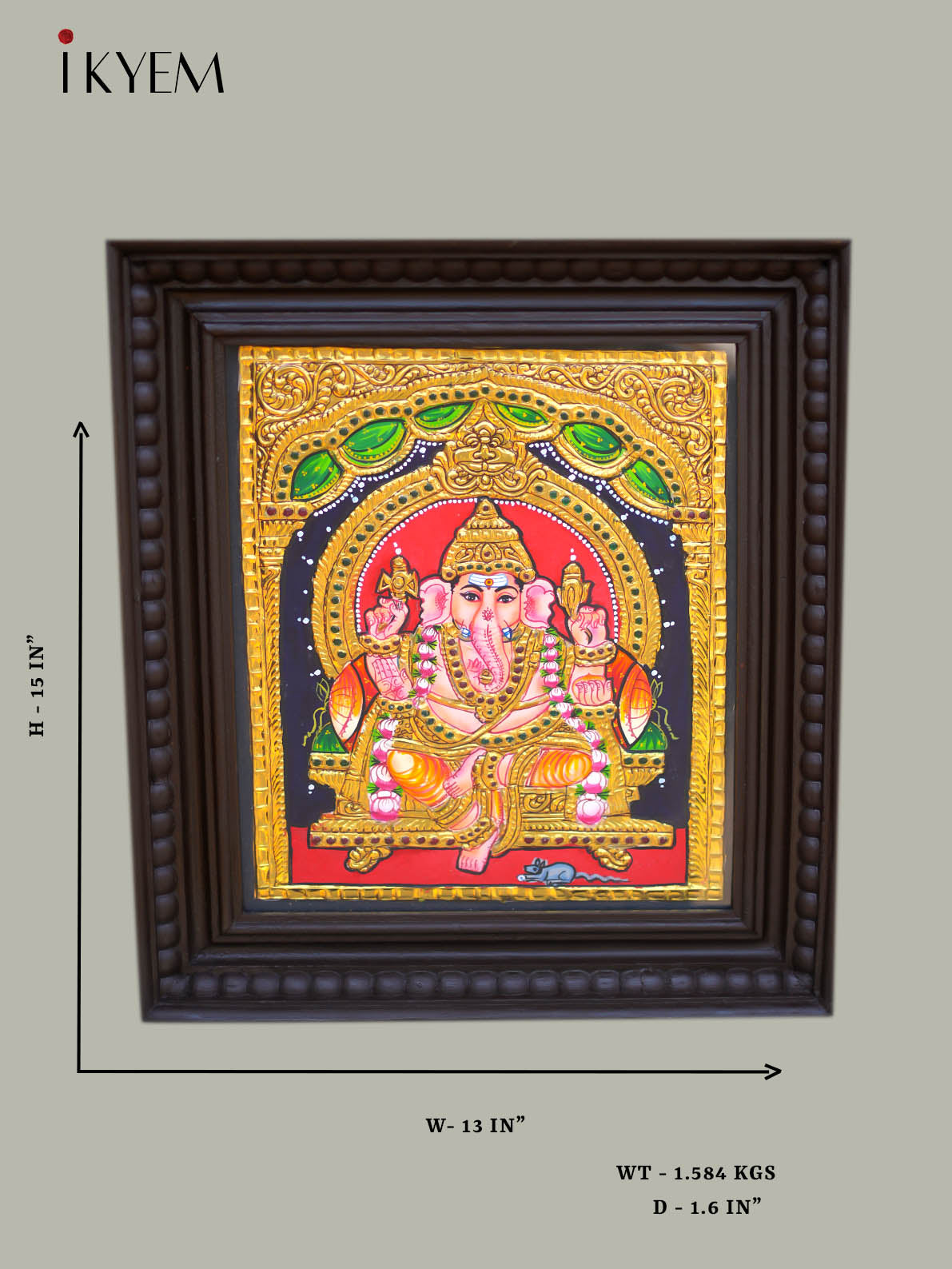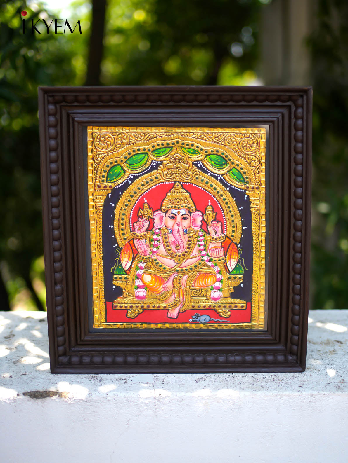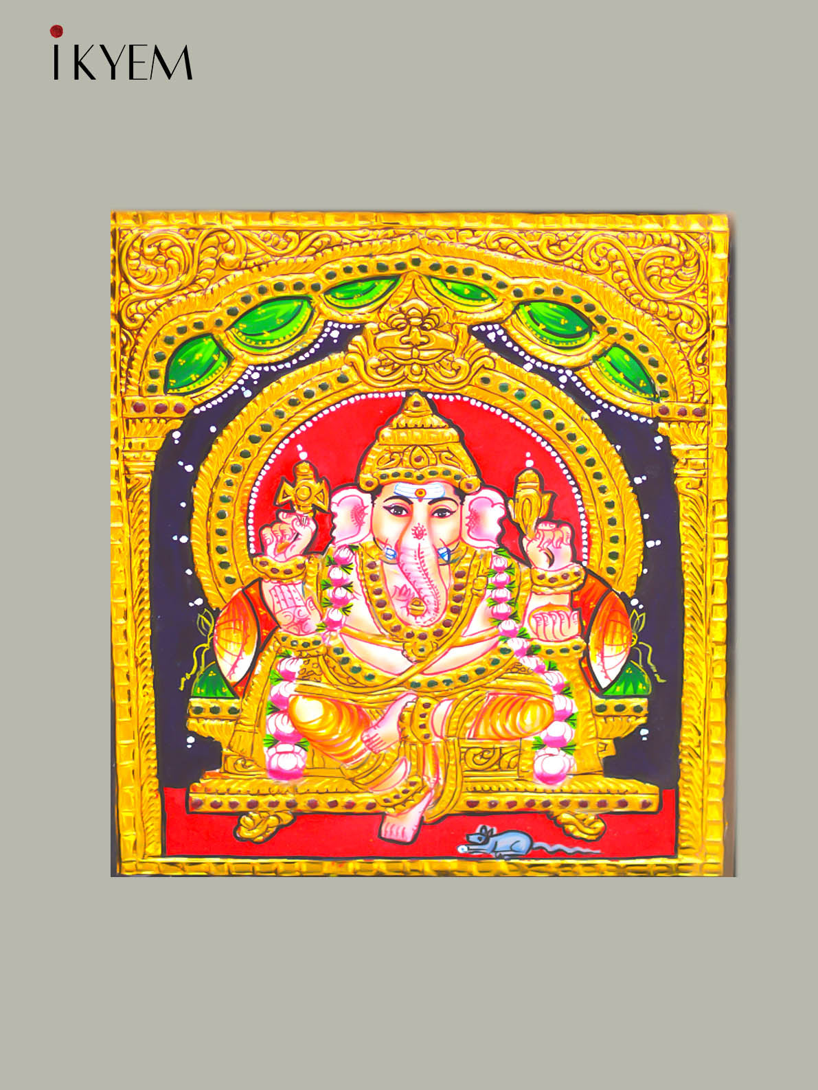 This exquisite Ganesha Tanjore painting showcases the deity in vibrant hues, adorned with intricate gold leaf work that highlights traditional craftsmanship. Set against a richly colored background, Lord Ganesha is depicted in a seated pose, symbolizing wisdom, prosperity, and protection. Perfect for enhancing spiritual ambiance, this artwork is ideal for home or office decor.
