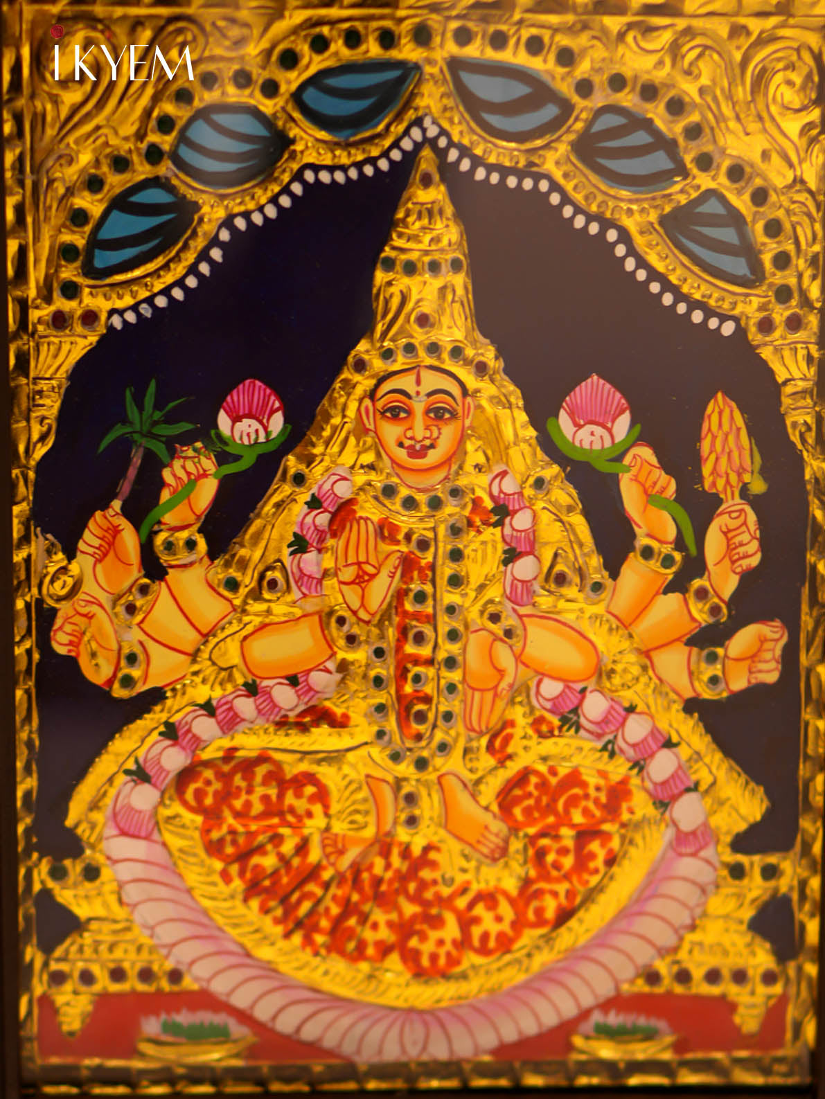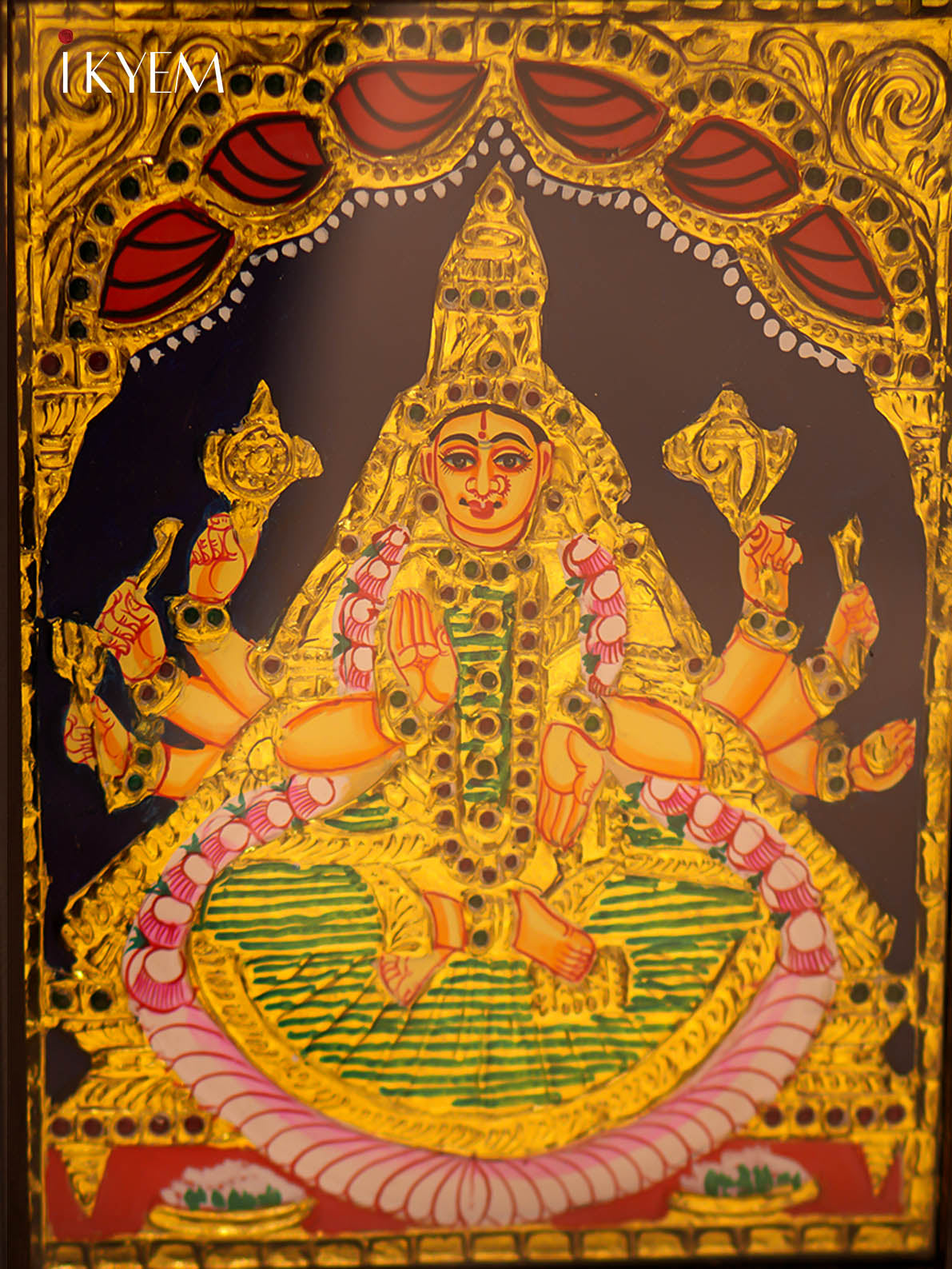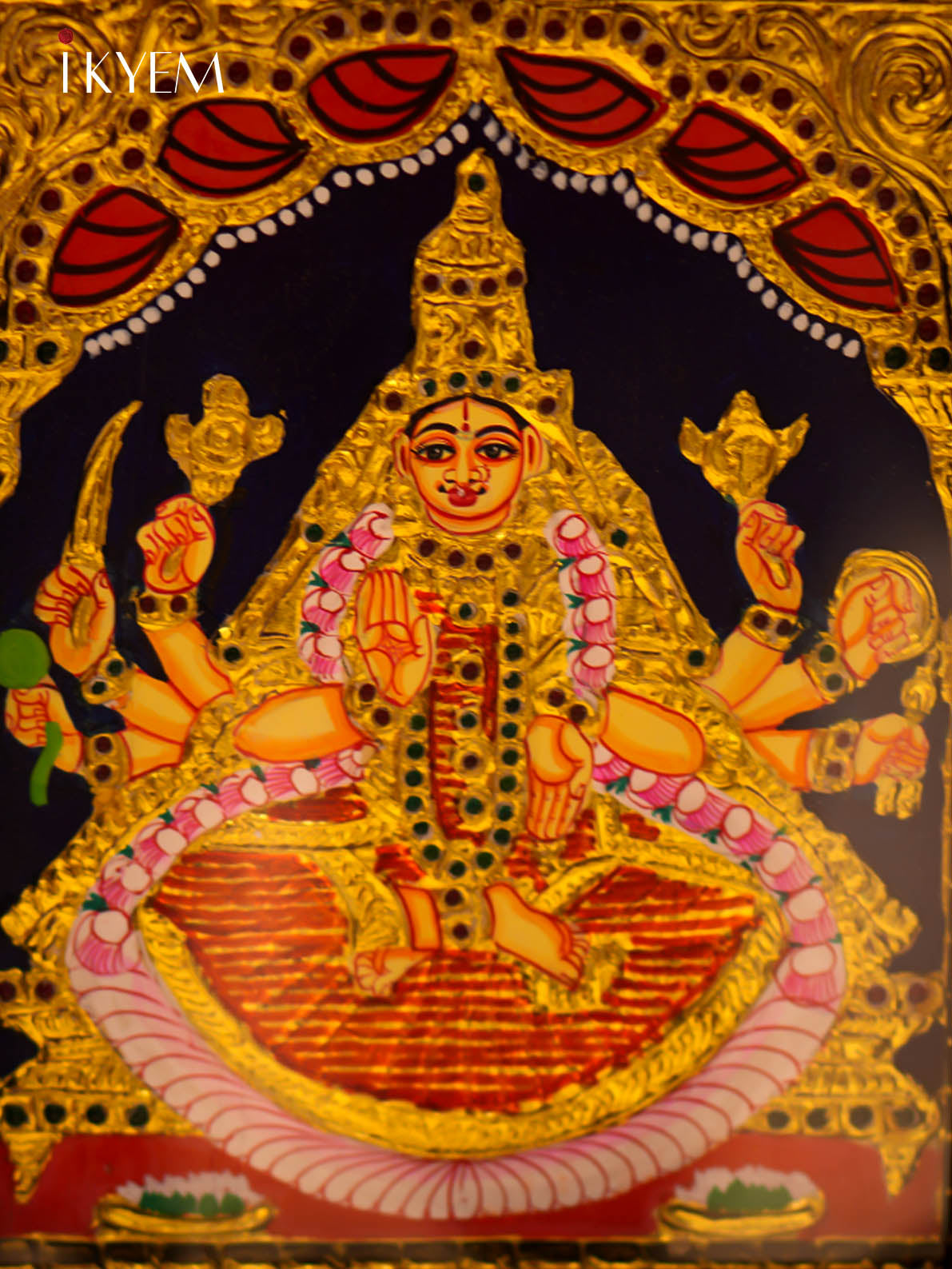 This exquisite Tanjore painting of Astalakshmi, showcases intricate craftsmanship and vibrant colors. The artwork depicts the goddess Astalakshmi with traditional embellishments, adding a touch of divine elegance to any space. Perfect for enhancing the spiritual ambiance of your home.