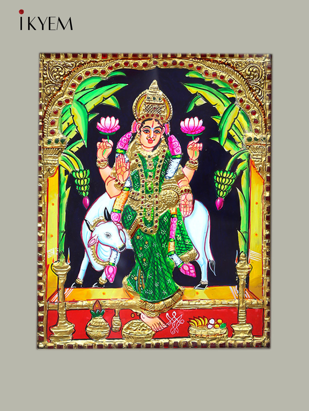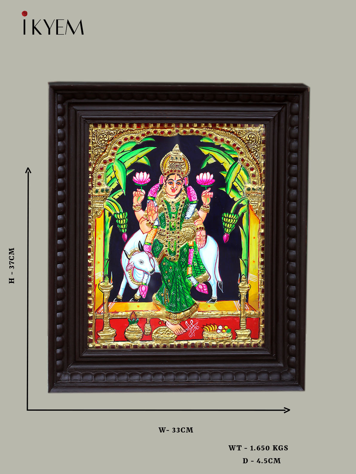 This exquisite Tanjore painting of Goddess Gruha Lakshmi radiates traditional beauty with intricate gold foil detailing and vibrant colors. Depicting the goddess of wealth and prosperity, it serves as a symbol of blessings and abundance for the home. Handcrafted on a wooden panel, it showcases the rich cultural heritage of South Indian art.