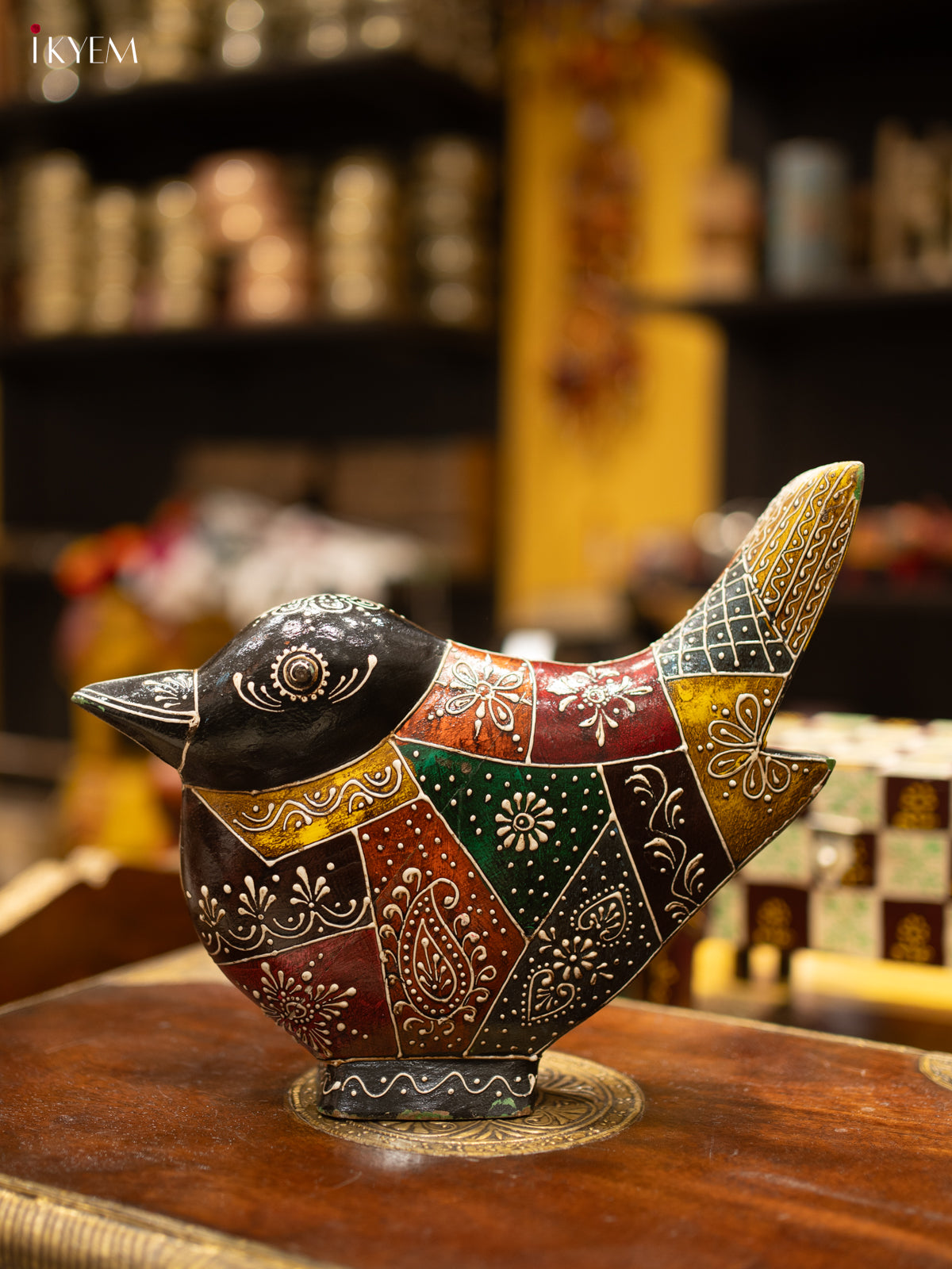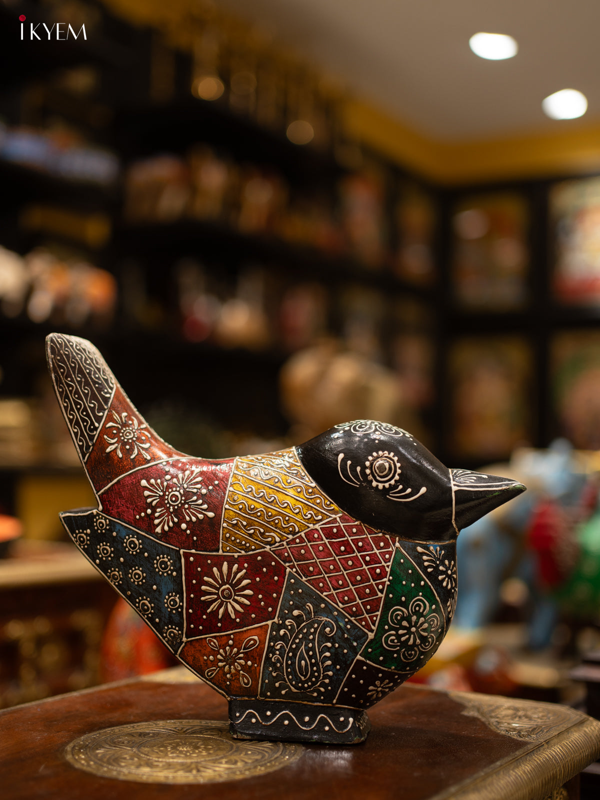 This whimsical wooden bird figurine is a delightful addition to any home decor. Hand-painted with intricate details and vibrant colors, this piece is a testament to the skill and artistry of the craftsmen. The bird's body is adorned with colorful patterns, including geometric shapes, floral motifs, and beadwork, creating a visually stunning piece.