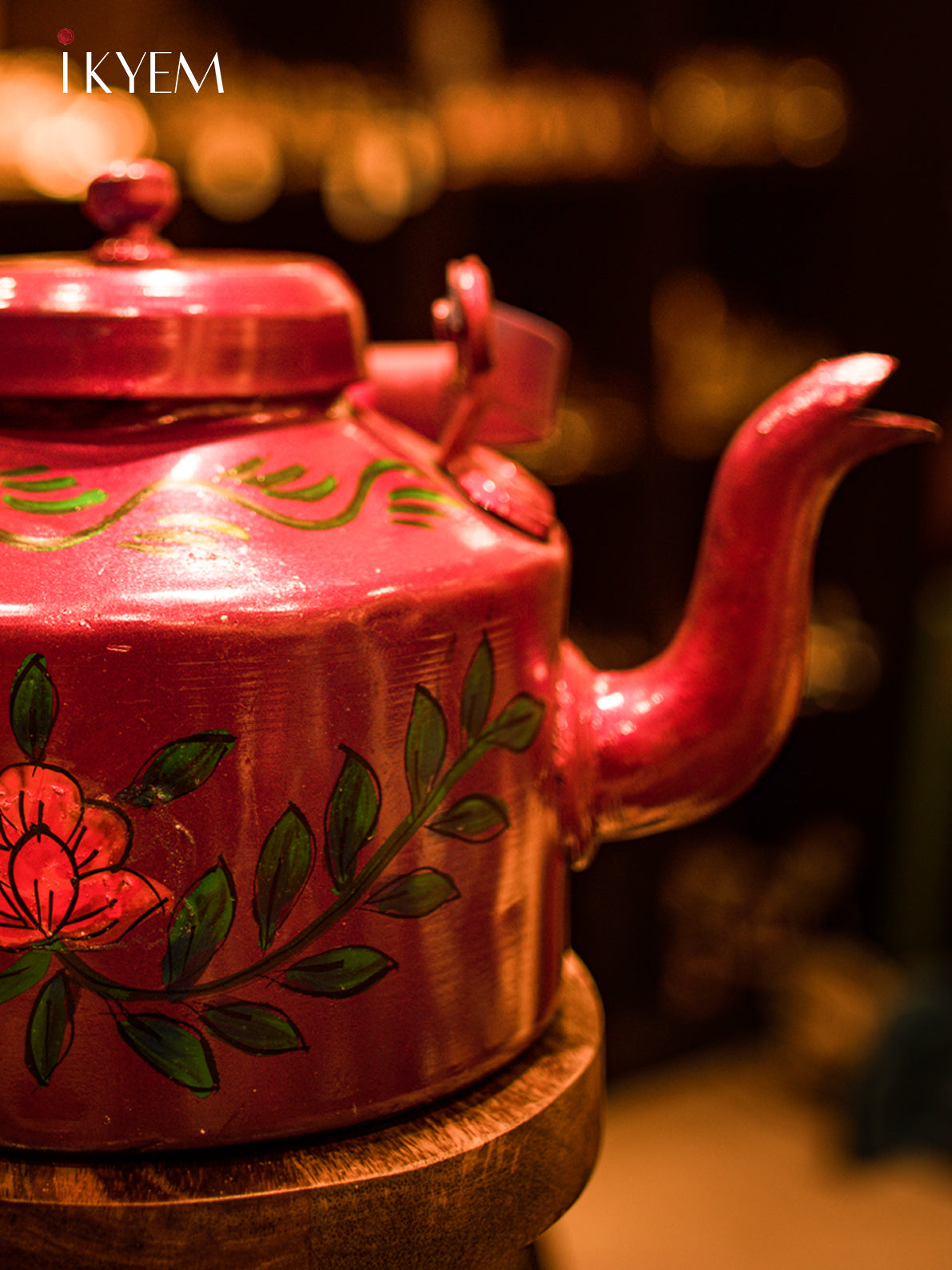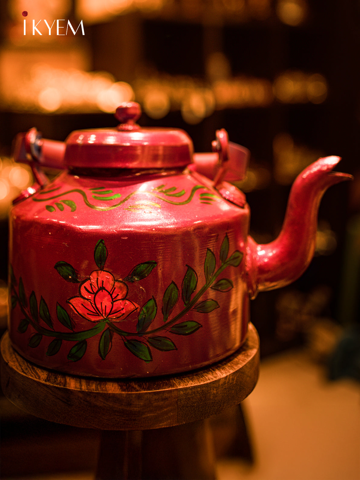 This vibrant kettle is a piece of Indian folk art, hand-painted with a deep red base and intricate floral designs in green and pink. The floral pattern, featuring delicate leaves and a beautiful rose, adorns the body of the kettle, creating a visually stunning piece. The lid is painted with a matching red color and features a small spout for pouring. This kettle is perfect for adding a touch of color and culture to any kitchen or home decor. It can be used as a functional piece or as a decorative display.
