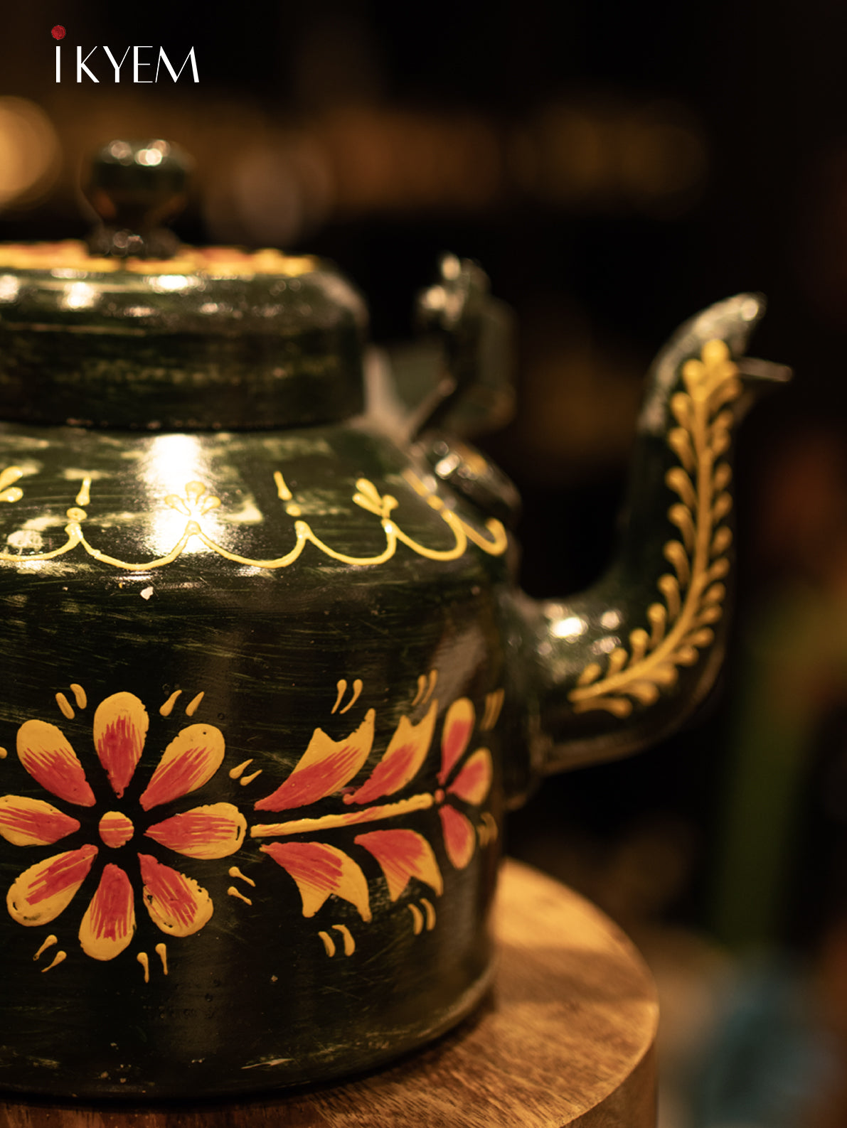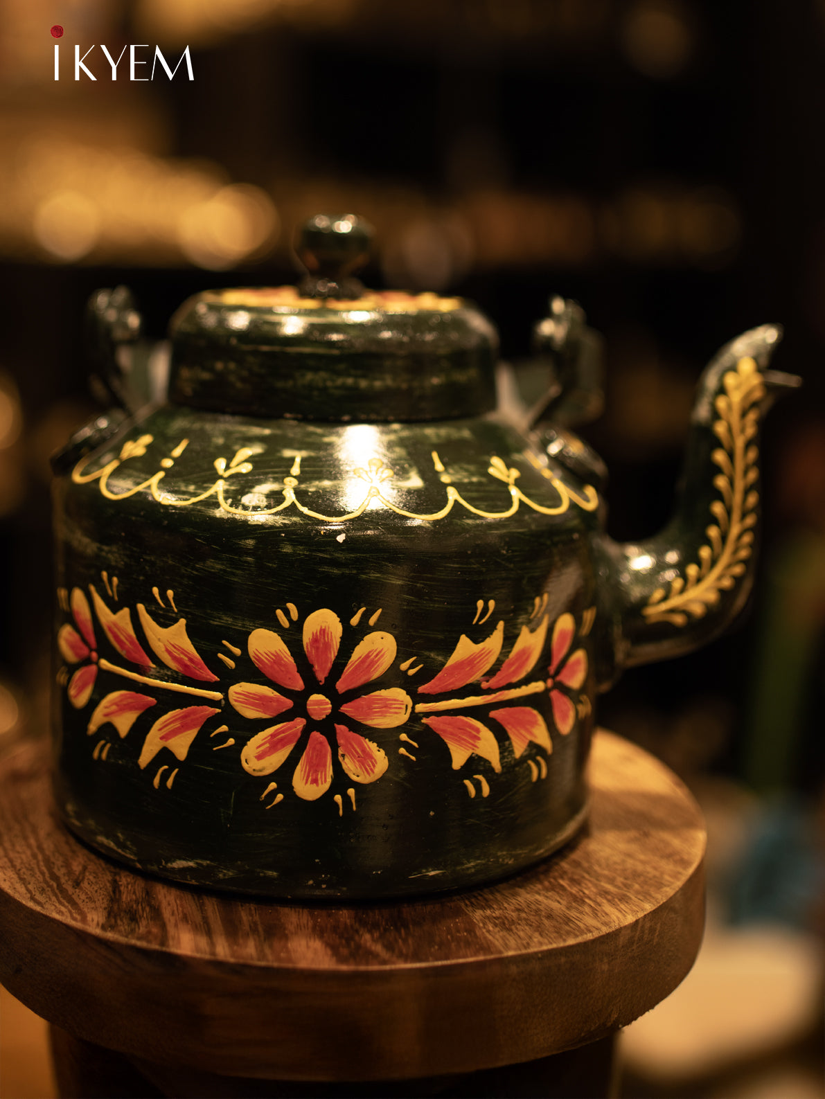 This elegant kettle is a beautiful piece of Indian folk art, hand-painted with a dark green base and intricate floral designs in red and yellow. The floral pattern, featuring delicate leaves and vibrant flowers, adorns the body of the kettle, creating a visually stunning piece. The lid is painted with a matching green color and features a small spout for pouring. This kettle is perfect for adding a touch of sophistication and culture to any kitchen or home decor. It can be used as a functional piece or as a decorative display.