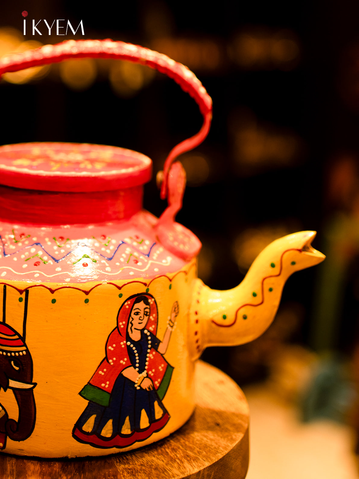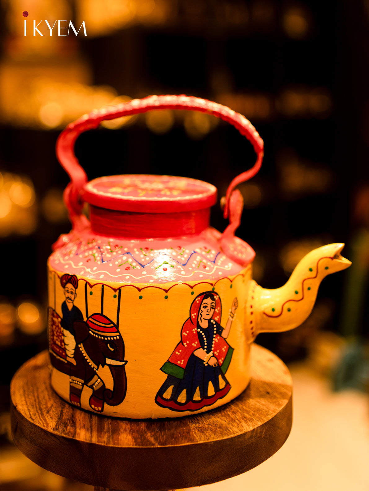 This beautiful kettle is a piece of Indian folk art, hand-painted with vibrant colors and intricate designs. The body of the kettle is made of metal and features a scene of a man riding an elephant and a woman in traditional attire. The lid is painted with a floral pattern and has a small spout for pouring. The kettle is a great addition to any kitchen or home decor and can be used as a functional piece or a decorative display.
