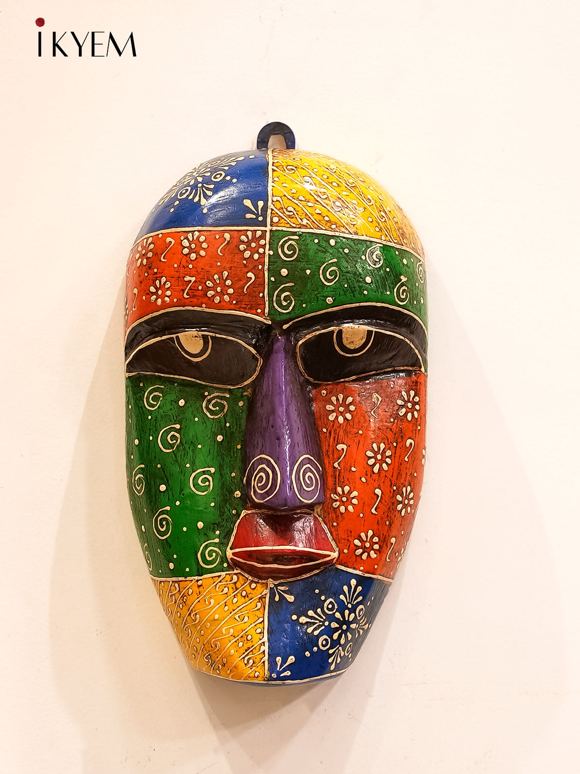 This handcrafted wooden tribal face mask showcases intricate carvings and vibrant colors, reflecting traditional artistry. Its bold, expressive features represent cultural symbolism and spirituality. Perfect as wall décor, it adds a rustic and ethnic charm to any space.