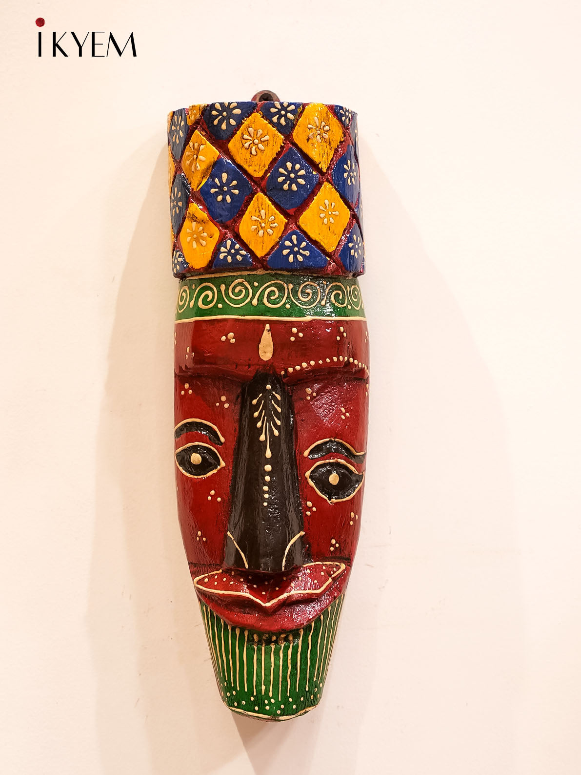 This handcrafted wooden tribal face mask showcases intricate carvings and vibrant colors, reflecting traditional artistry. Its bold, expressive features represent cultural symbolism and spirituality. Perfect as wall décor, it adds a rustic and ethnic charm to any space.