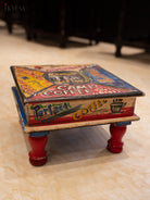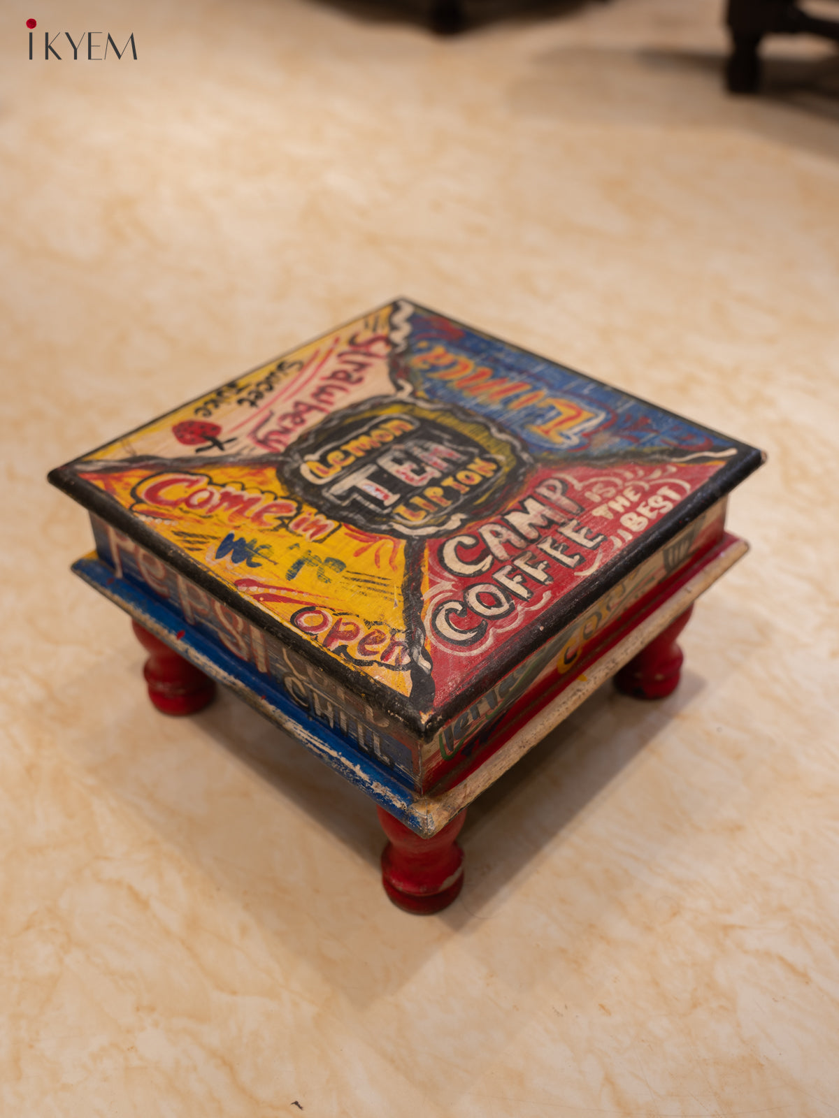 This charming stool is a nostalgic throwback to a bygone era. The square tabletop is adorned with a vibrant patchwork of vintage advertisements, showcasing iconic brands like Coca-Cola and coffee. The bold colors and retro typography create a playful and eye-catching design.
