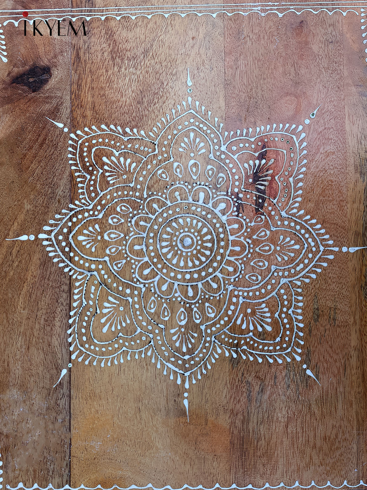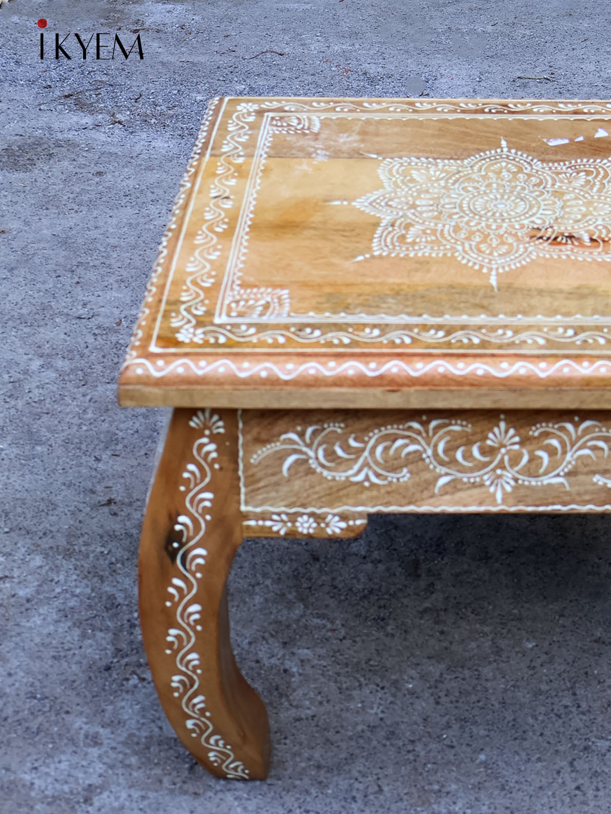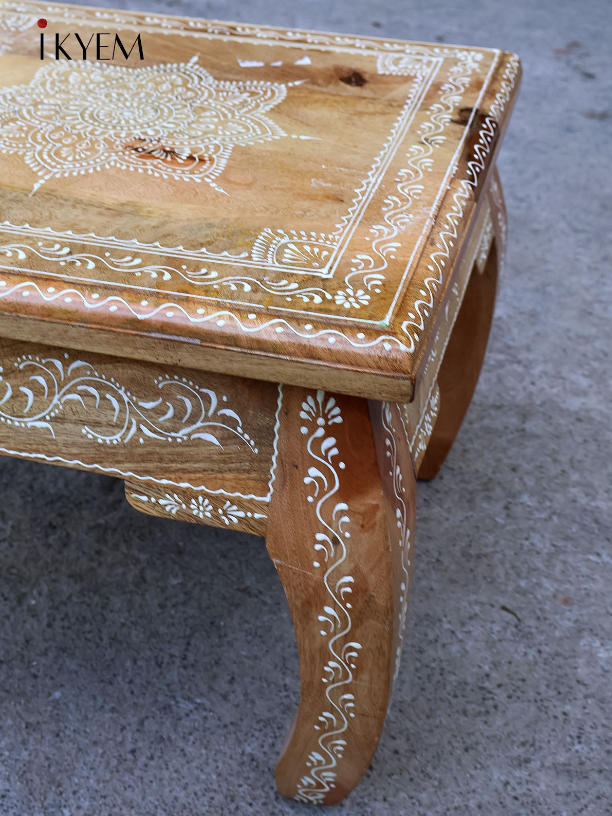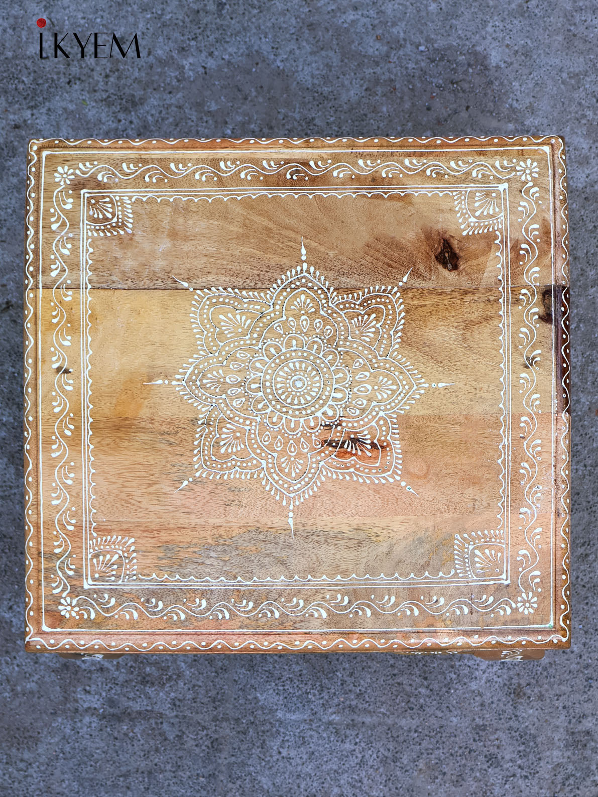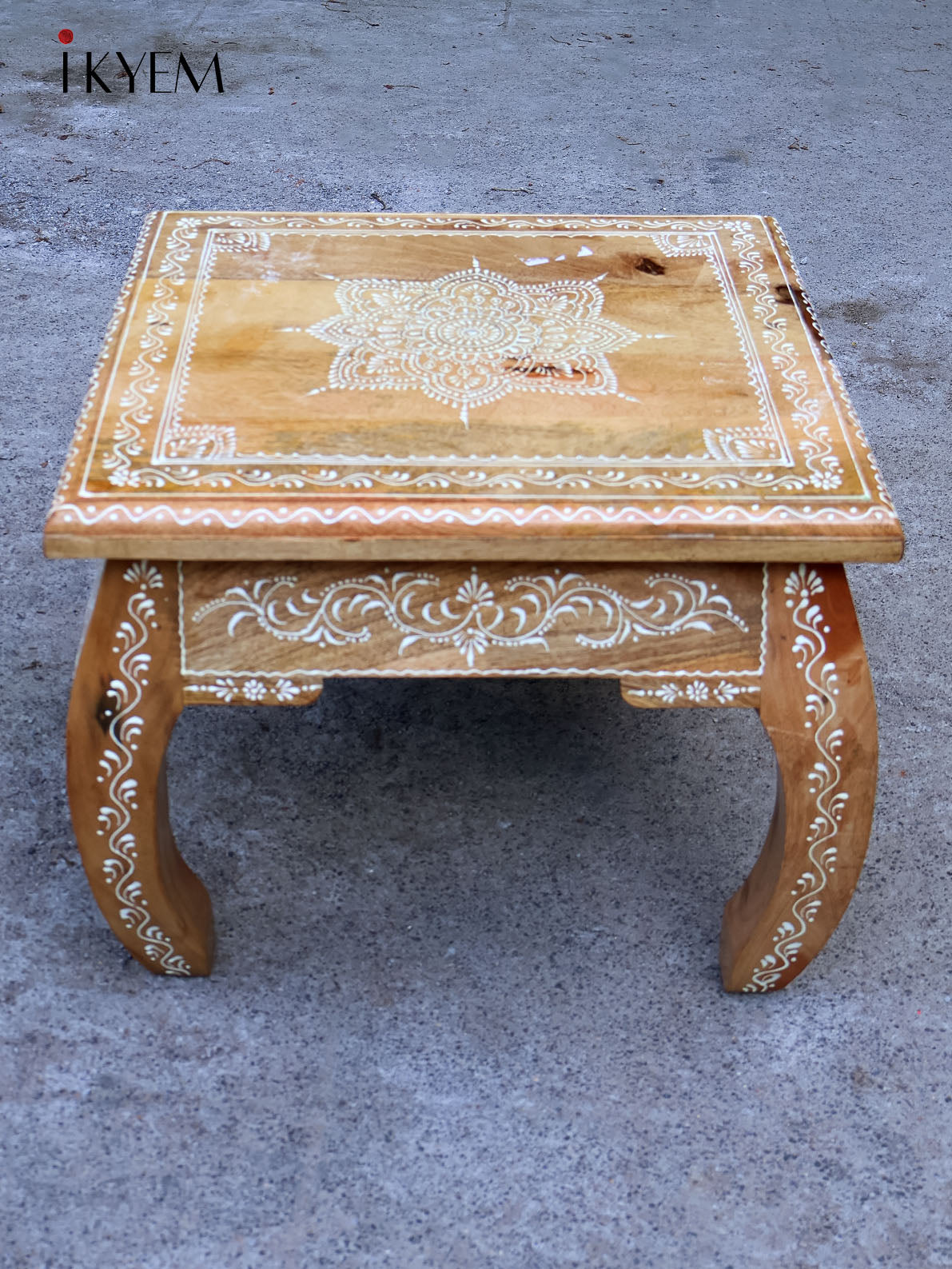 The base of the stool is equally impressive, with curved legs that add a touch of elegance and sophistication. The warm, natural wood finish enhances the beauty of the carvings and creates a timeless piece. This end table is perfect for adding a touch of luxury and style to any room in your home. It can be used as a side table or a decorative piece or as a chowki too.