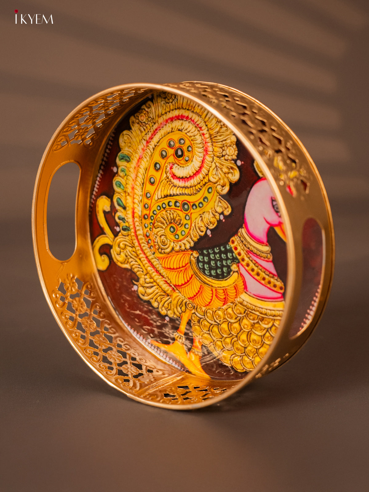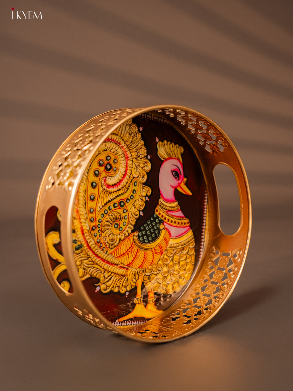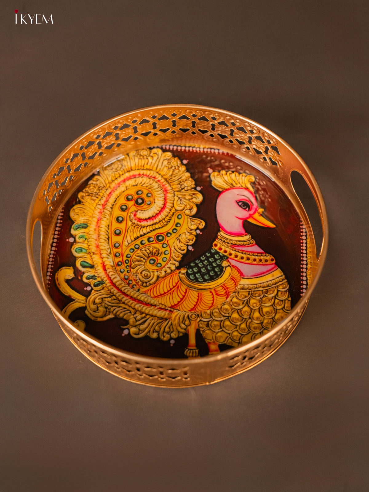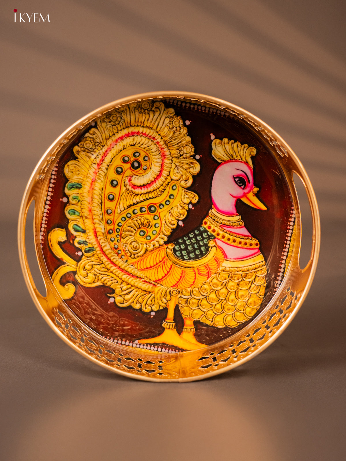 Auspicious Gold Annapakshi Printed Round Metal Tray in Maroon - KH05114