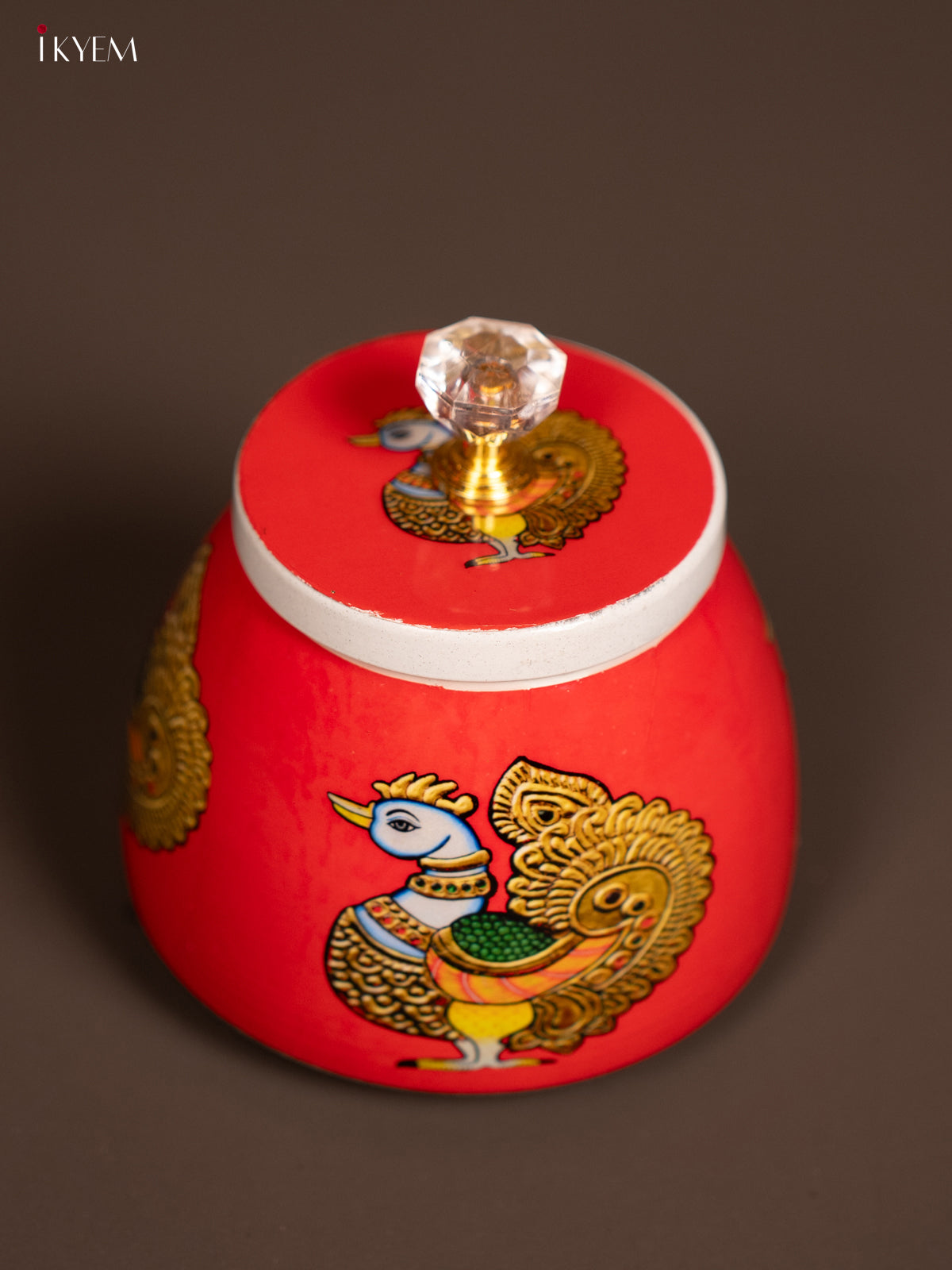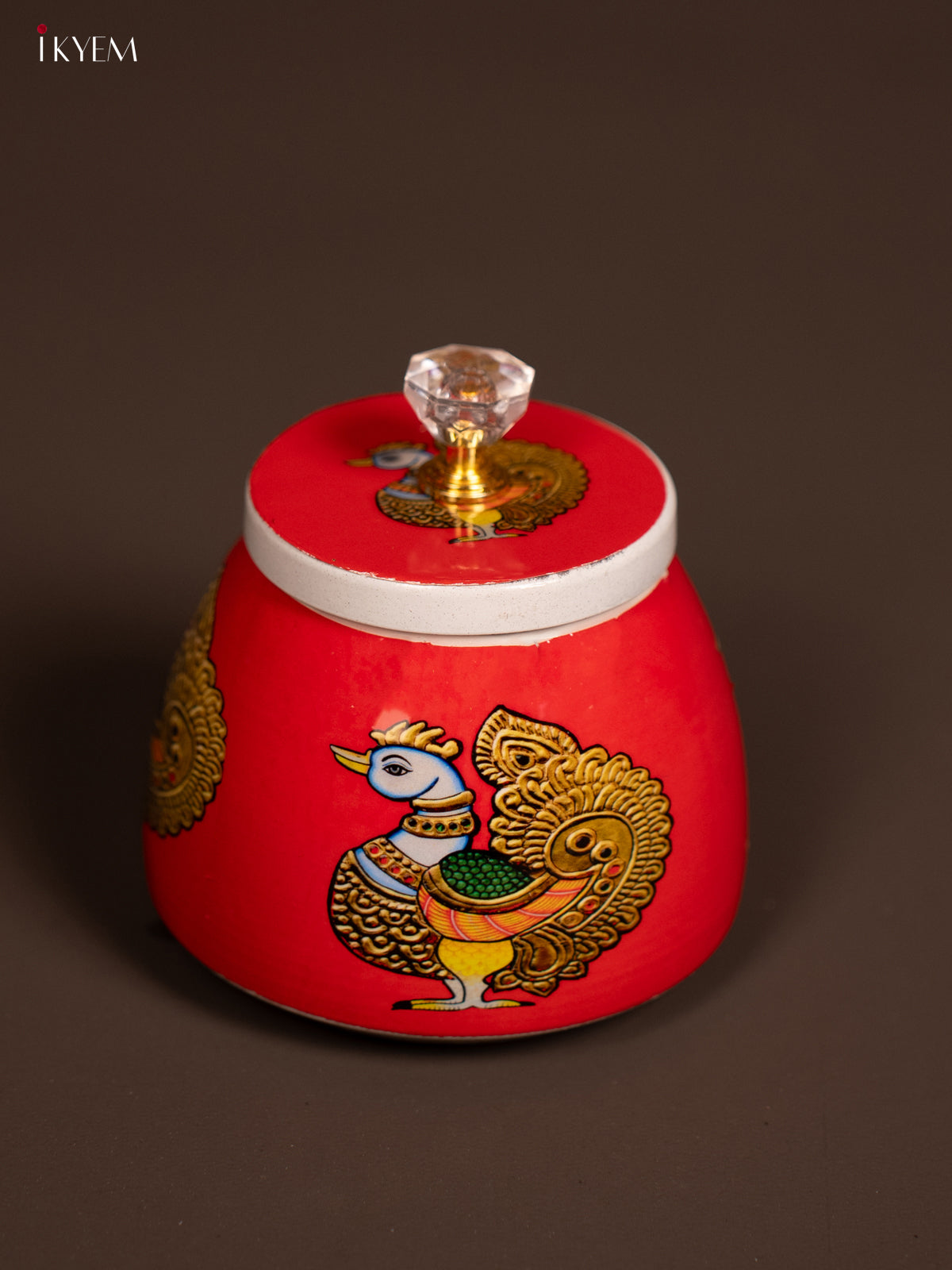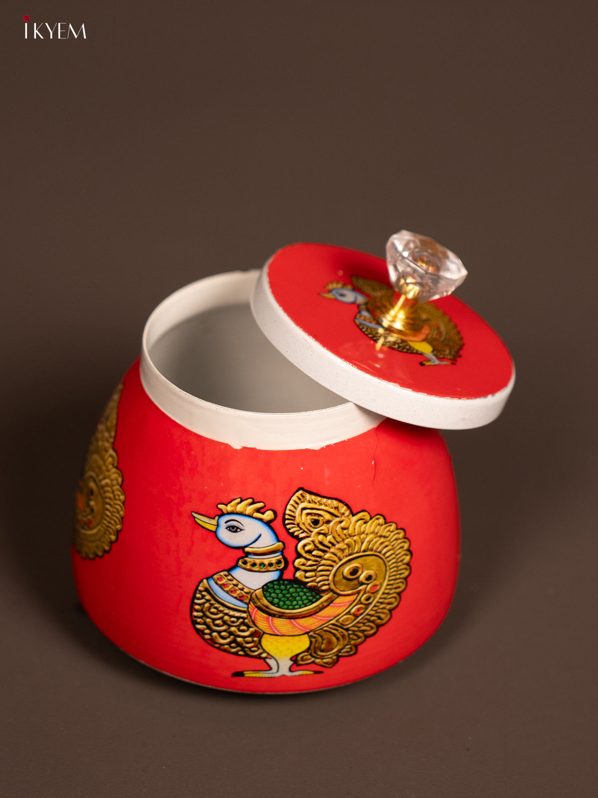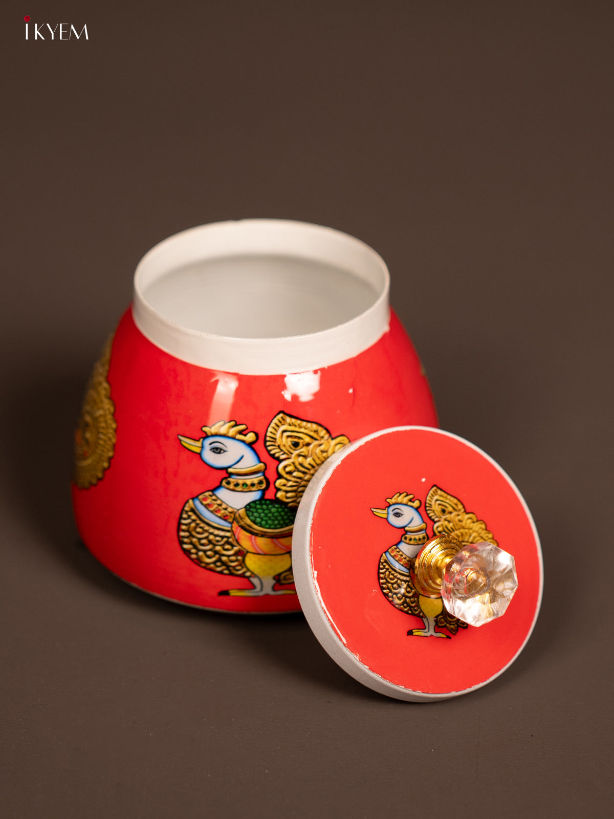 - Elevate your kitchen decor with our 4-inch Red Metal Jar featuring an adorable Annapakshi design.