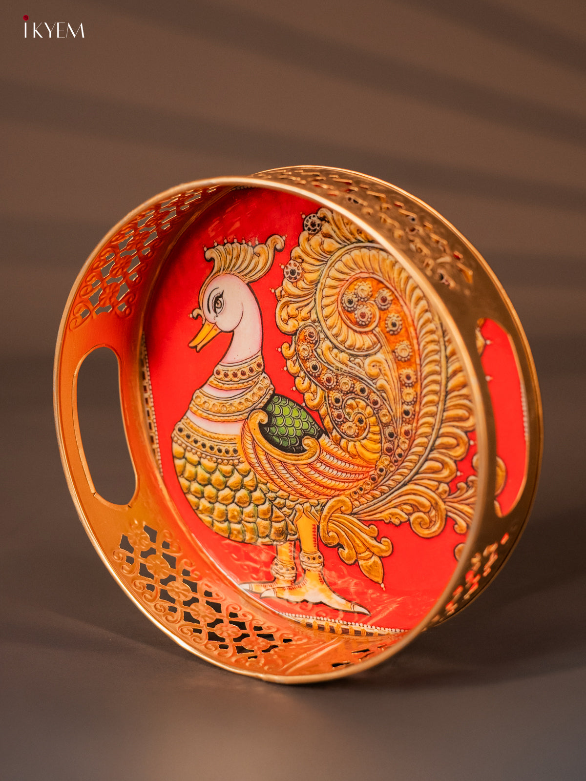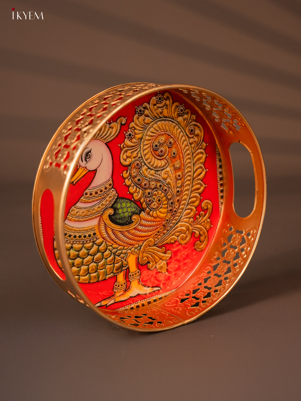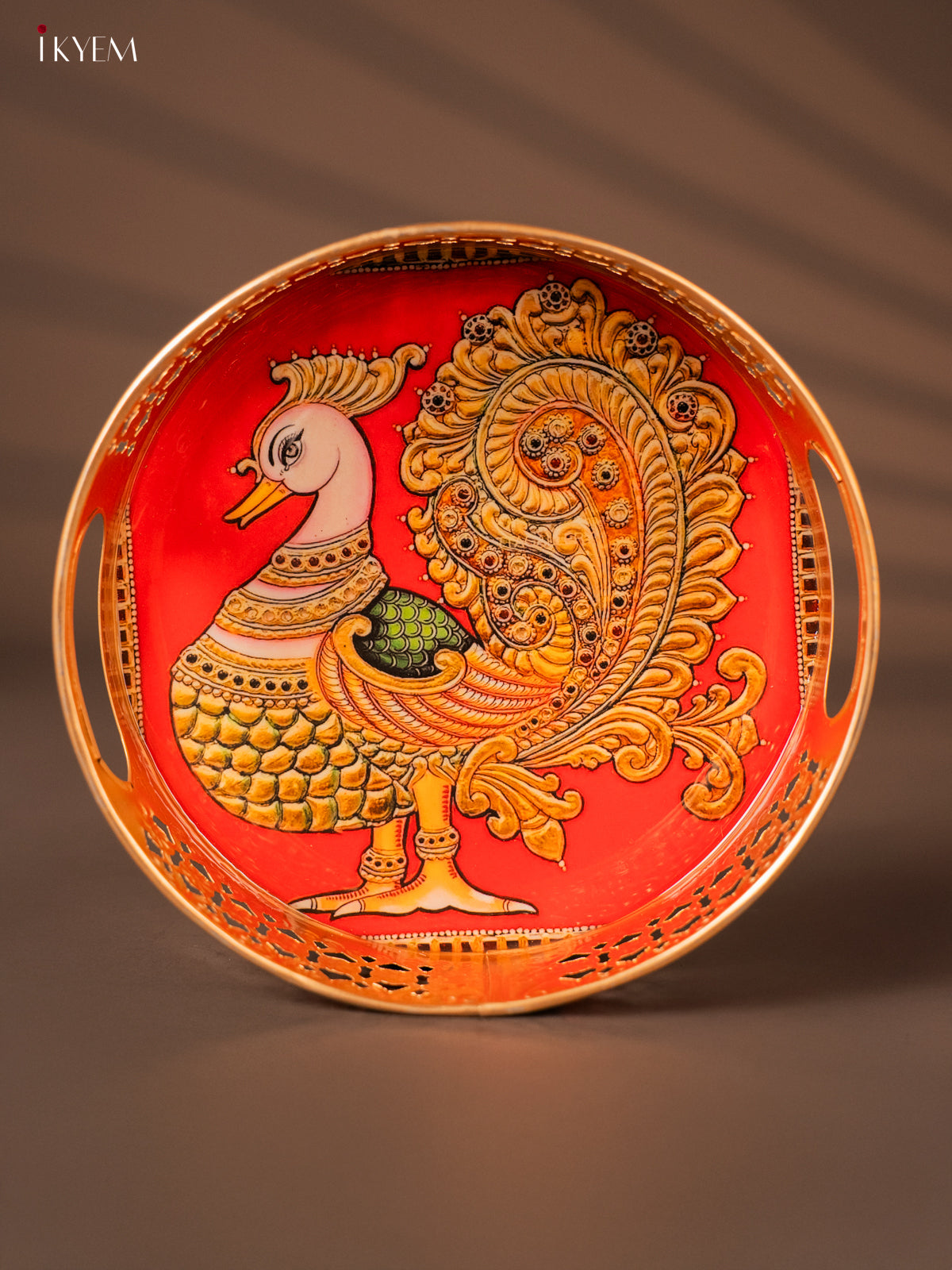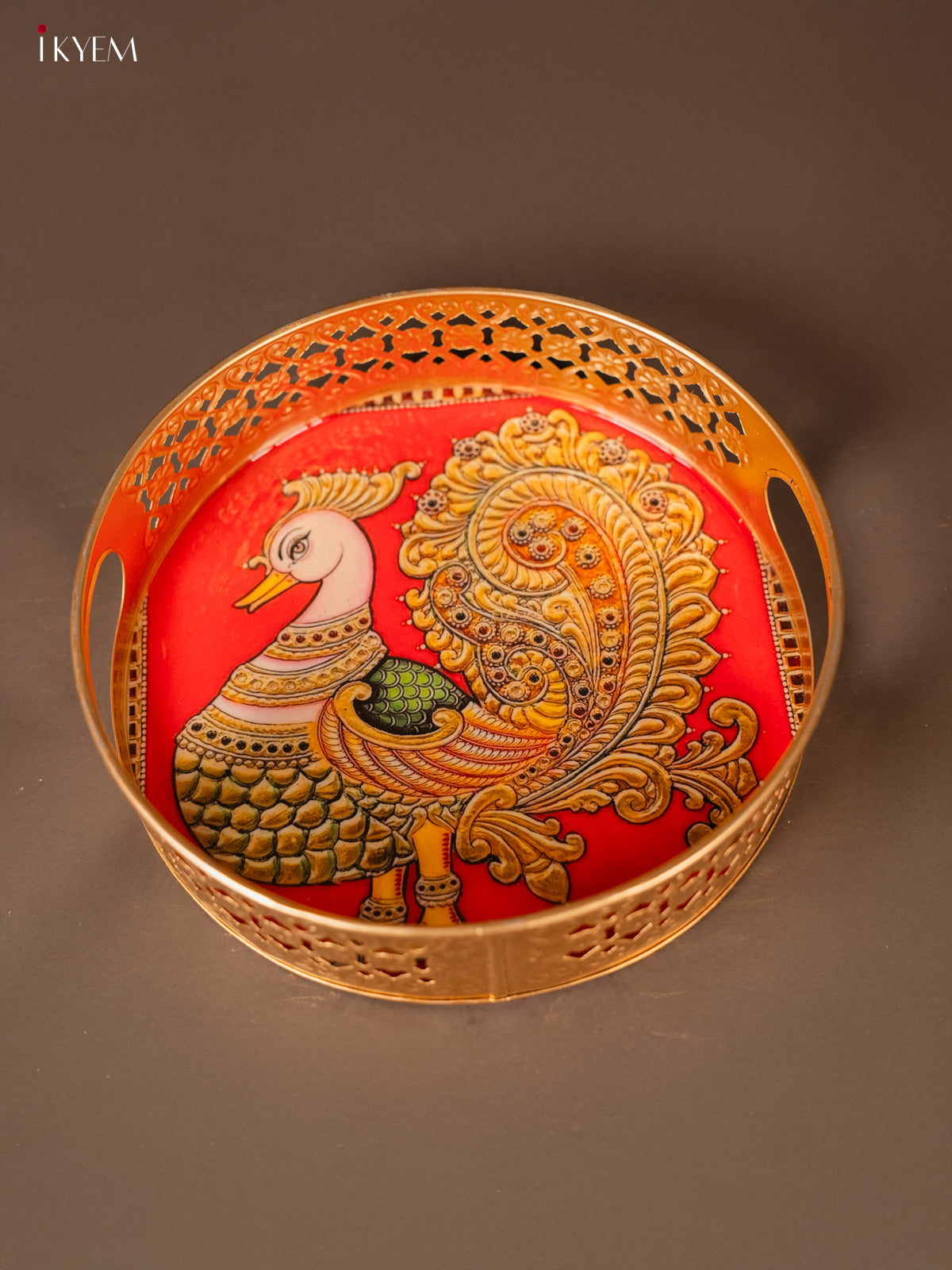 Beautiful Gold Annapakshi Printed Round Metal Tray in Red - KH05115