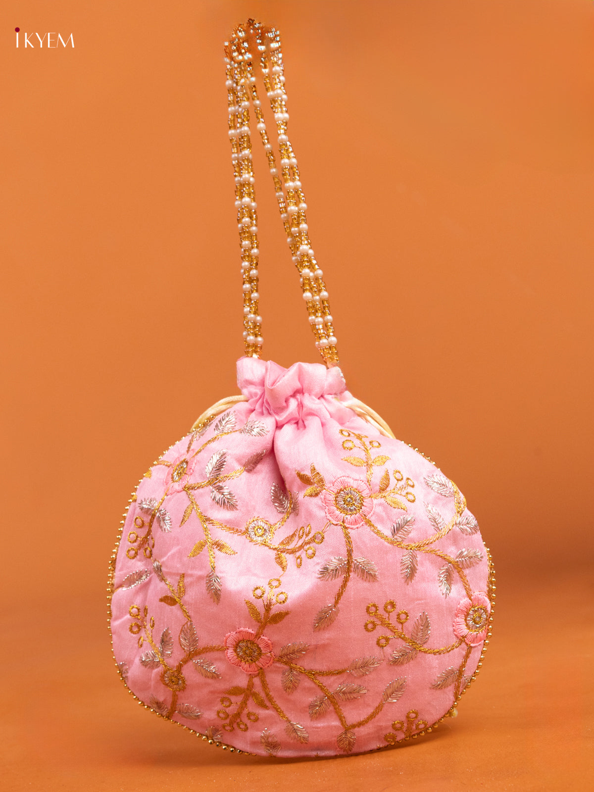 - This Baby Pink Gold Zari Potli Bag exemplifies technical mastery through its precisely rendered floral embroidery.