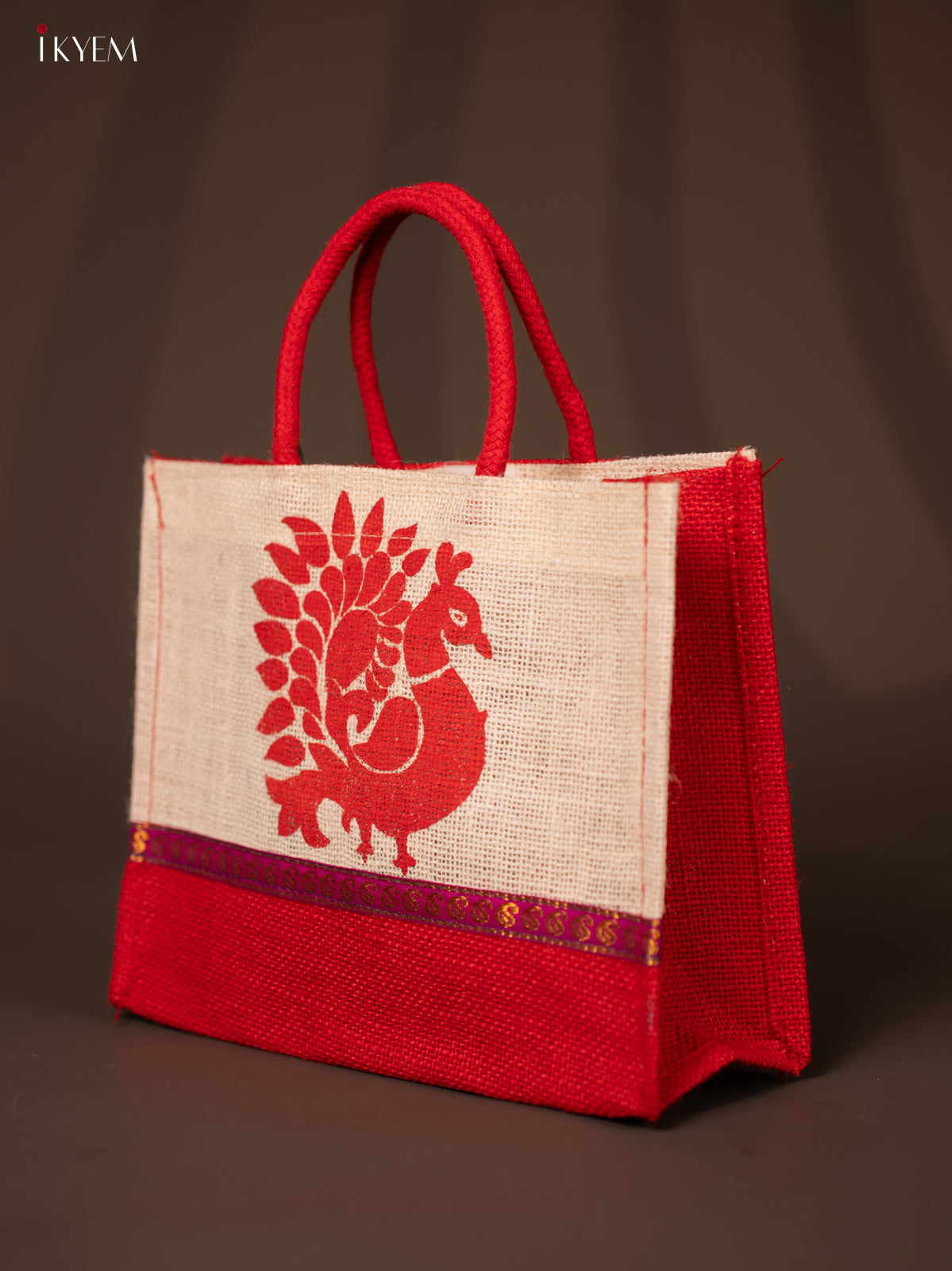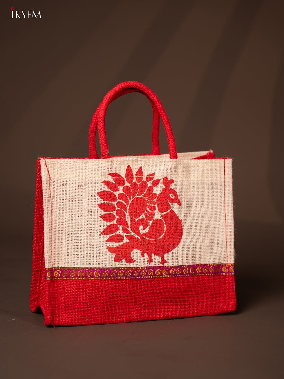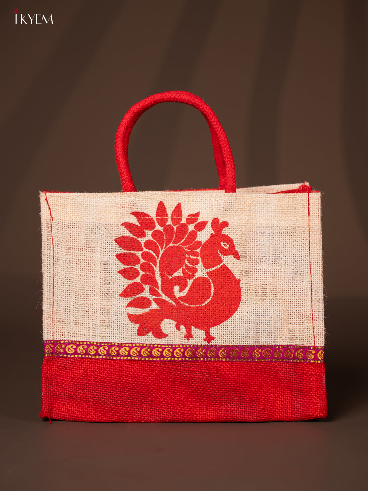 Cute Beige & Red Jute Bag With Peacock Print - KD04126