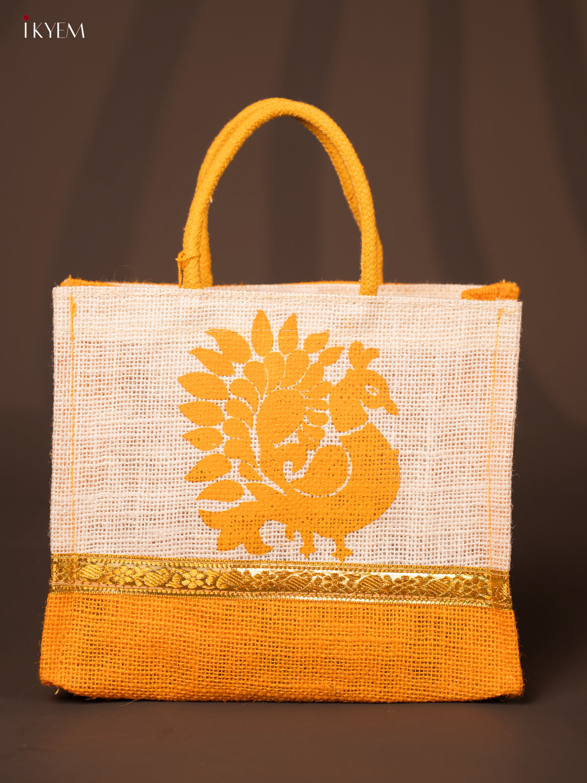 Adorable Beige & Yellow Jute Bag With Peacock Print - KG22112