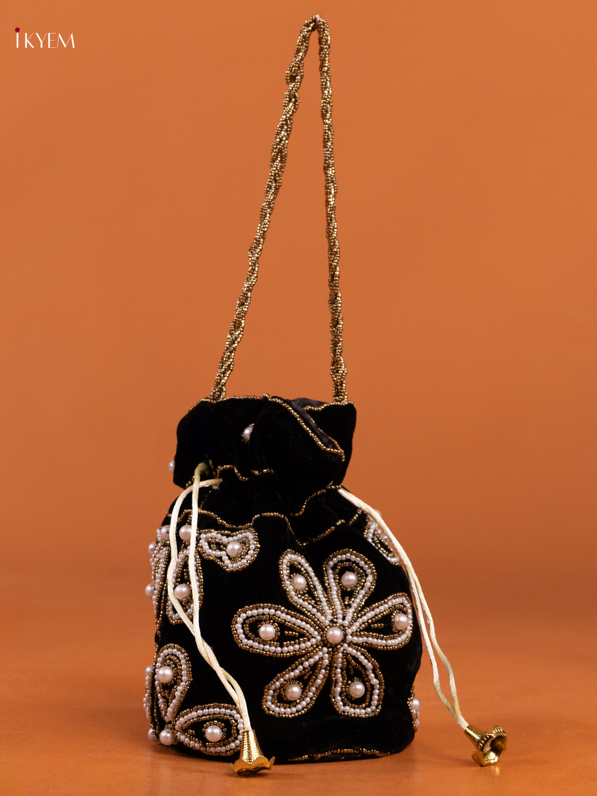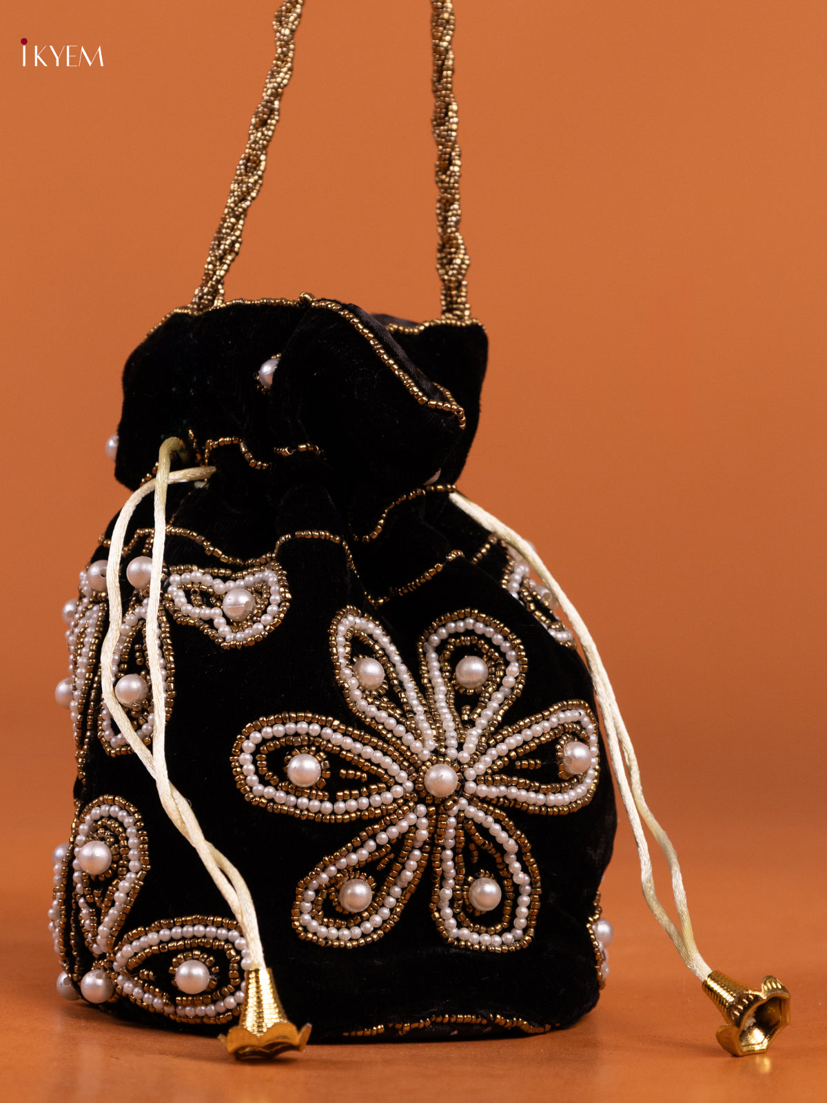 - Stunning Black velvet potli bag embellished with intricate pearl and bead embroidery.