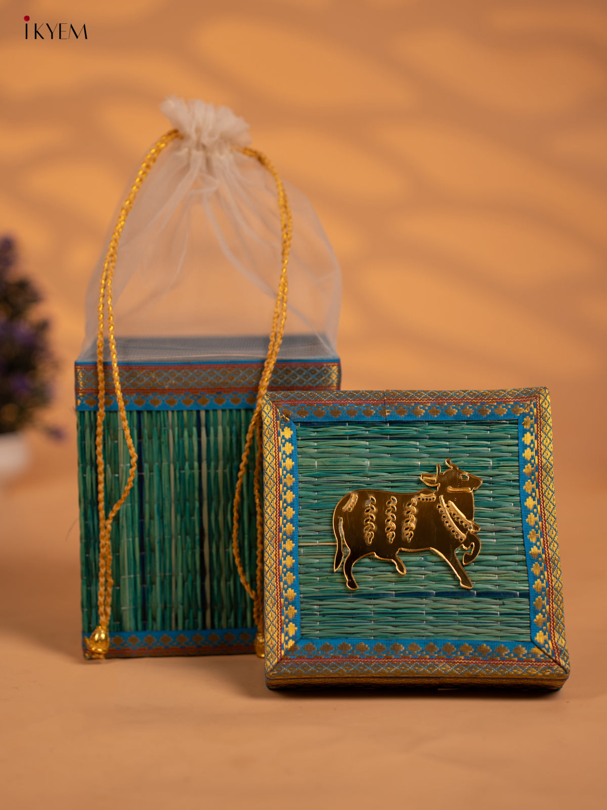 Blue Korai Gift Box with Net Potli & Cow Motif - KB17150