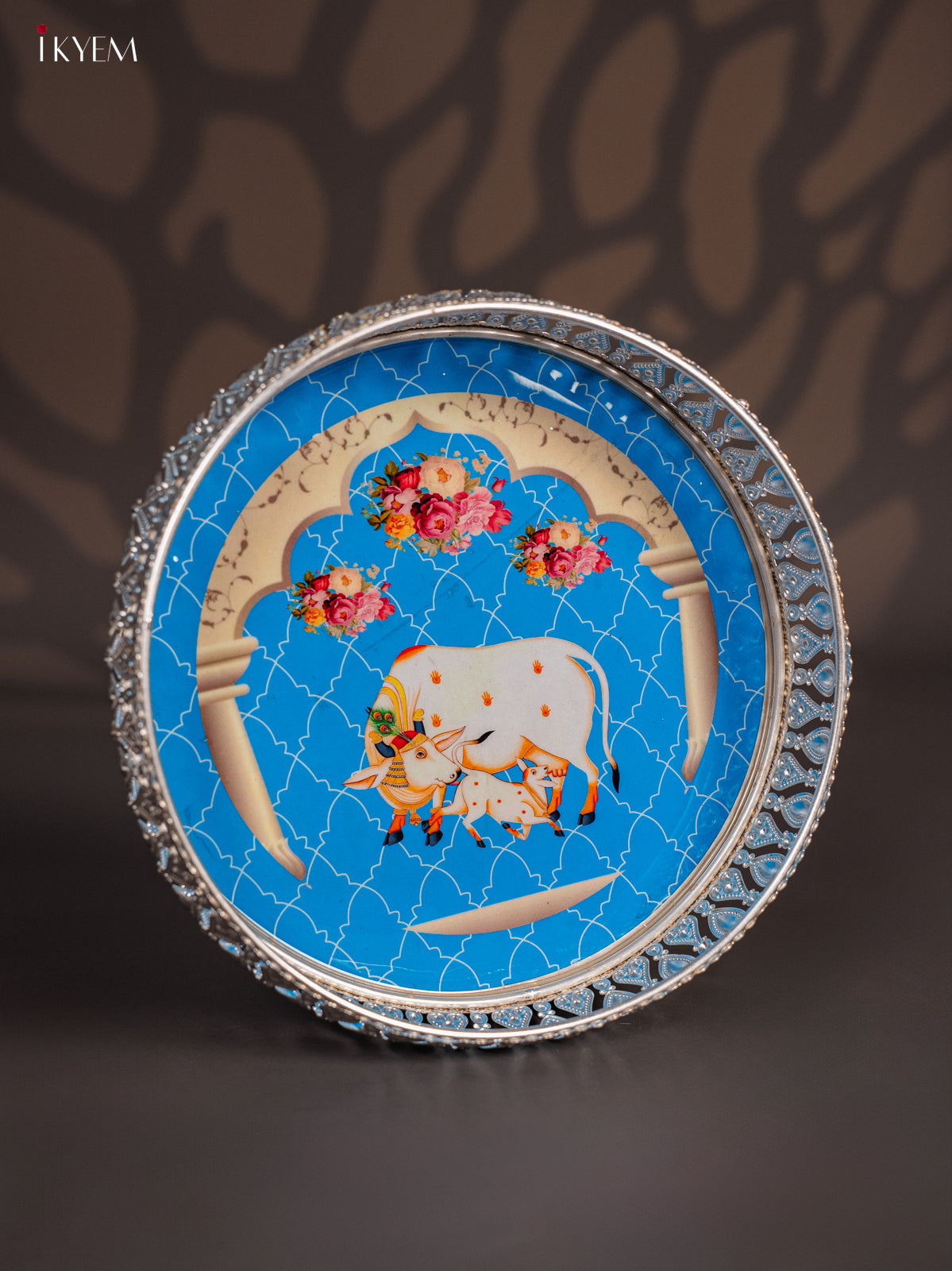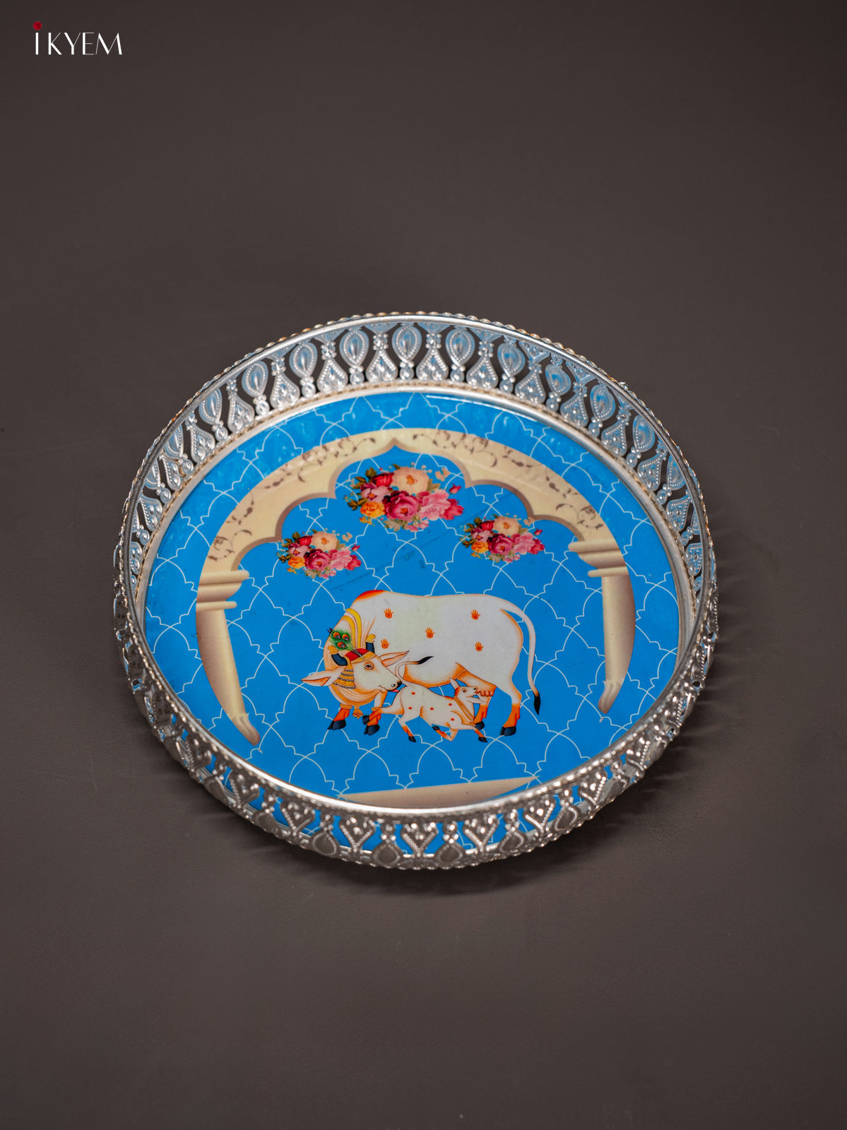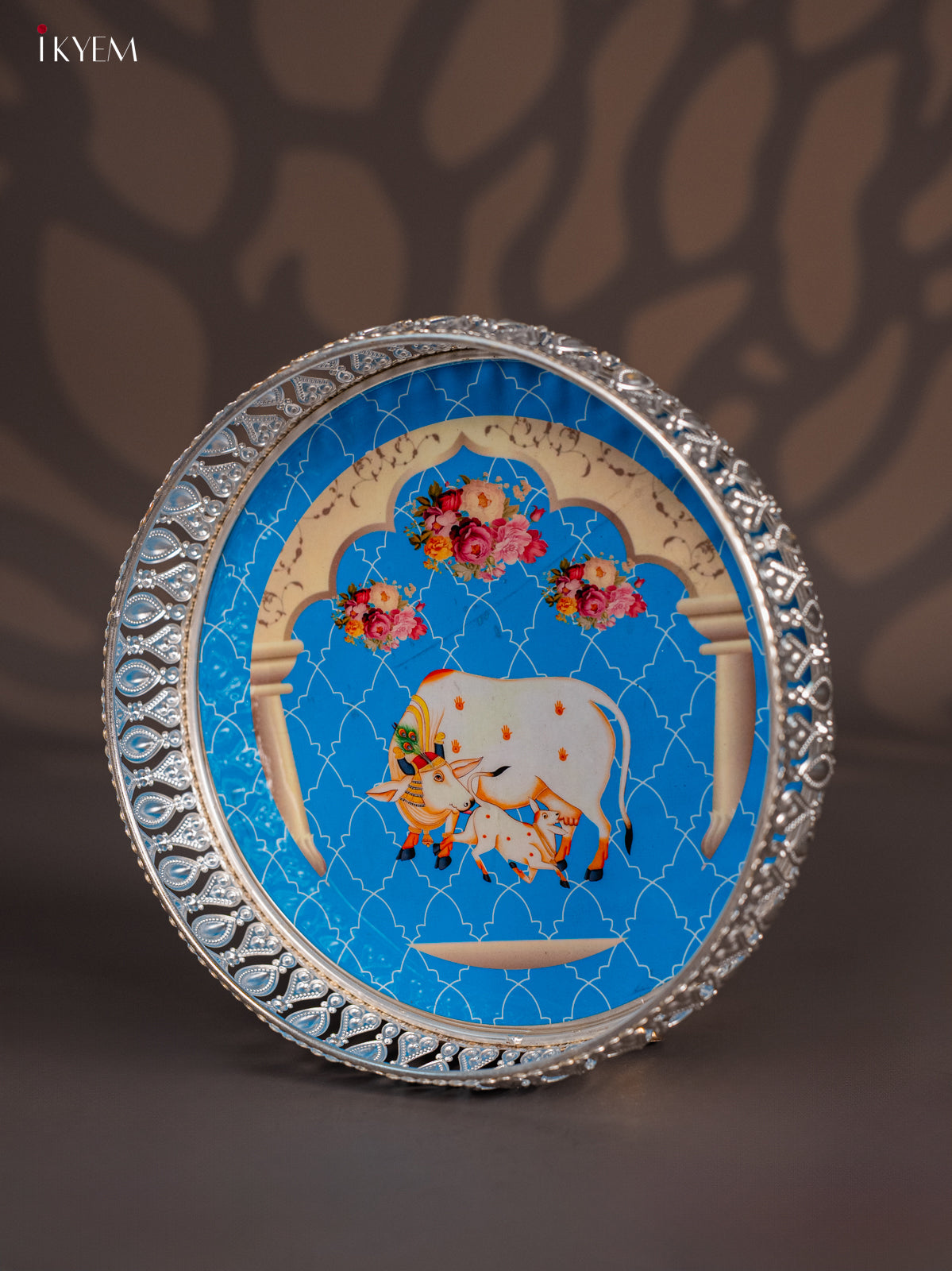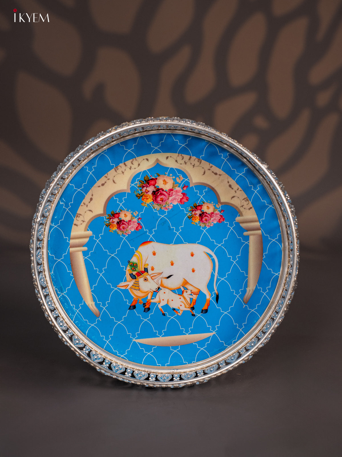 Breezy Pichwai Cow & Calf Printed Blue German Silver Tray (8 Inch) - KI10122