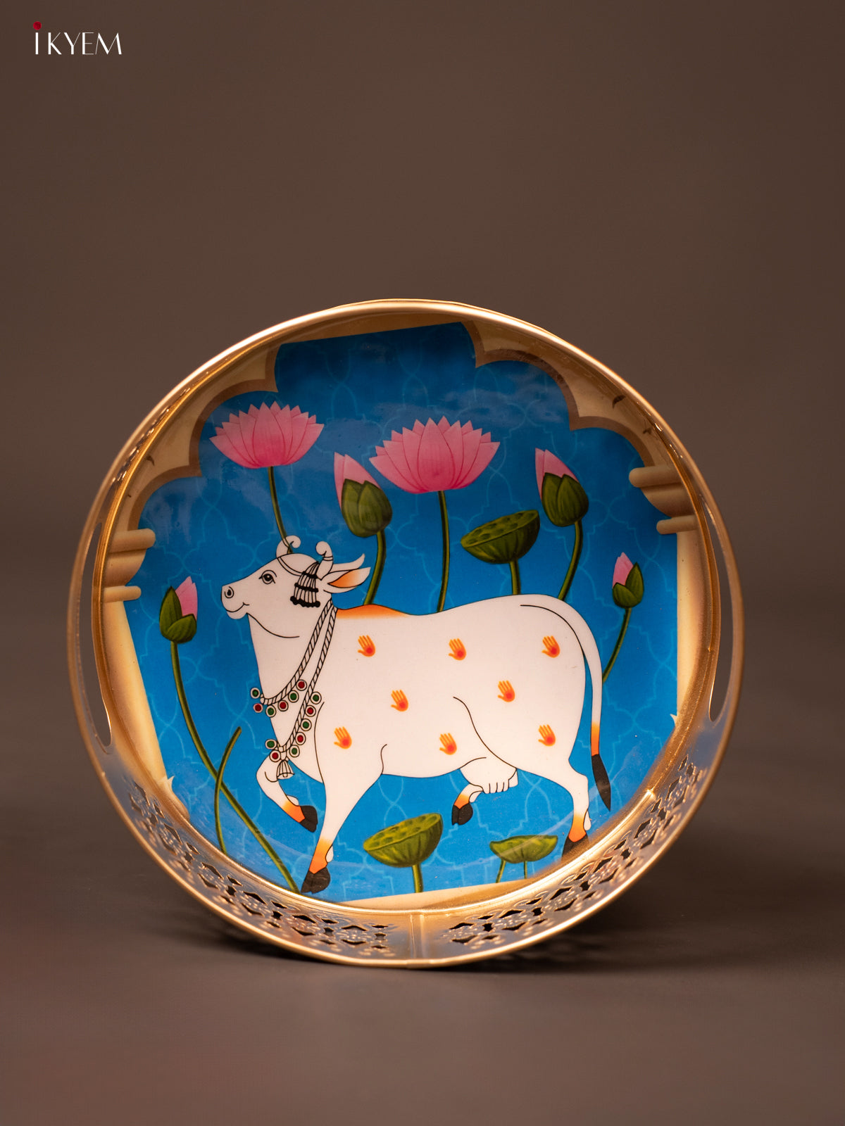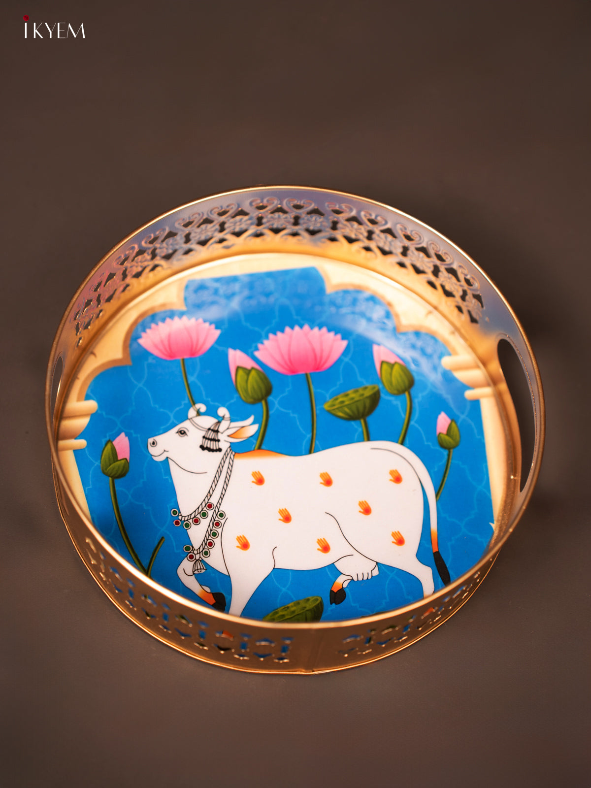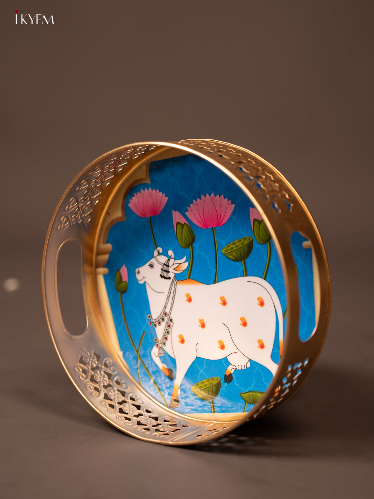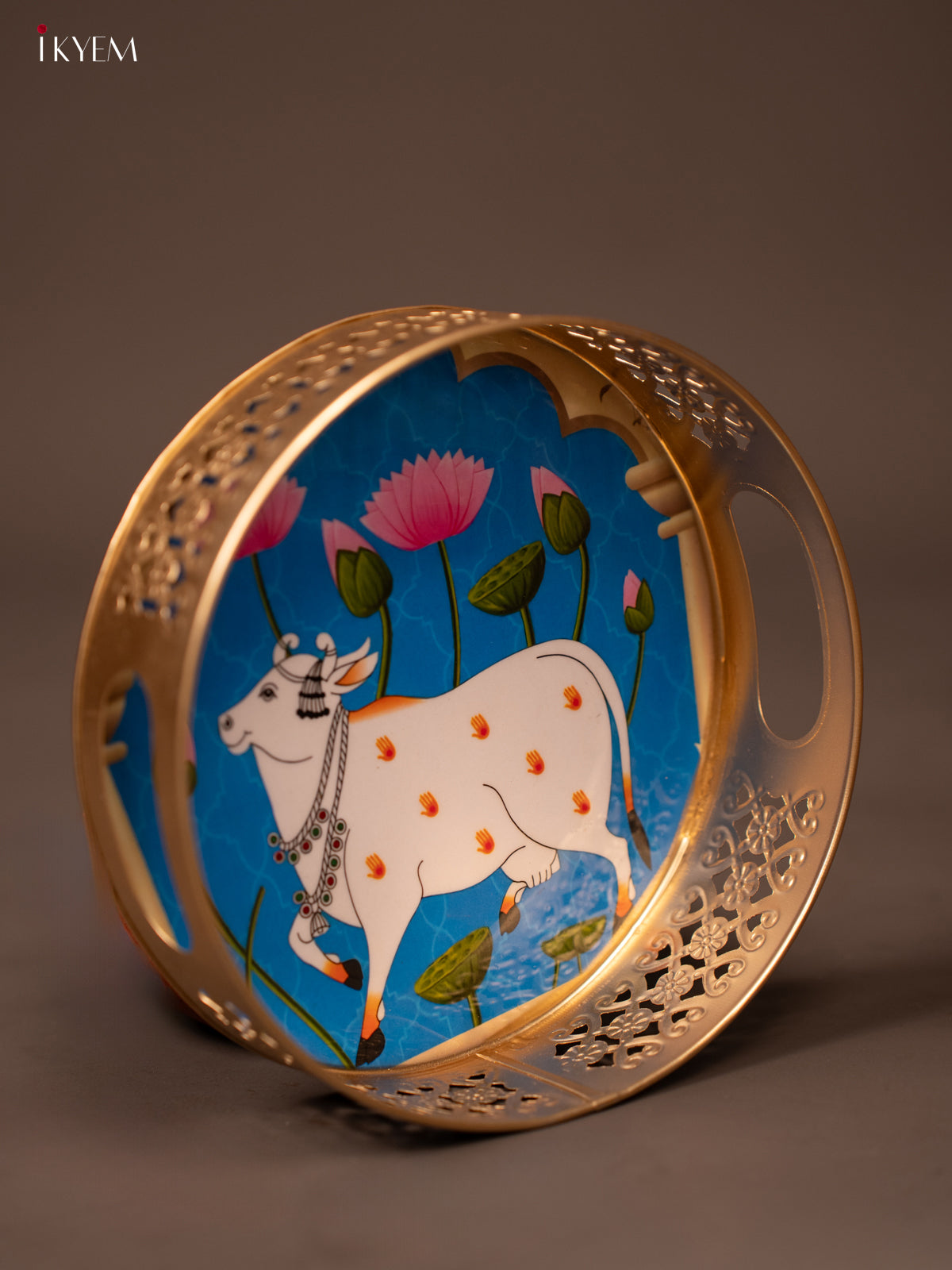 - This 8-inch Metal Digital Pichwai Round Tray in blue, features a beautiful Pichwai cow design.